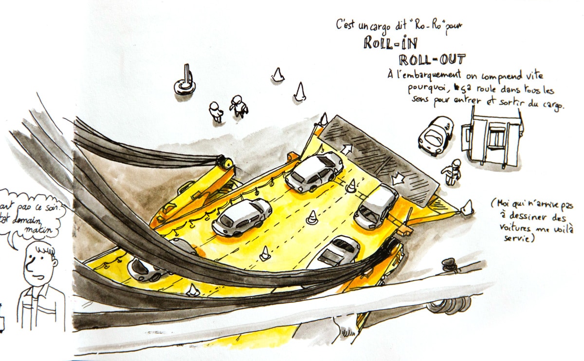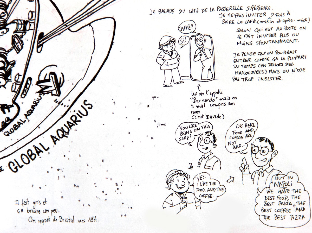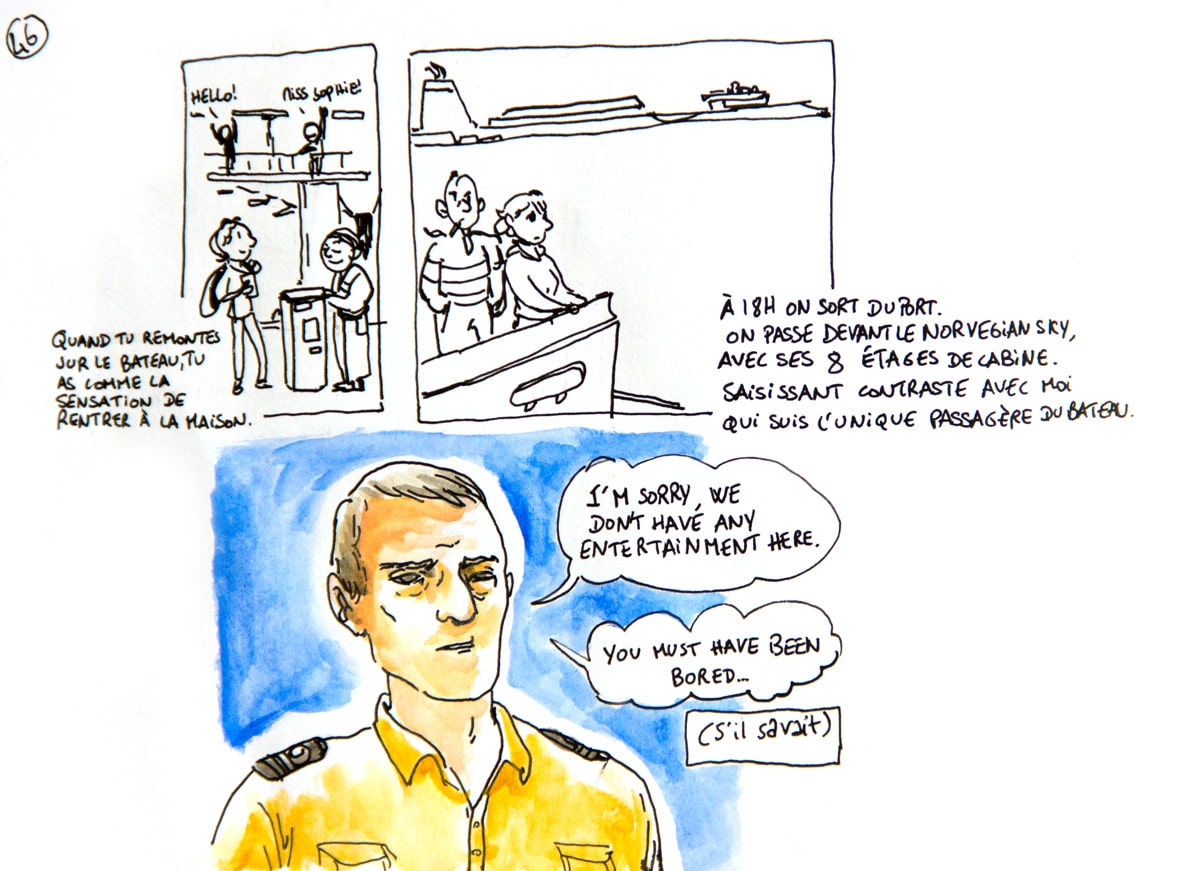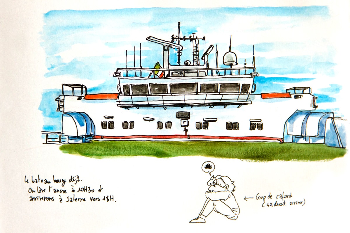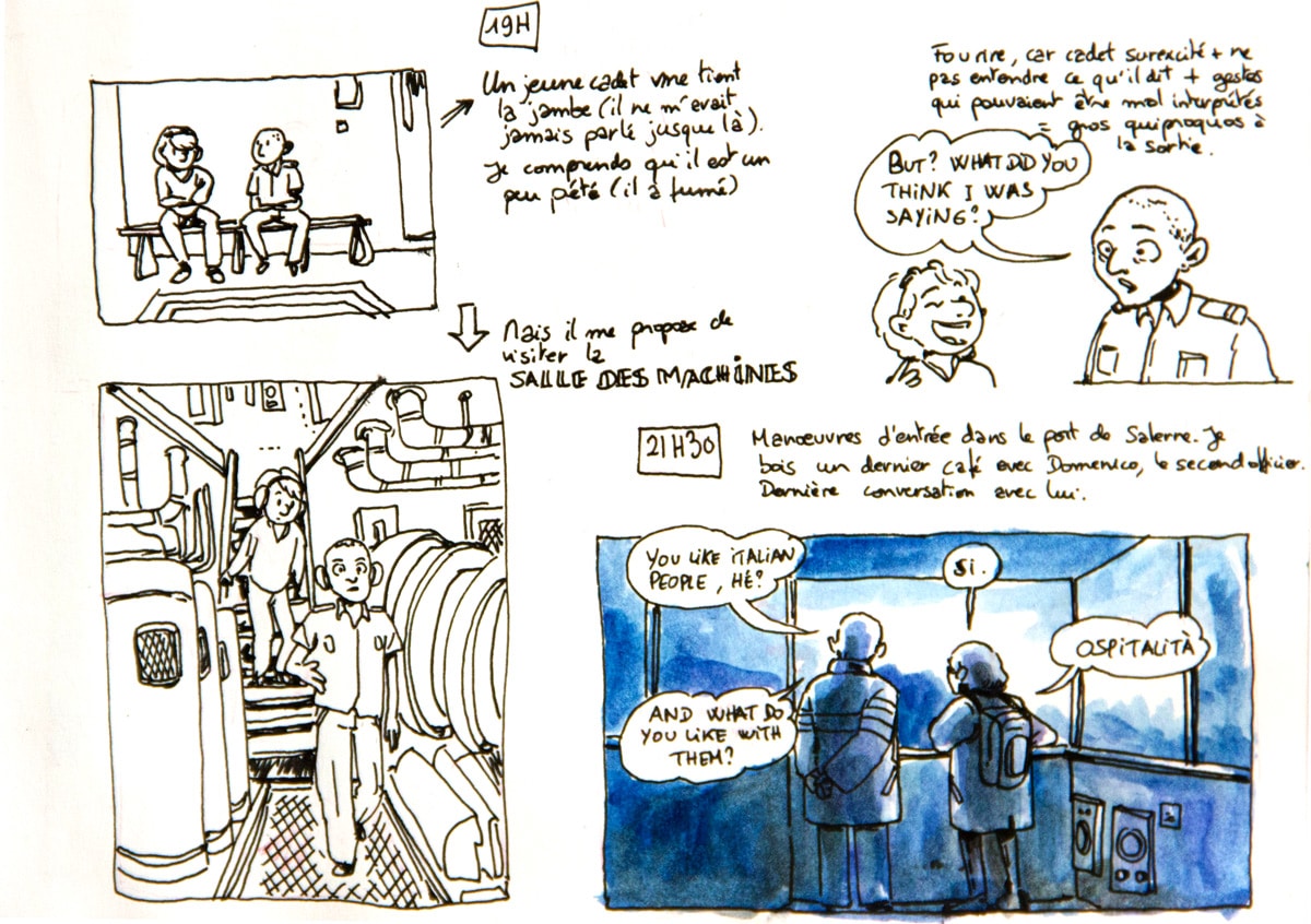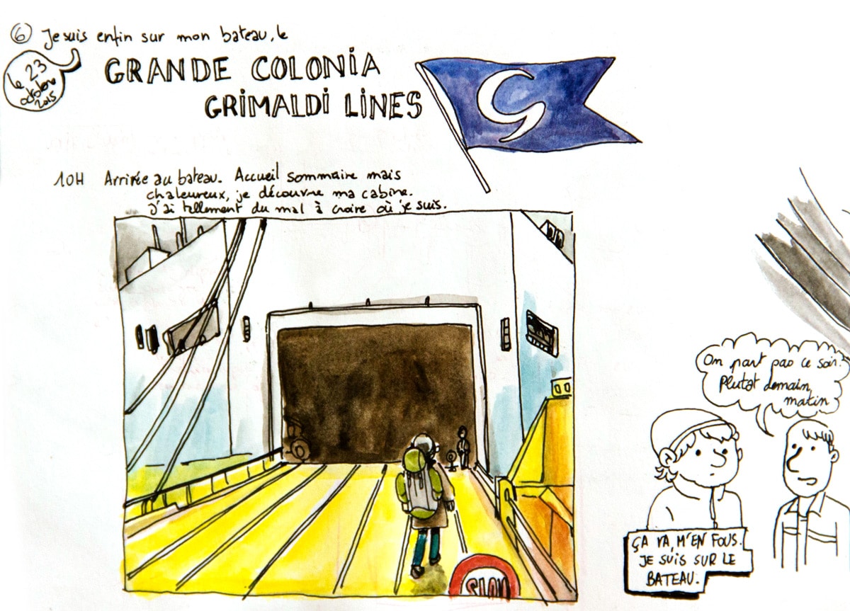 Si j’ai embarqué à bord du bateau Grande Colonia avec la ferme intention de dessiner (et un bon tiers de mon paquetage composé d’affaires de dessin, je ne plaisante pas), je n’avais pas trop prévu de le faire sous la forme d’un carnet de voyage. Ou en tout cas de le présenter comme tel, avec un mélange de textes, de dessin d’observation et de petites cases de BD. A bord, vu que mon cadre changeait peu, il était finalement difficile de ne me contenter que de croquis du bateau; c’est ainsi devenu une sorte de carnet de bord, un peu foutraque, un peu drôle parfois, pour garder pour moi surtout un trace de cette drôle d’expérience.