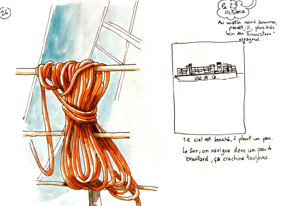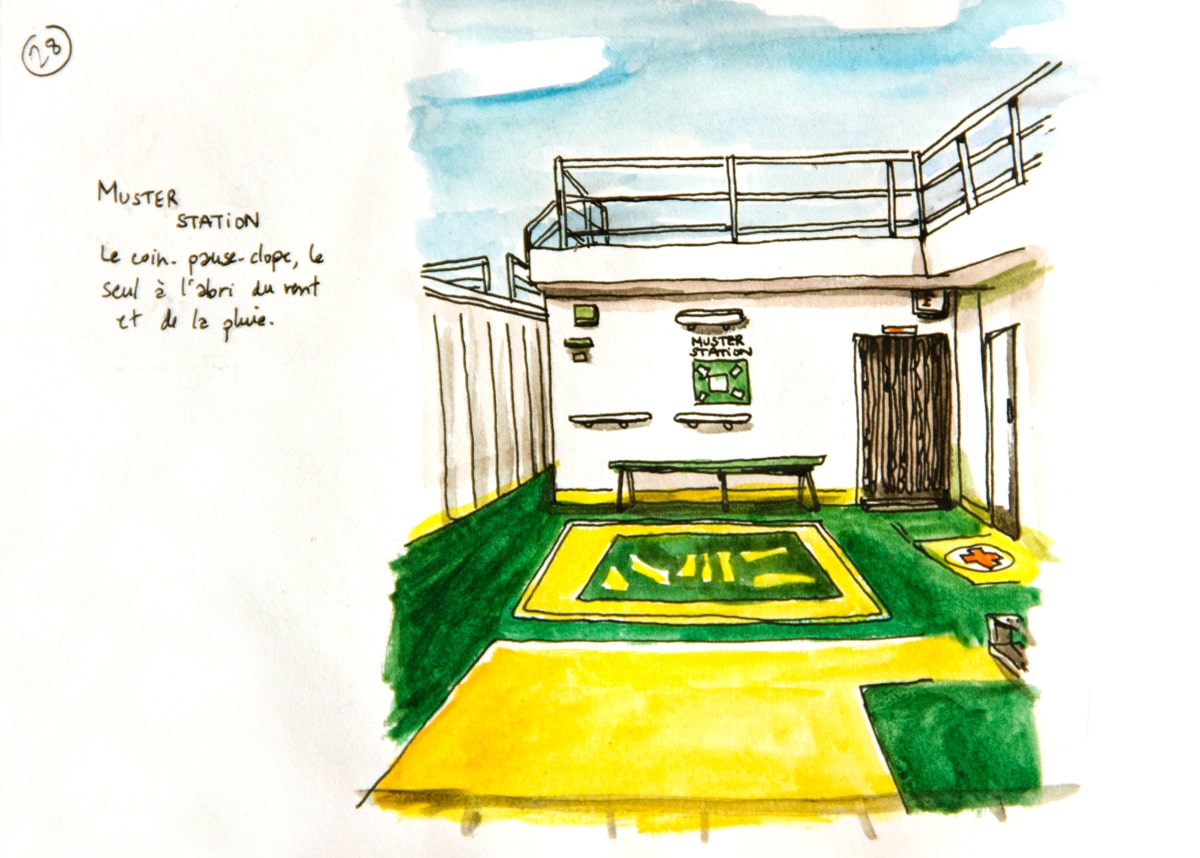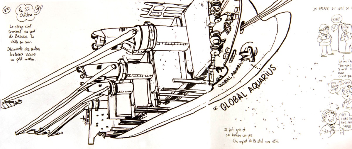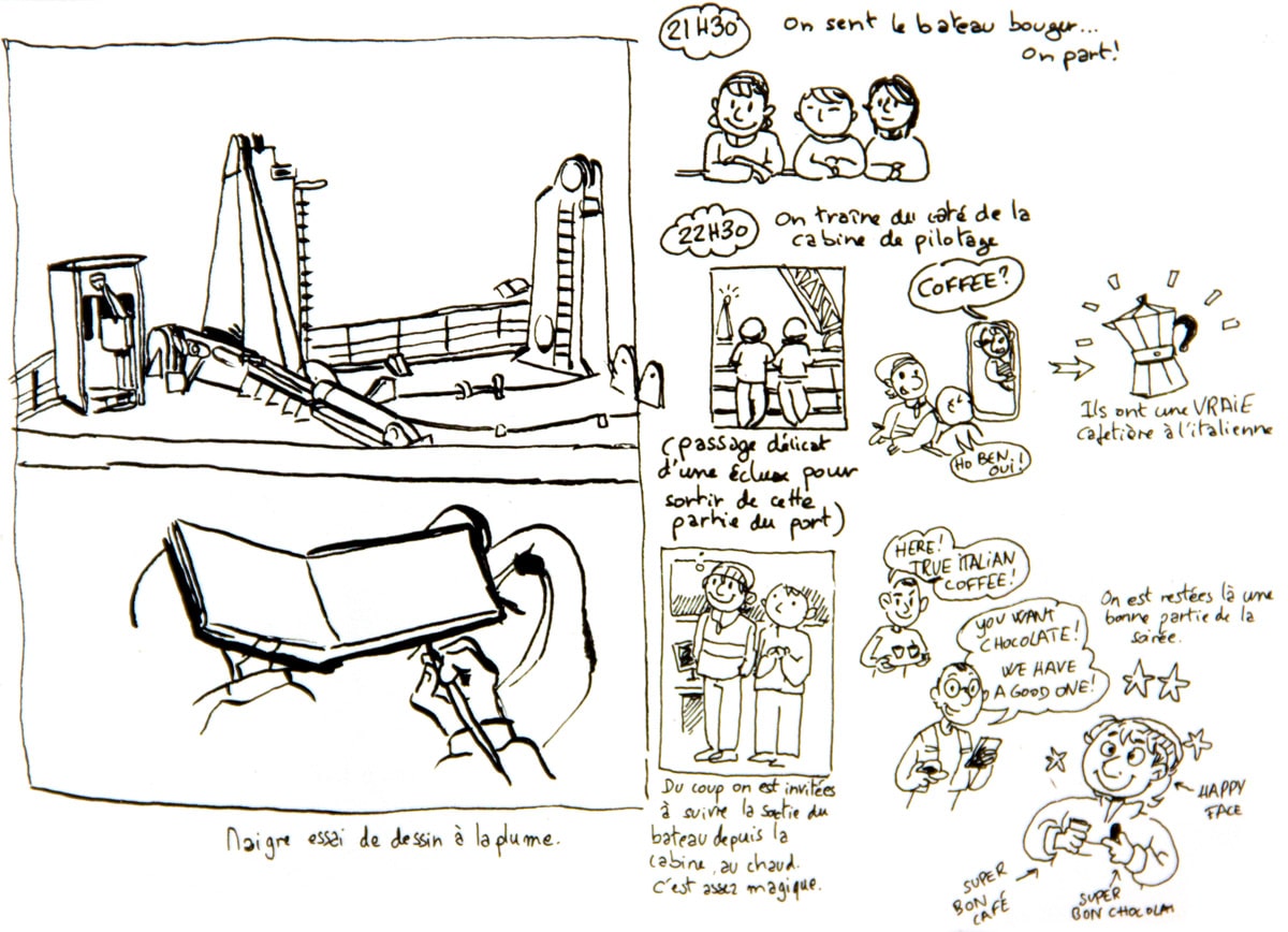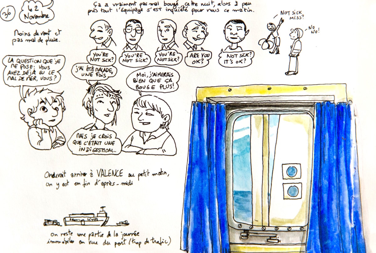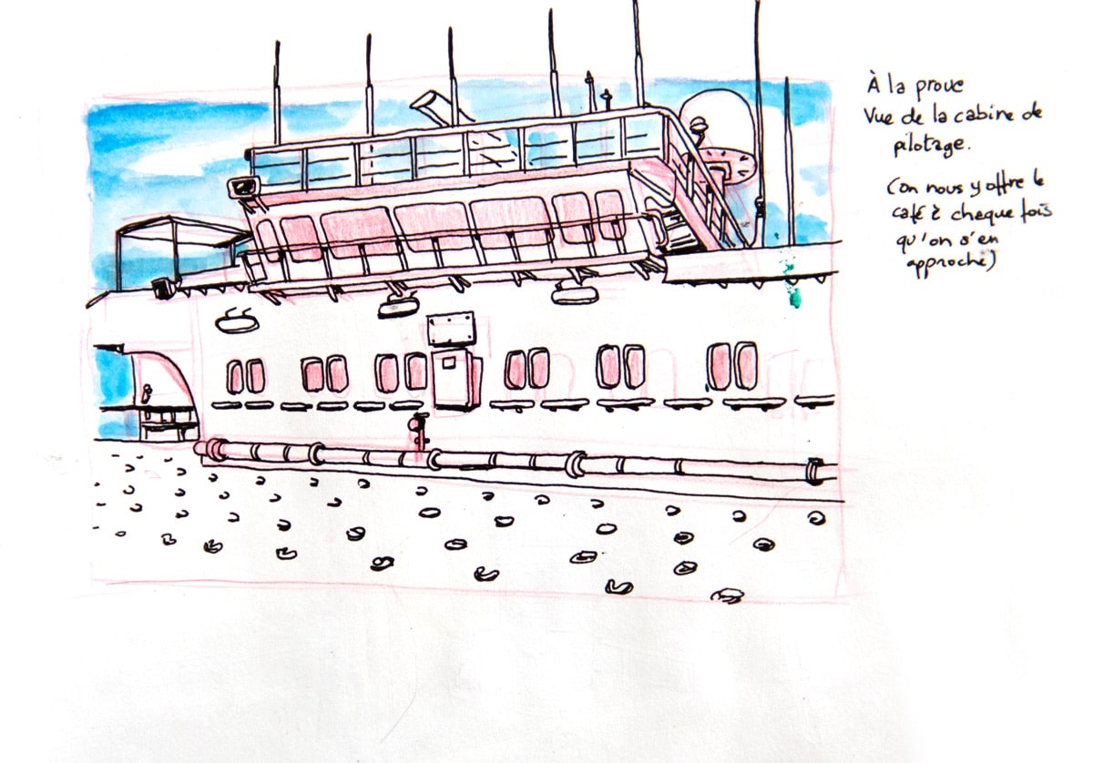 Si j’ai embarqué à bord du bateau Grande Colonia avec la ferme intention de dessiner (et un bon tiers de mon paquetage composé d’affaires de dessin, je ne plaisante pas), je n’avais pas trop prévu de le faire sous la forme d’un carnet de voyage. Ou en tout cas de le présenter comme tel, avec un mélange de textes, de dessin d’observation et de petites cases de BD. A bord, vu que mon cadre changeait peu, il était finalement difficile de ne me contenter que de croquis du bateau; c’est ainsi devenu une sorte de carnet de bord, un peu foutraque, un peu drôle parfois, pour garder pour moi surtout un trace de cette drôle d’expérience.