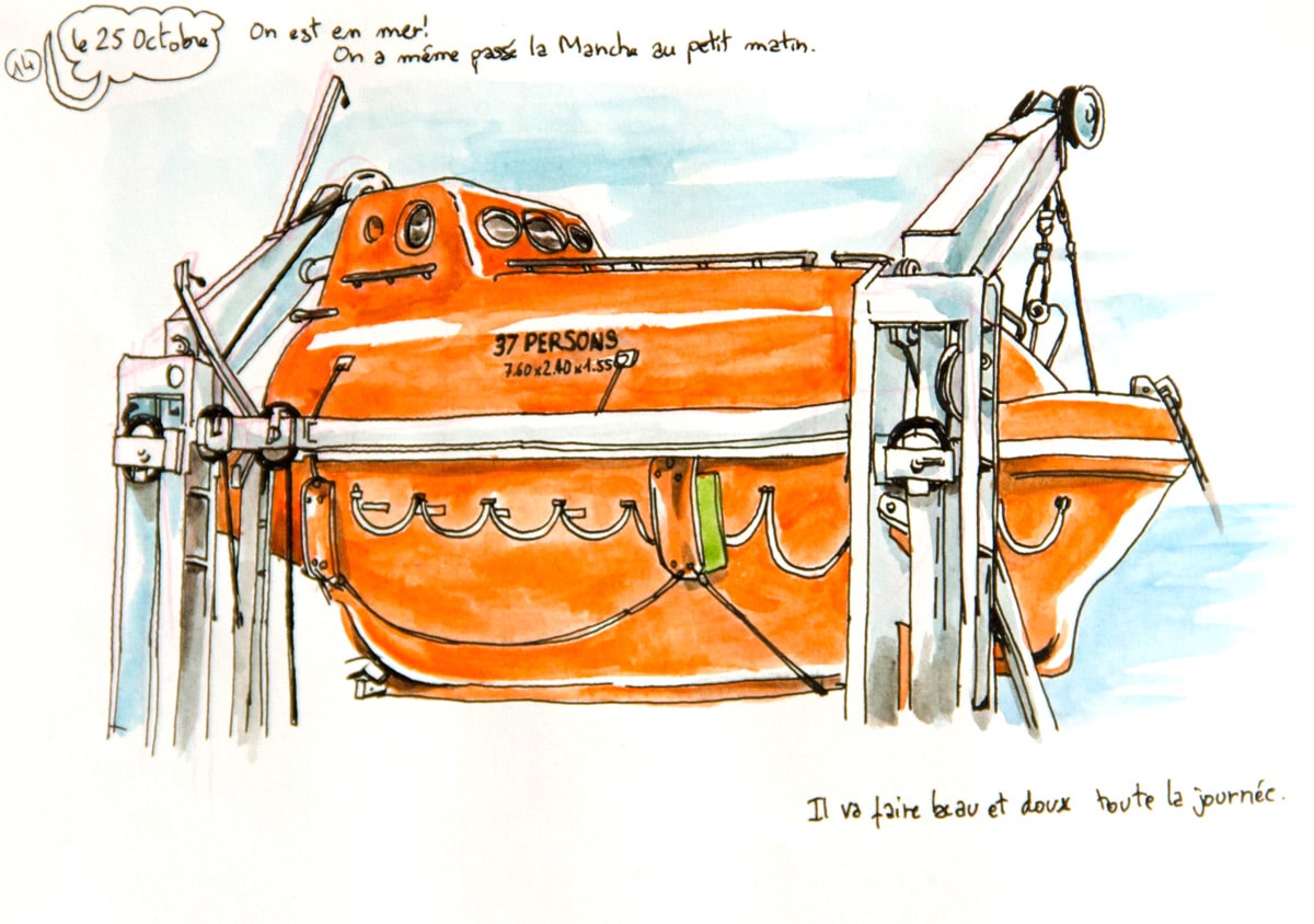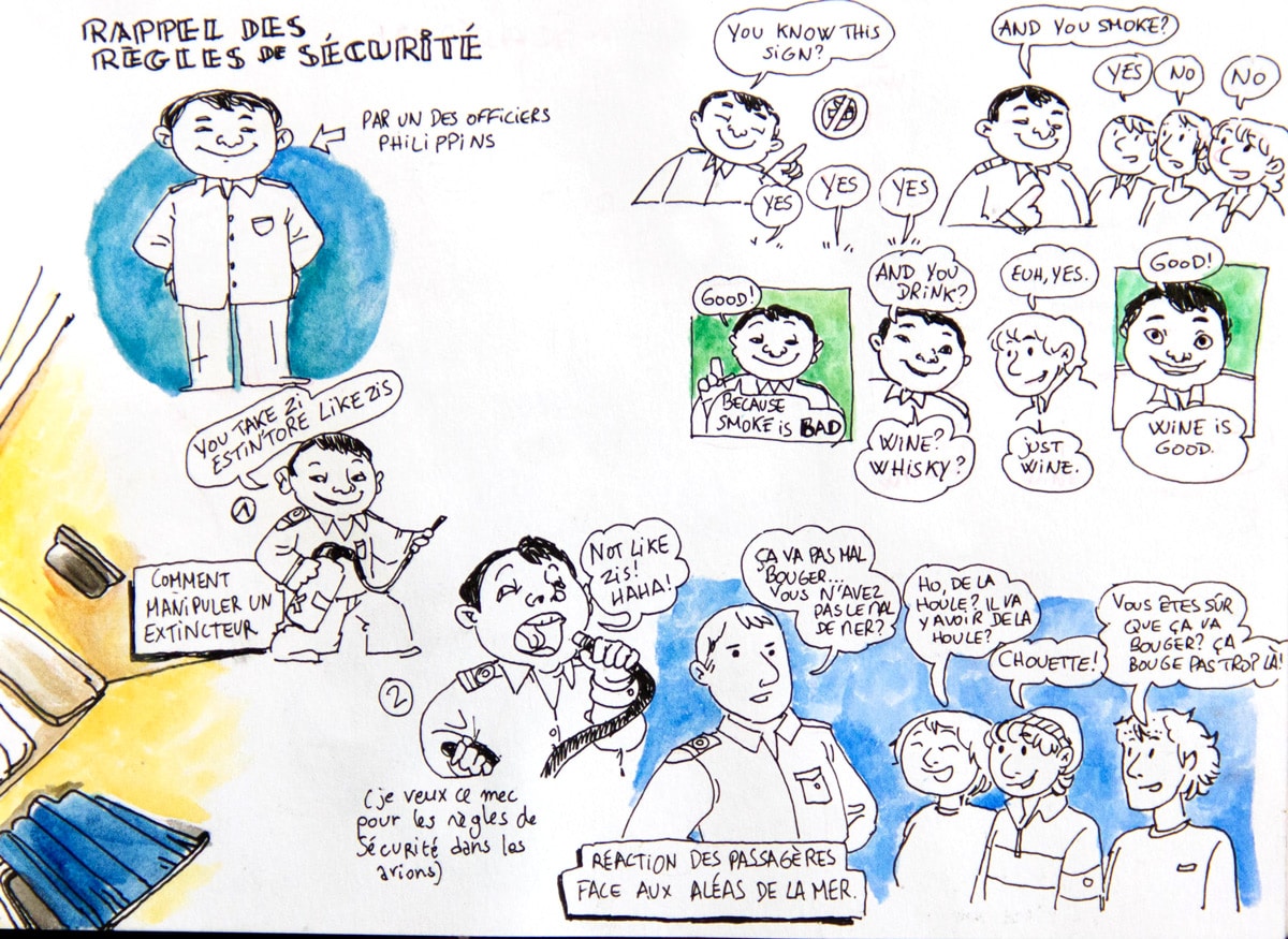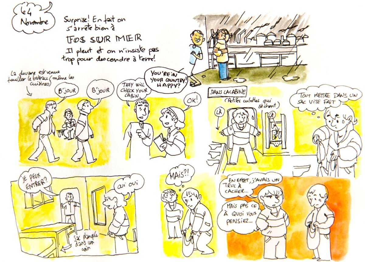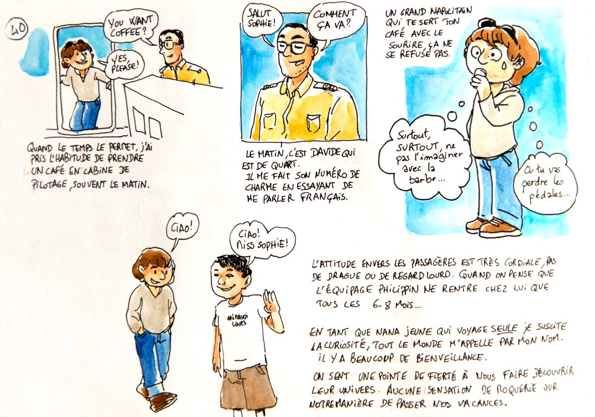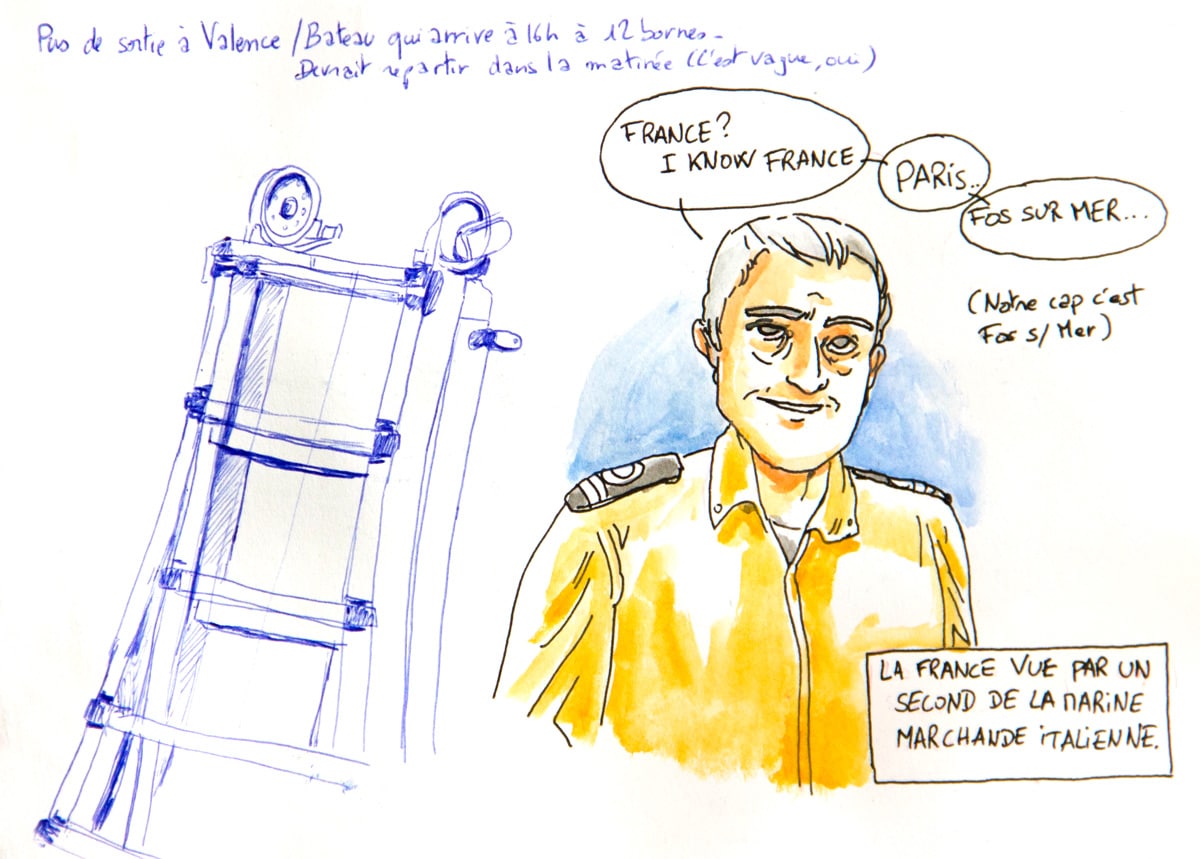 Si j’ai embarqué à bord du bateau Grande Colonia avec la ferme intention de dessiner (et un bon tiers de mon paquetage composé d’affaires de dessin, je ne plaisante pas), je n’avais pas trop prévu de le faire sous la forme d’un carnet de voyage. Ou en tout cas de le présenter comme tel, avec un mélange de textes, de dessin d’observation et de petites cases de BD. A bord, vu que mon cadre changeait peu, il était finalement difficile de ne me contenter que de croquis du bateau; c’est ainsi devenu une sorte de carnet de bord, un peu foutraque, un peu drôle parfois, pour garder pour moi surtout un trace de cette drôle d’expérience.