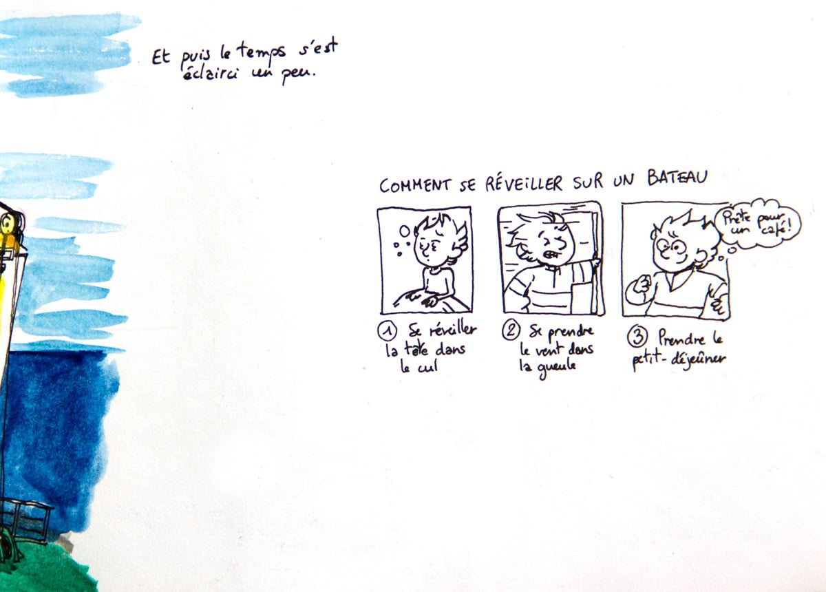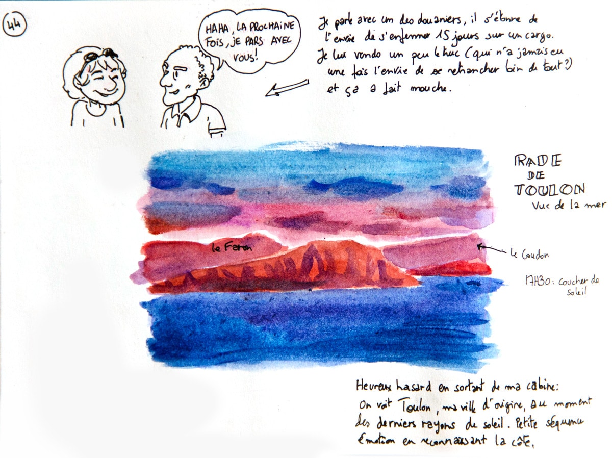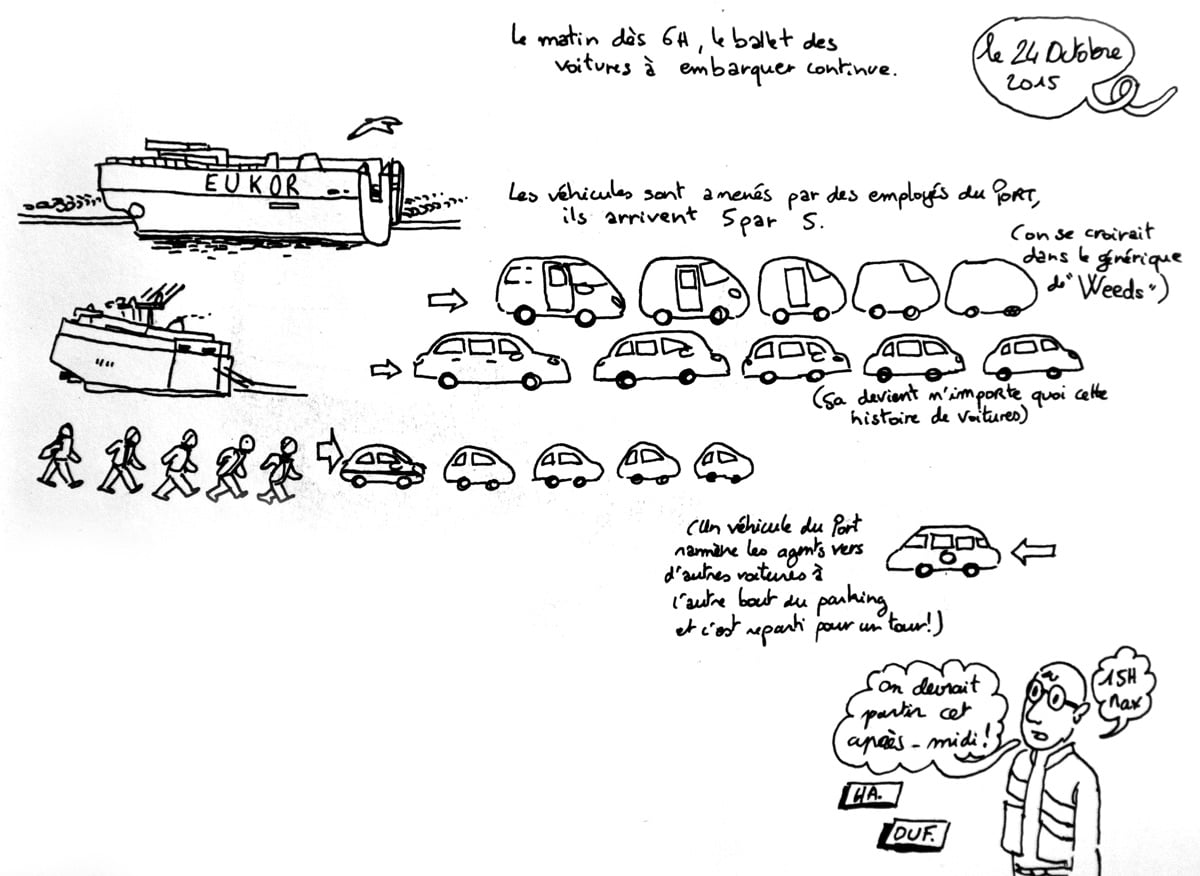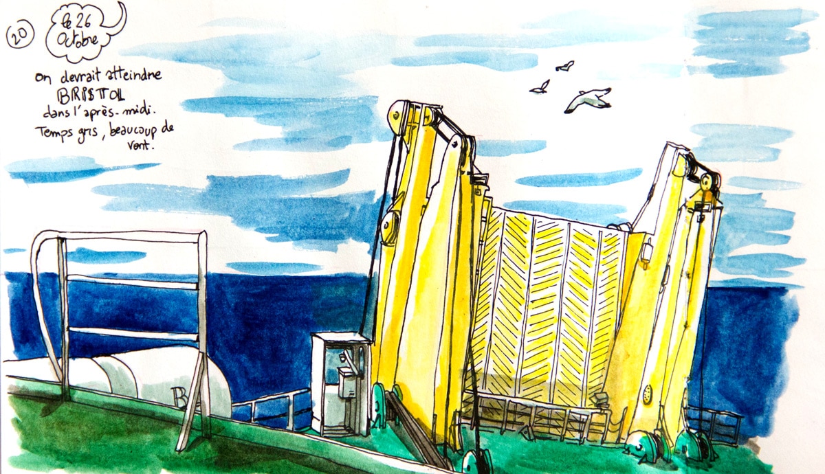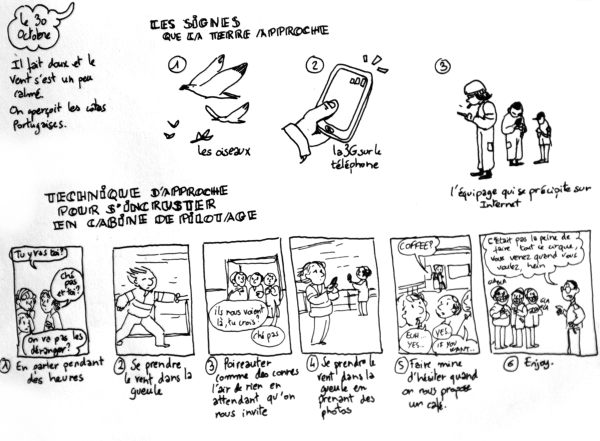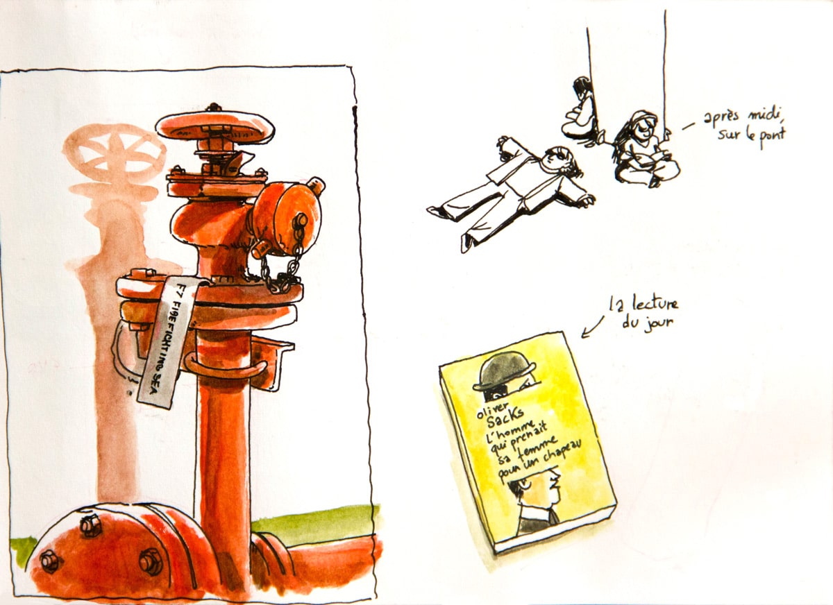 Si j’ai embarqué à bord du bateau Grande Colonia avec la ferme intention de dessiner (et un bon tiers de mon paquetage composé d’affaires de dessin, je ne plaisante pas), je n’avais pas trop prévu de le faire sous la forme d’un carnet de voyage. Ou en tout cas de le présenter comme tel, avec un mélange de textes, de dessin d’observation et de petites cases de BD. A bord, vu que mon cadre changeait peu, il était finalement difficile de ne me contenter que de croquis du bateau; c’est ainsi devenu une sorte de carnet de bord, un peu foutraque, un peu drôle parfois, pour garder pour moi surtout un trace de cette drôle d’expérience.