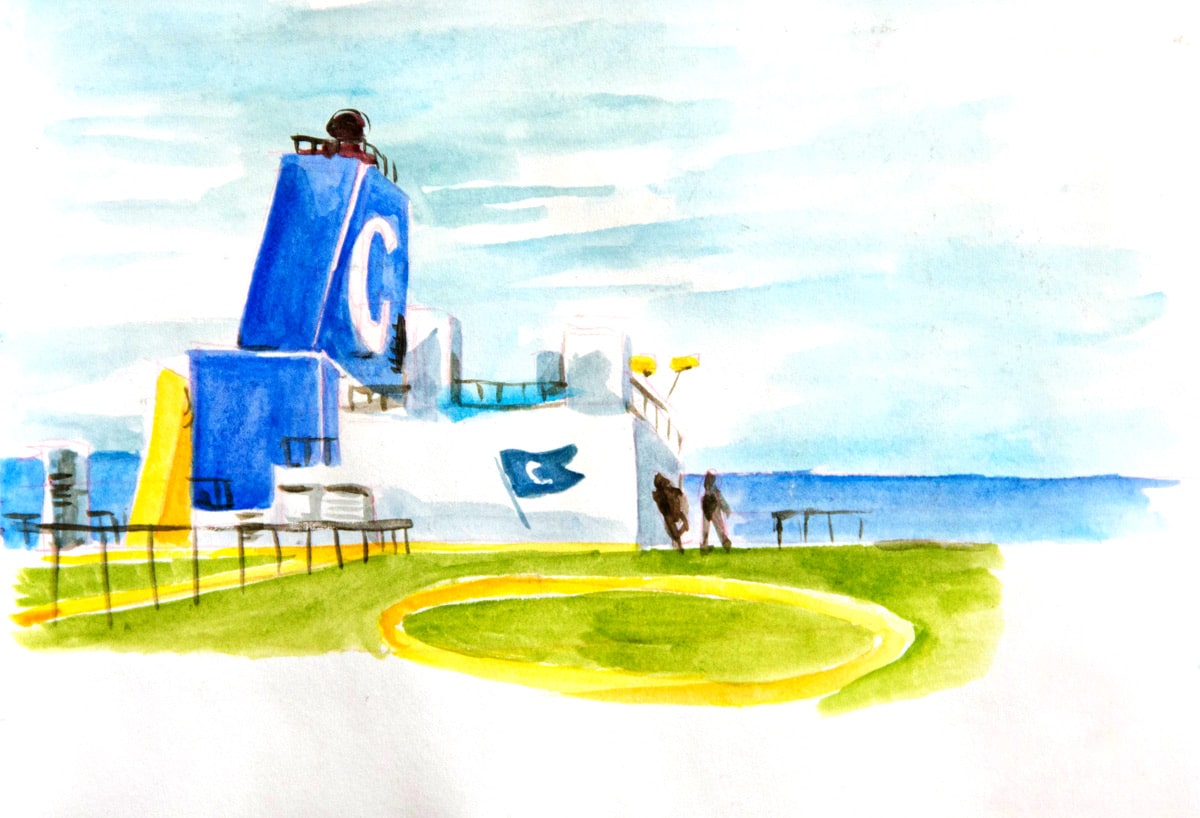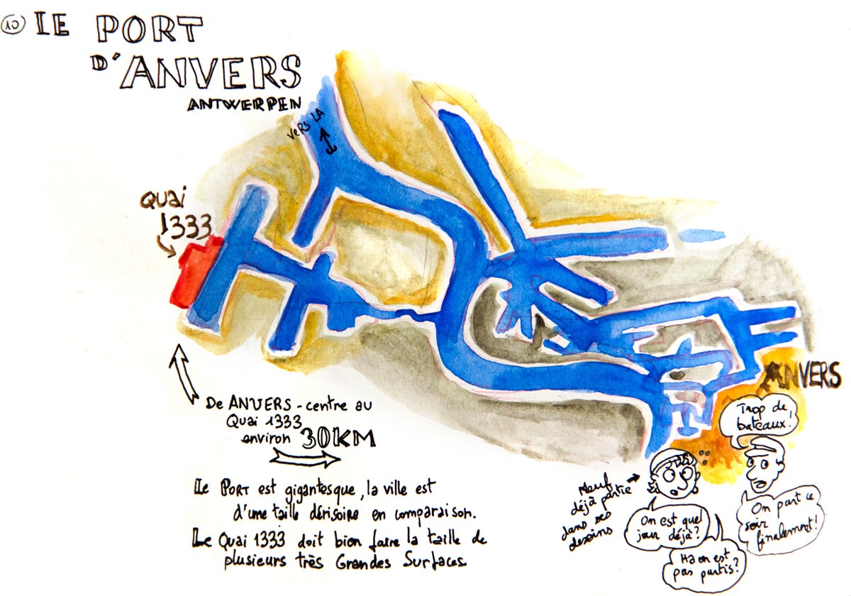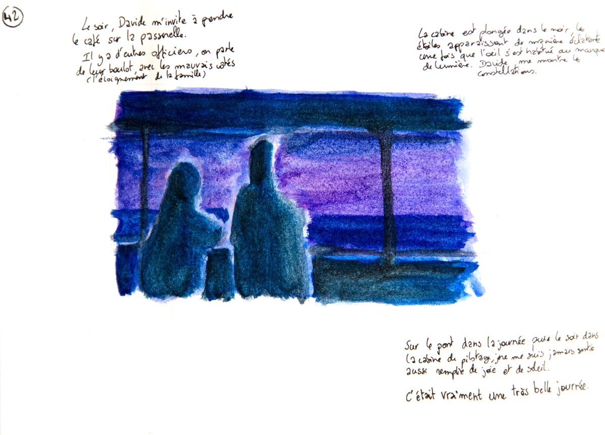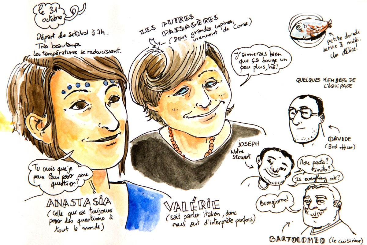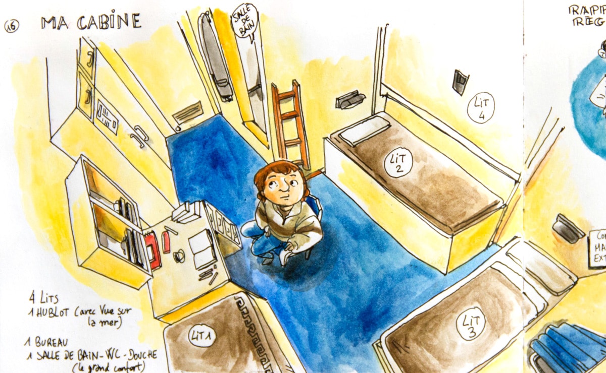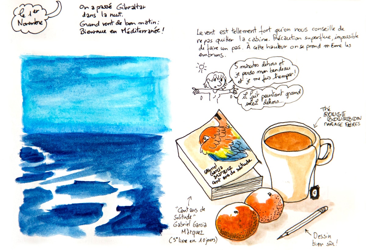 Si j’ai embarqué à bord du bateau Grande Colonia avec la ferme intention de dessiner (et un bon tiers de mon paquetage composé d’affaires de dessin, je ne plaisante pas), je n’avais pas trop prévu de le faire sous la forme d’un carnet de voyage. Ou en tout cas de le présenter comme tel, avec un mélange de textes, de dessin d’observation et de petites cases de BD. A bord, vu que mon cadre changeait peu, il était finalement difficile de ne me contenter que de croquis du bateau; c’est ainsi devenu une sorte de carnet de bord, un peu foutraque, un peu drôle parfois, pour garder pour moi surtout un trace de cette drôle d’expérience.