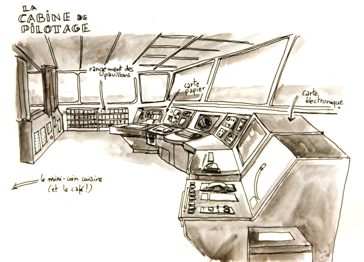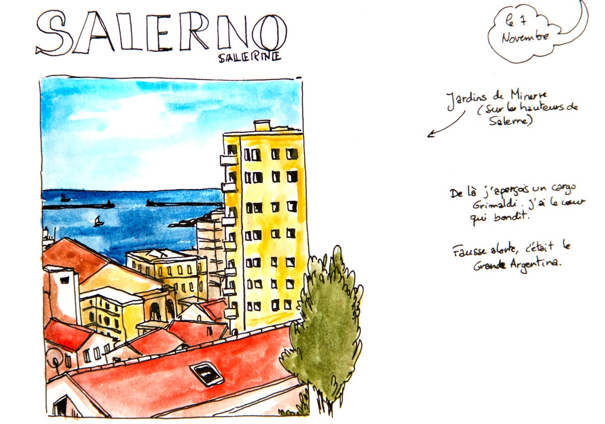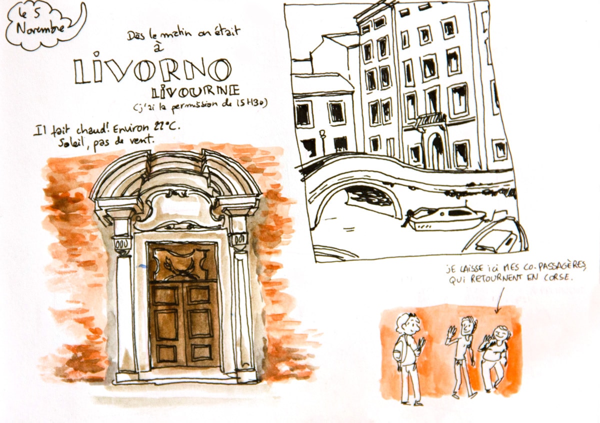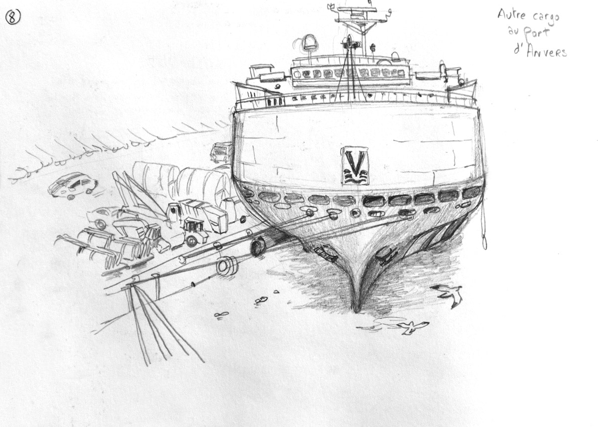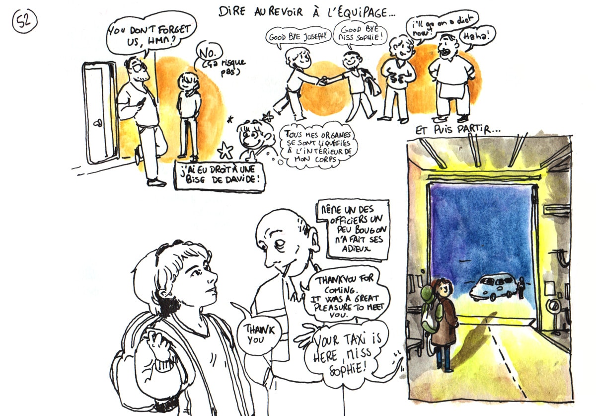 Si j’ai embarqué à bord du bateau Grande Colonia avec la ferme intention de dessiner (et un bon tiers de mon paquetage composé d’affaires de dessin, je ne plaisante pas), je n’avais pas trop prévu de le faire sous la forme d’un carnet de voyage. Ou en tout cas de le présenter comme tel, avec un mélange de textes, de dessin d’observation et de petites cases de BD. A bord, vu que mon cadre changeait peu, il était finalement difficile de ne me contenter que de croquis du bateau; c’est ainsi devenu une sorte de carnet de bord, un peu foutraque, un peu drôle parfois, pour garder pour moi surtout un trace de cette drôle d’expérience.