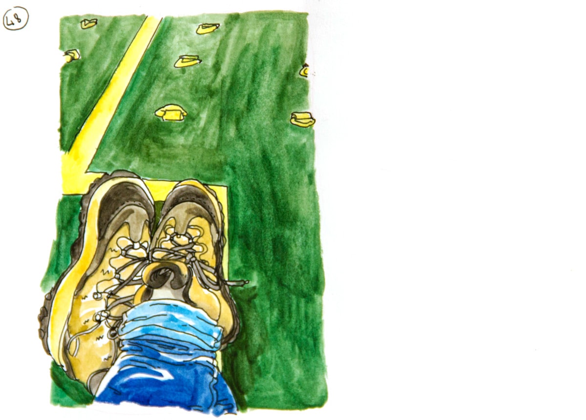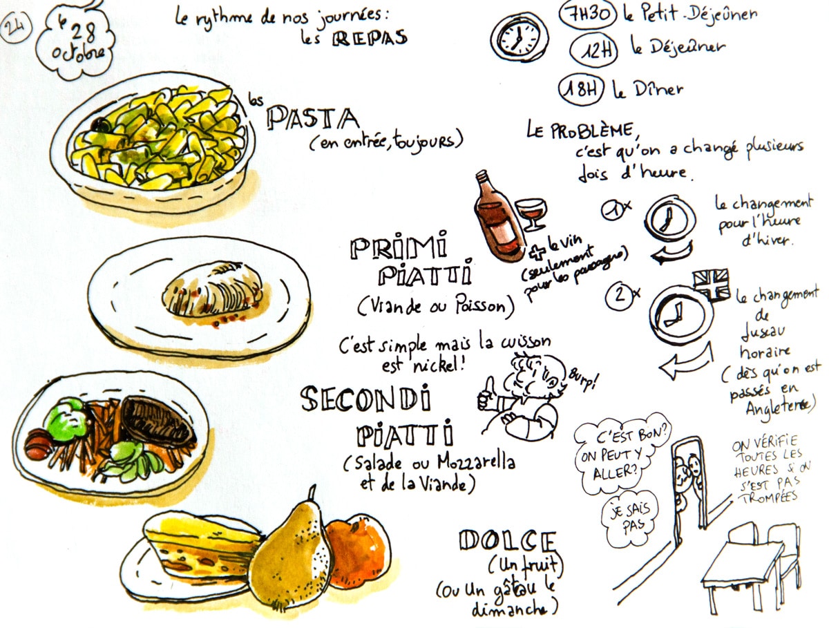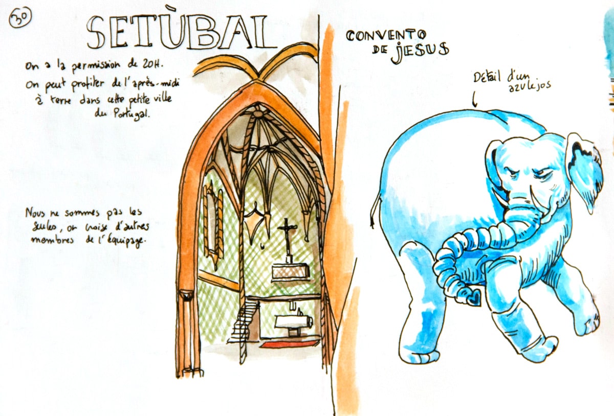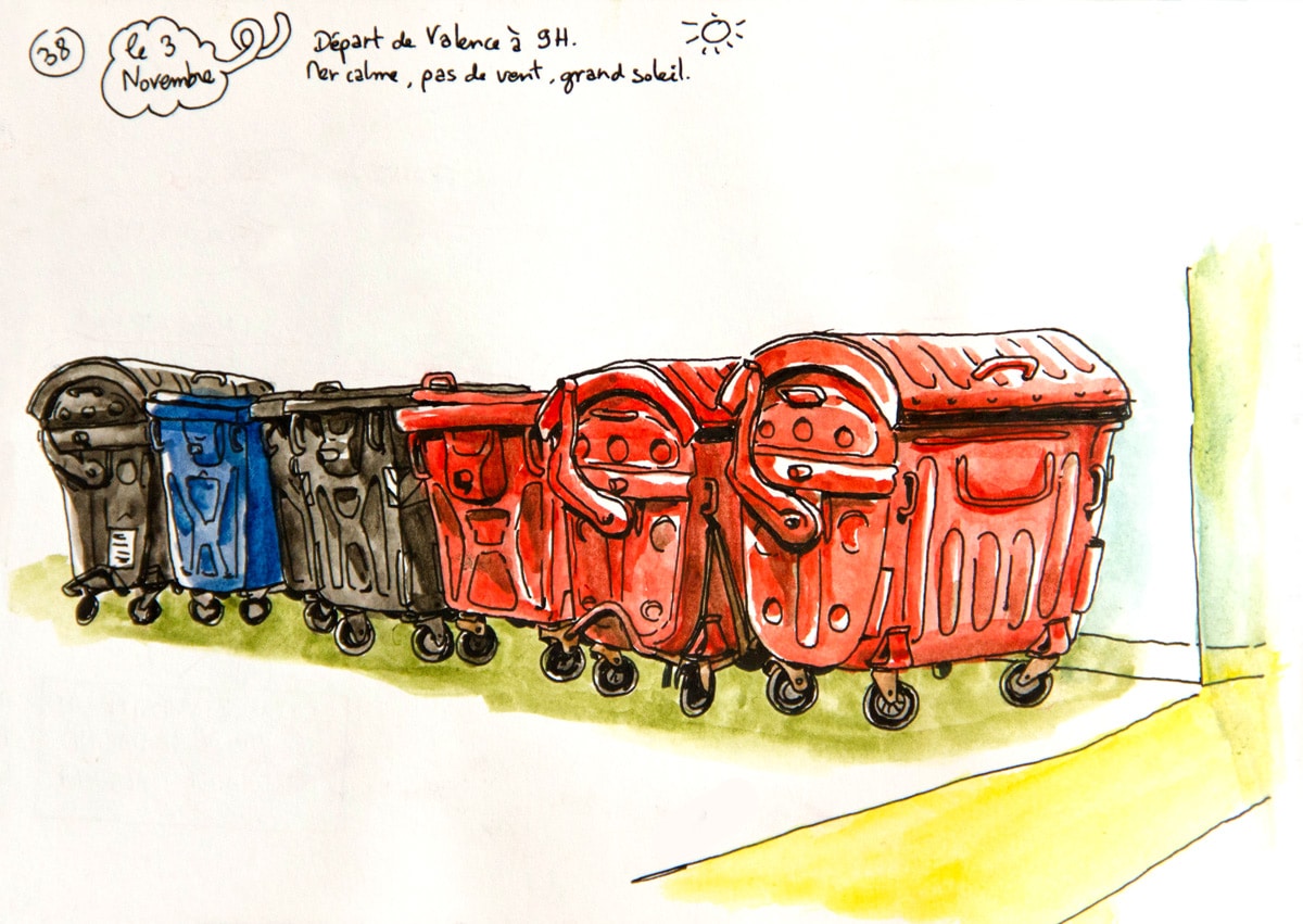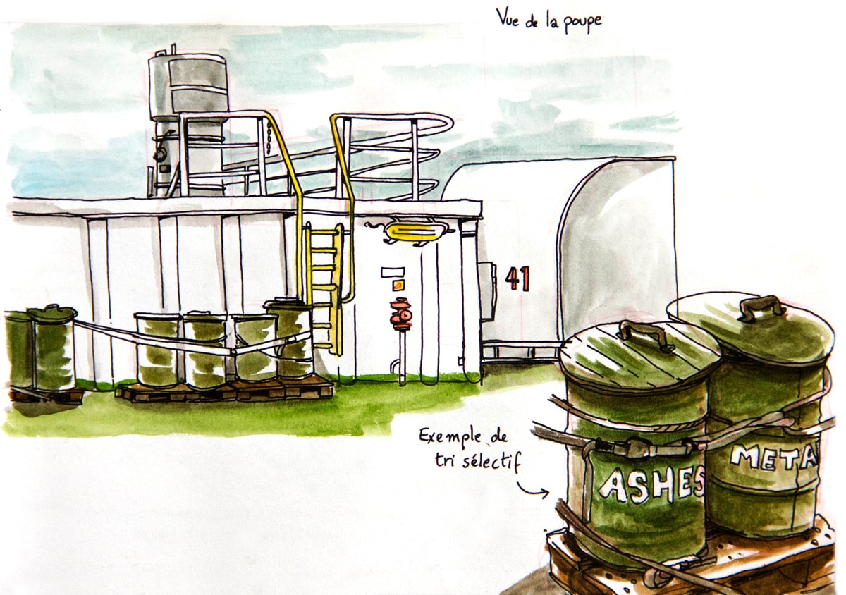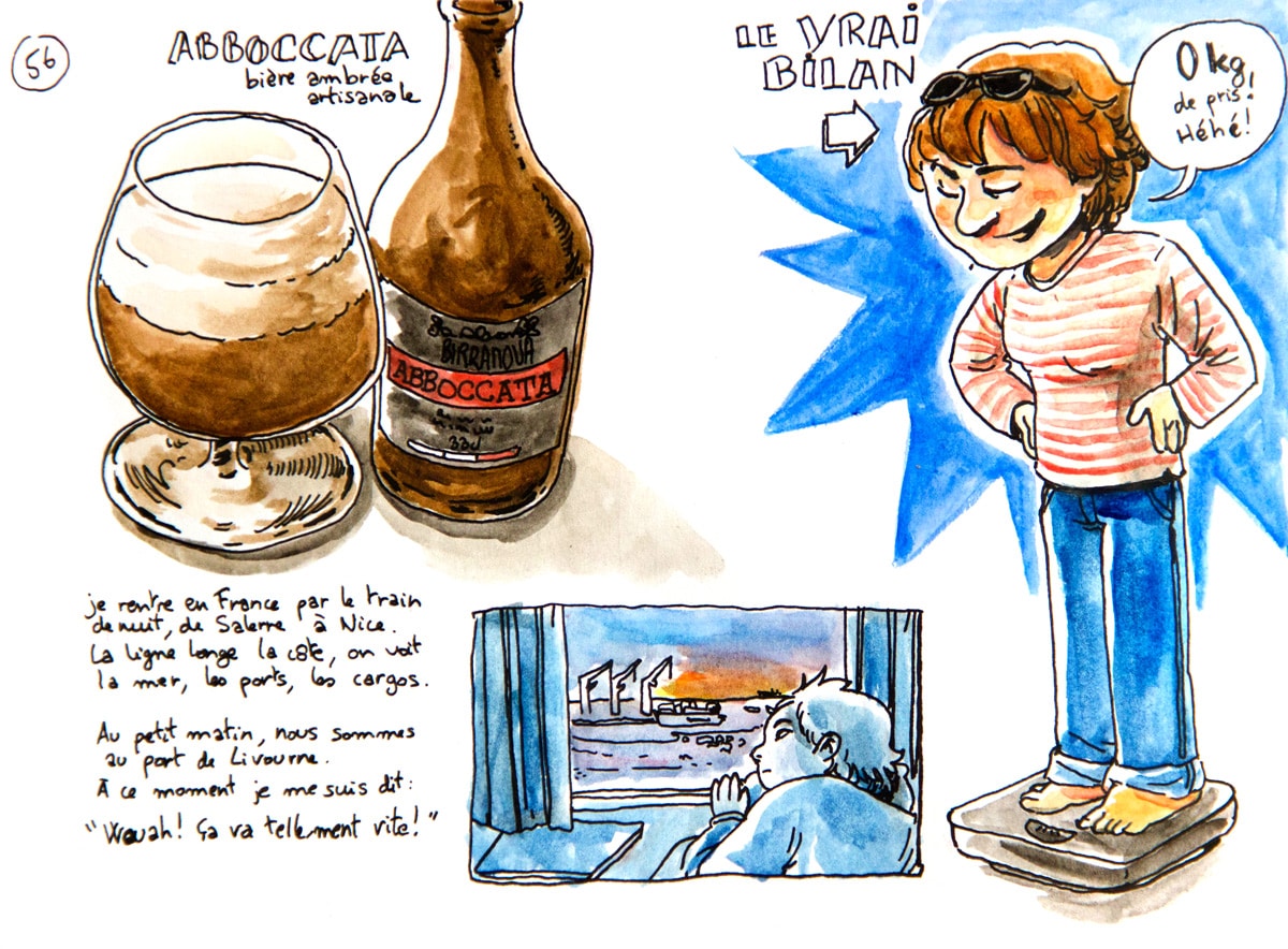 Si j’ai embarqué à bord du bateau Grande Colonia avec la ferme intention de dessiner (et un bon tiers de mon paquetage composé d’affaires de dessin, je ne plaisante pas), je n’avais pas trop prévu de le faire sous la forme d’un carnet de voyage. Ou en tout cas de le présenter comme tel, avec un mélange de textes, de dessin d’observation et de petites cases de BD. A bord, vu que mon cadre changeait peu, il était finalement difficile de ne me contenter que de croquis du bateau; c’est ainsi devenu une sorte de carnet de bord, un peu foutraque, un peu drôle parfois, pour garder pour moi surtout un trace de cette drôle d’expérience.