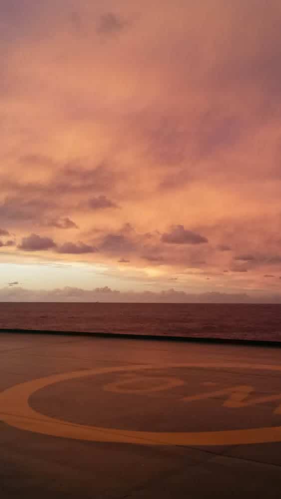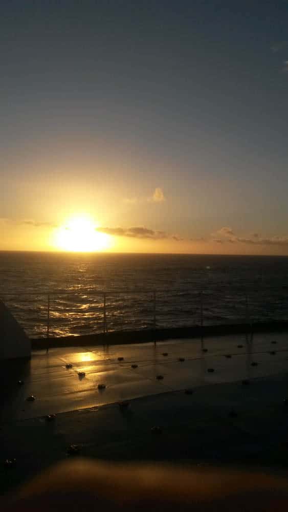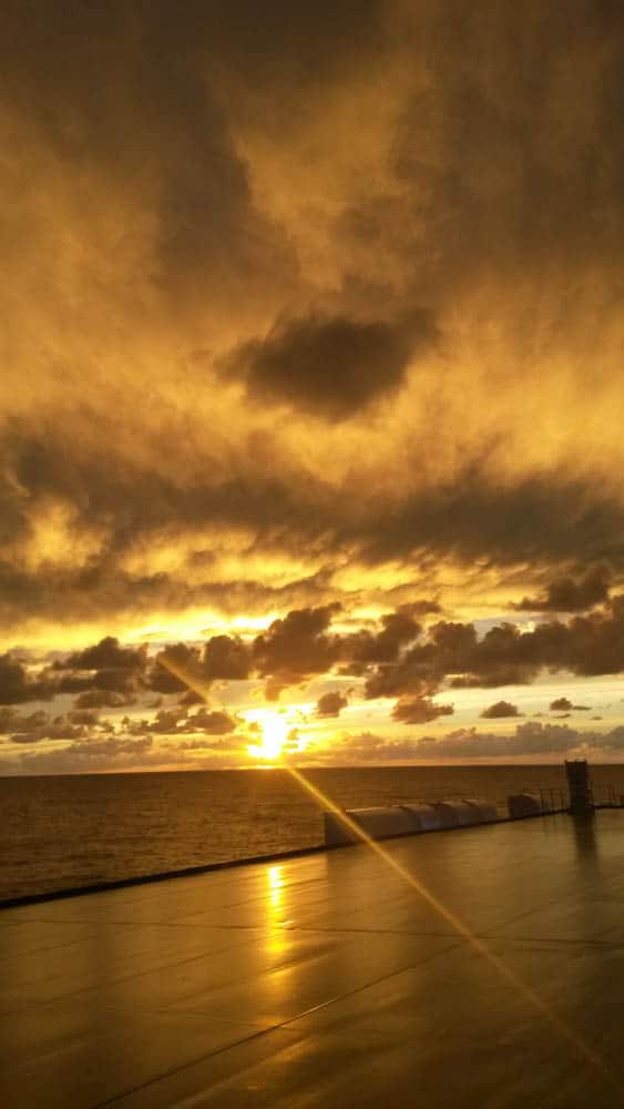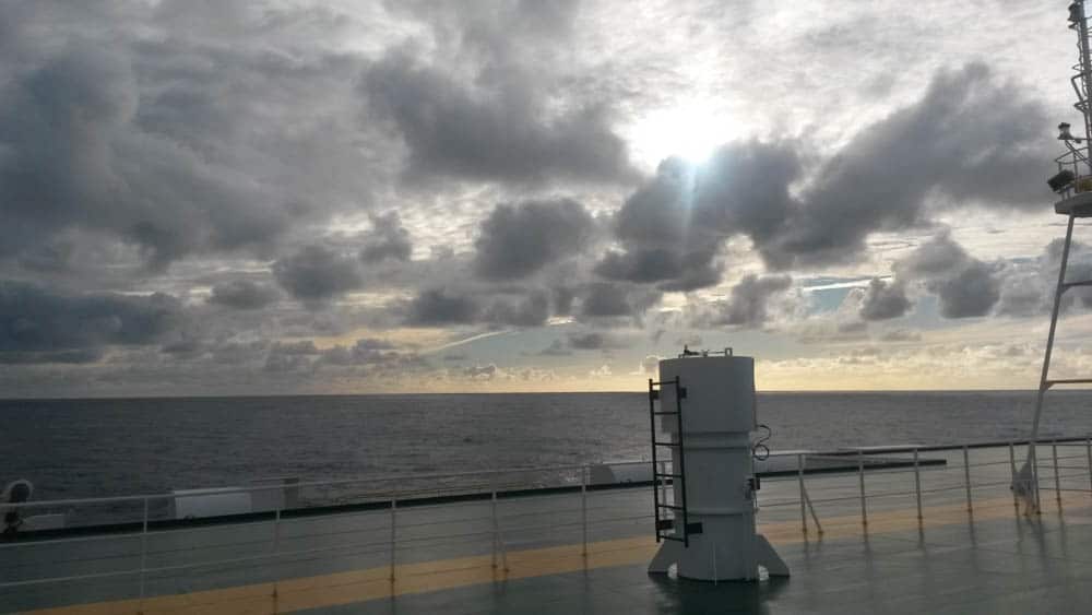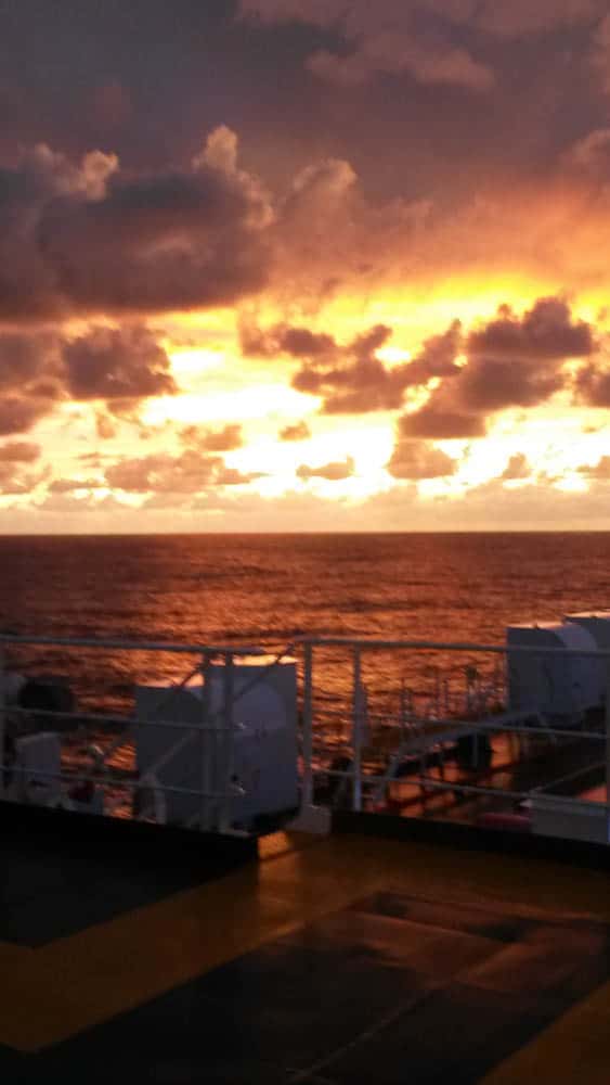 J’ai laissé ma joie éclater sur le pont du cargo, un après-midi entier, laissant mon regard se promener sur le ciel autour, au-dessus de moi, partout! J’y passais des heures, j’en oubliais mes dessins ou ma lecture. Il y a eu ce bonheur de me lever chaque matin, aux aurores, sans aucune fatigue. Mon premier geste était chaque matin, de me jeter hors de ma cabine dans le froid et le vent juste pour ce bonheur: voir la mer défiler devant moi, avant même mon premier café! Il n’y a pas eu de grand paysage, de côtes escarpées, de fjord magnifique. Mais à chaque minute, chaque jour, le ciel offrait une telle gamme de couleurs et de lumières que c’était sans importance.
