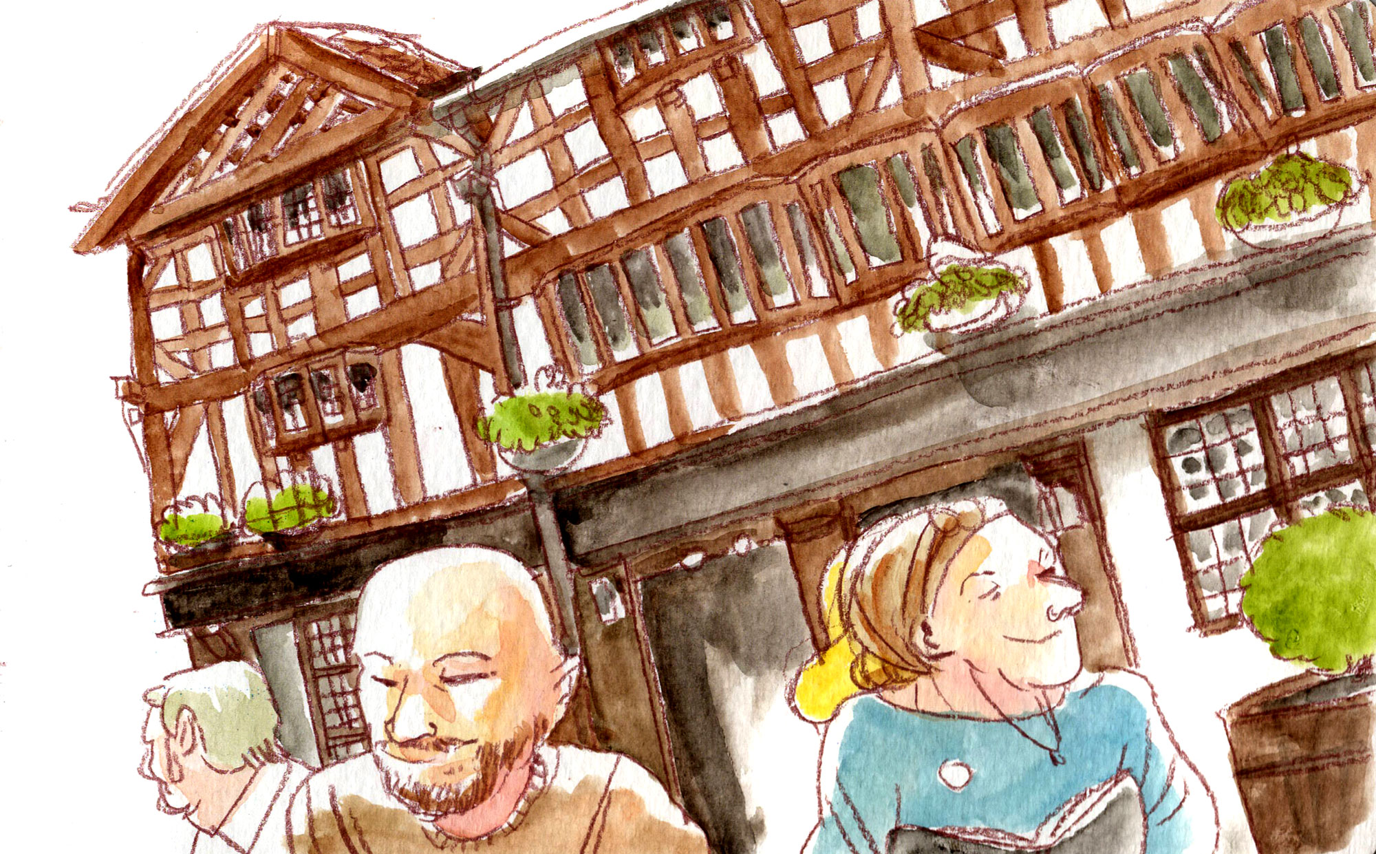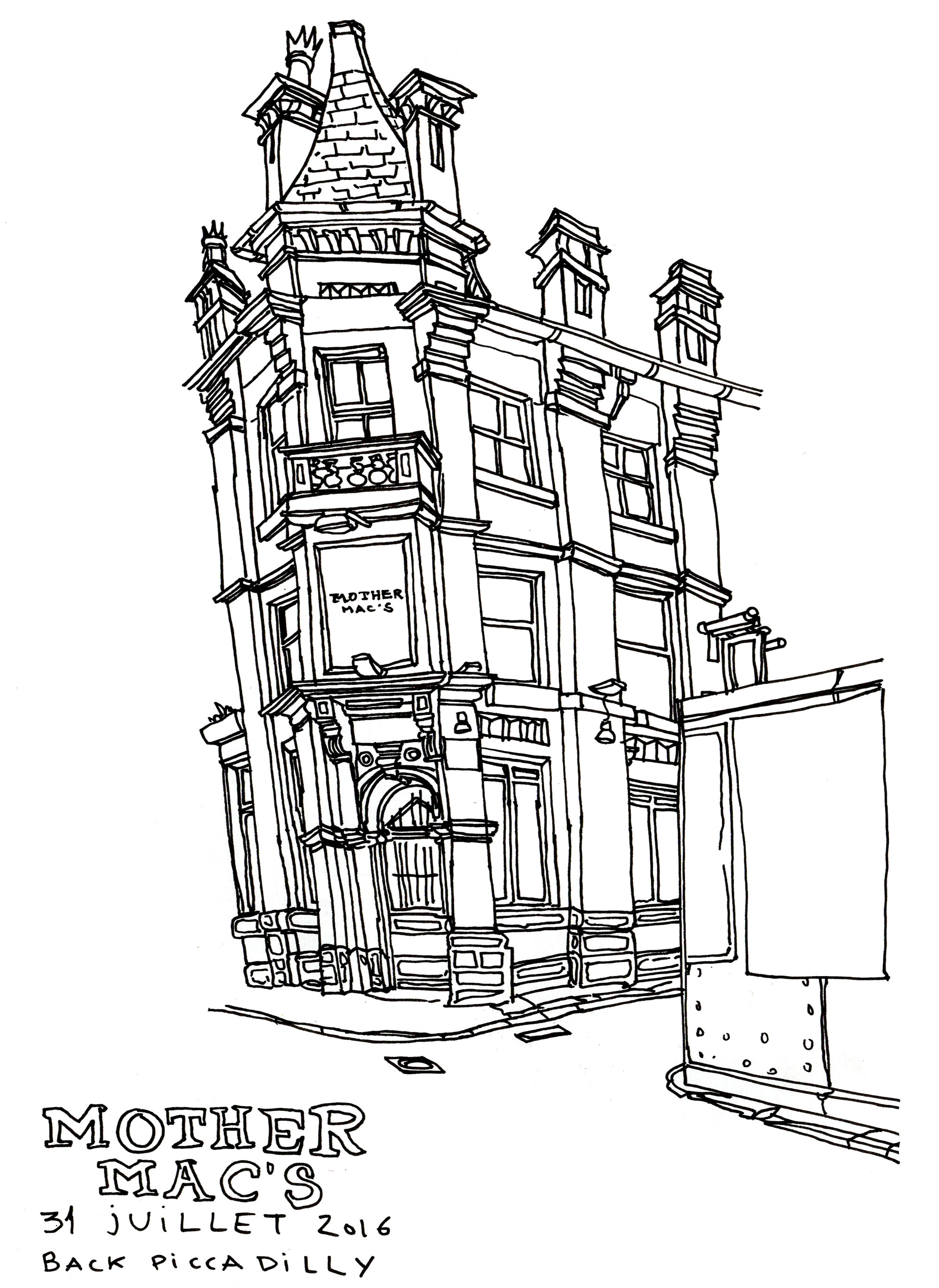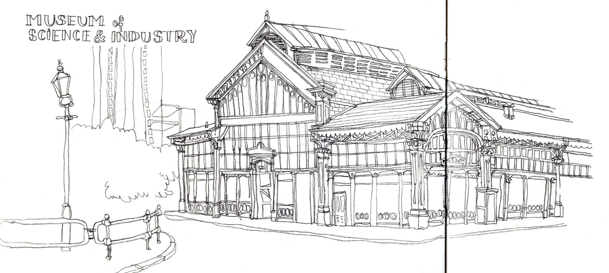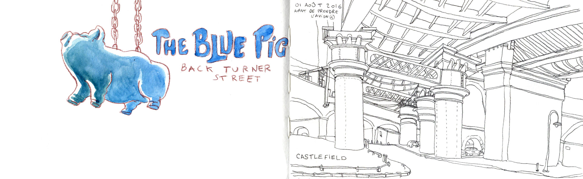 Que dire de Manchester? Que c’est une ville au gros passé industriel, c’est indéniable. Qu’il y a un fort contraste entre les bâtiments, que je ne pensais pas voir une antique taverne anglaise au pied d’un building d’acier et de verre, que la cathédrale, si petit bâtiment pour une si grande ville, semble encore rapetisser tellement elle est entourée de galeries commerciales dernier cri. On sent la ville industrieuse à en oublier d’être sexy pour les touristes, qui détruit des vieux bâtiments à tour de bras, peu importe les traces du passé. Combien de vieux pubs avons-nous dessiné alors qu’un passant nous disait que l’année prochaine, il serait rasé?