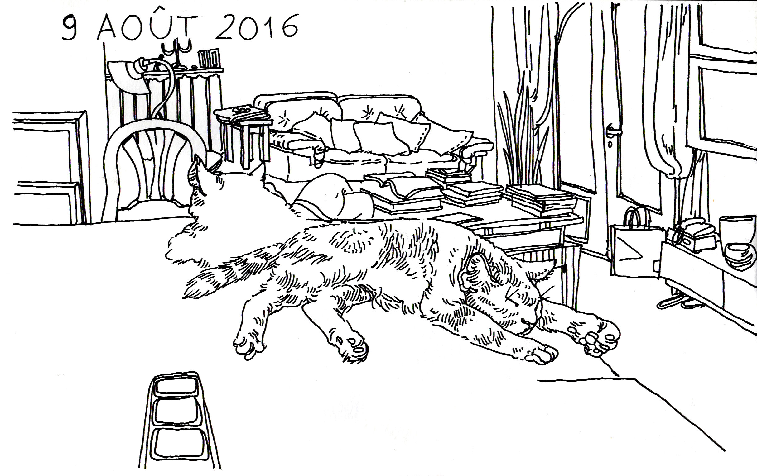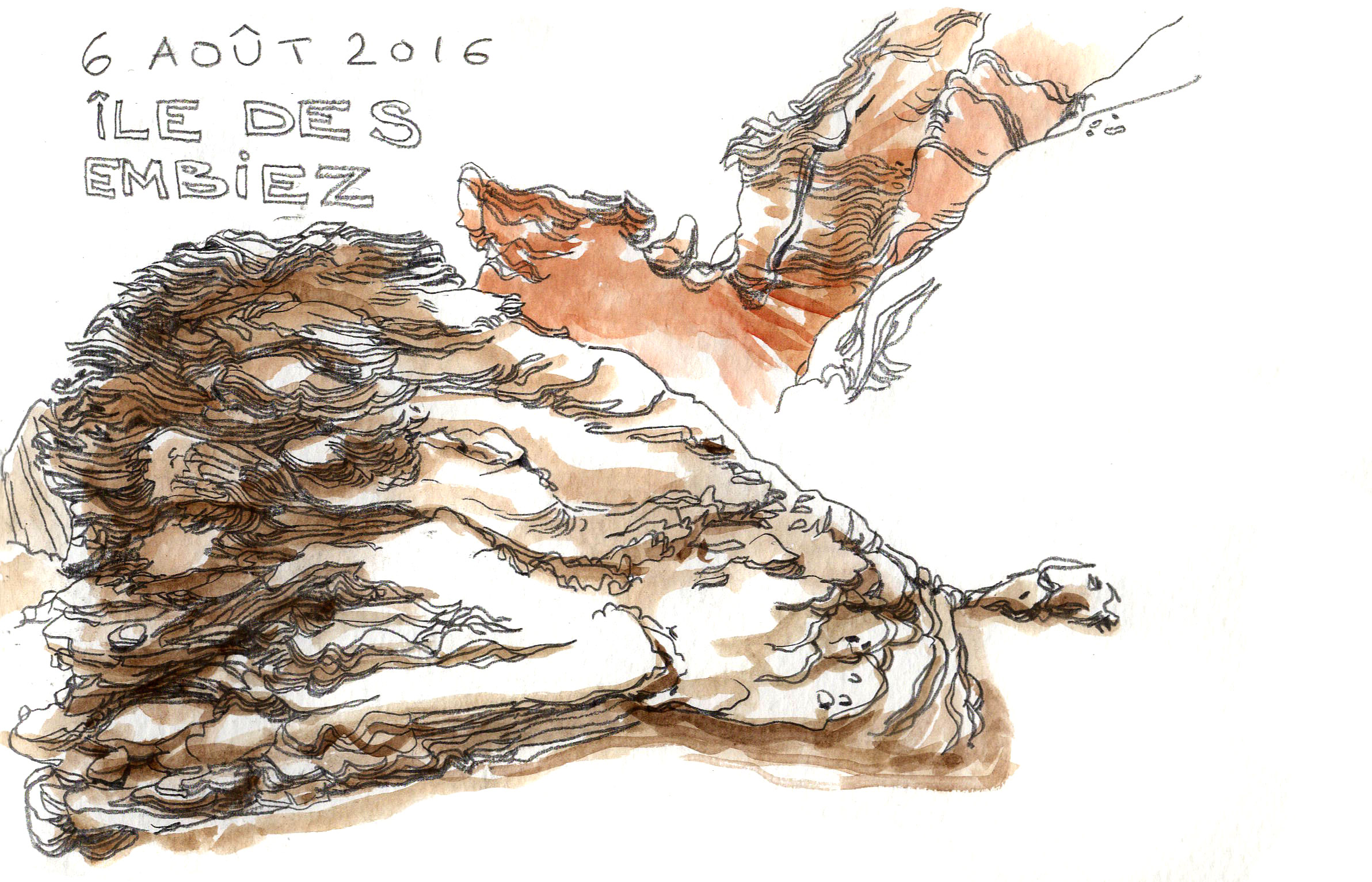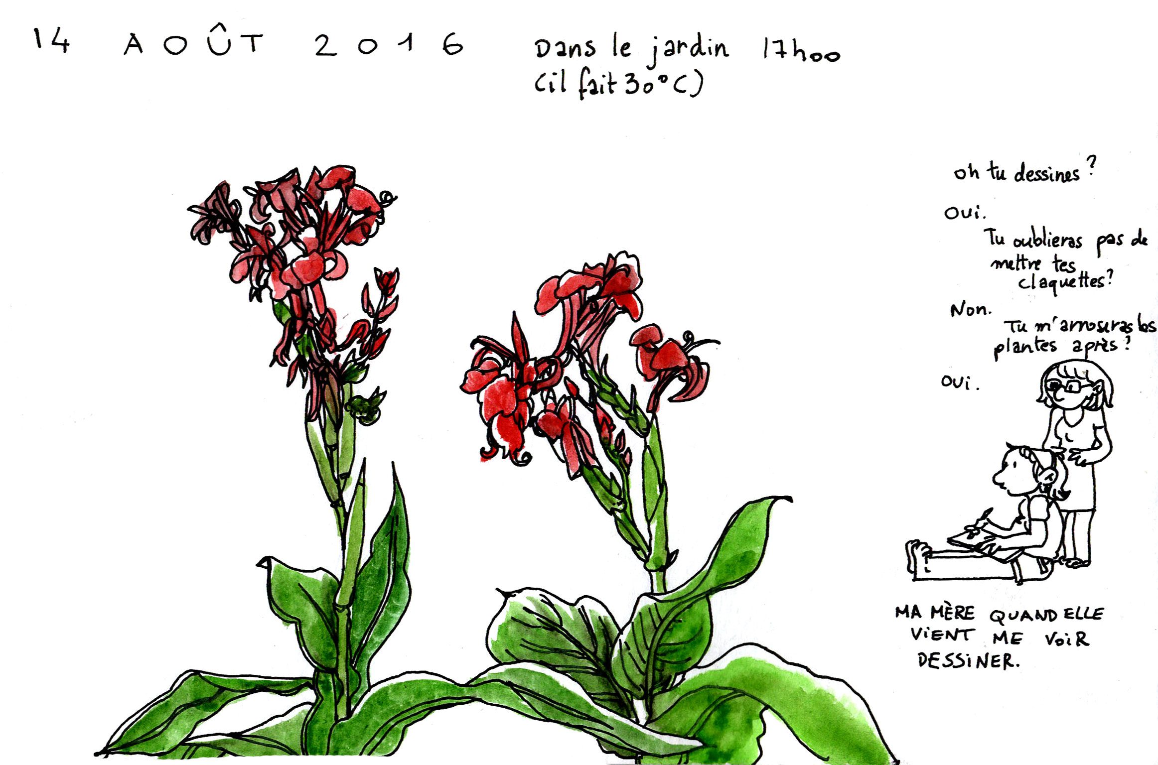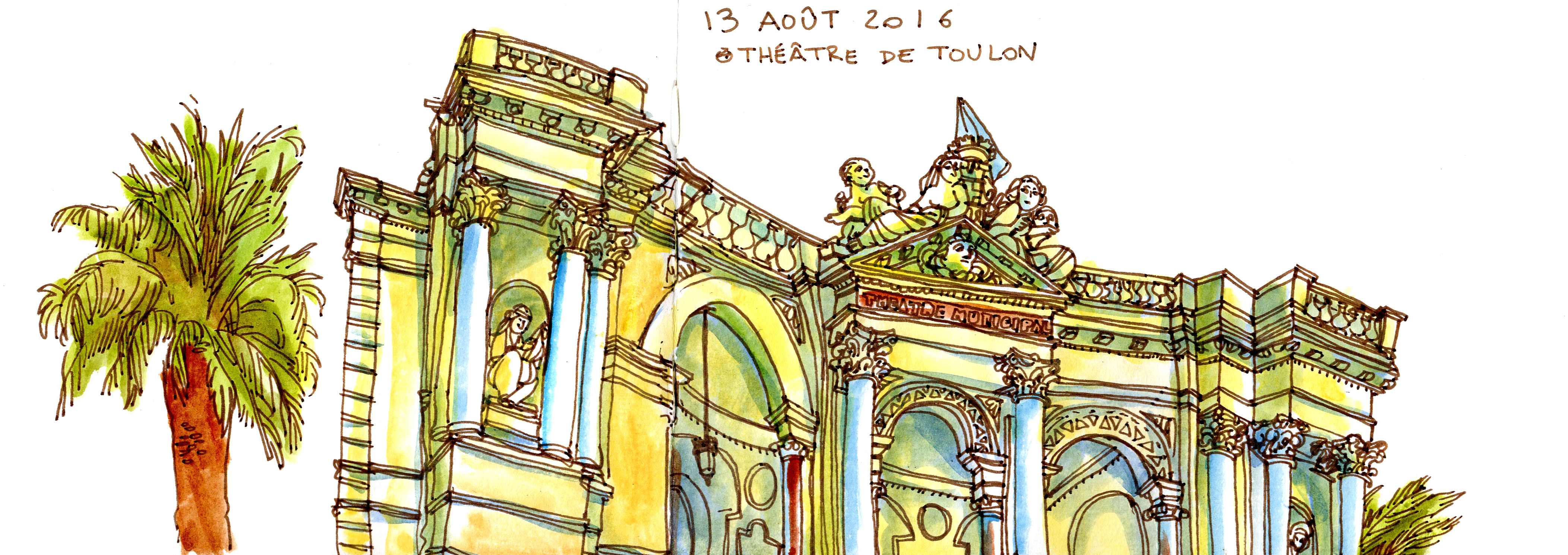 Me voilà de retour de quelques jours chez a mère, à Toulon. Je gratte régulièrement dans mon carnet Moleskine aquarelle dans le but de le finir le plus rapidement possible. Je n’ai rien contre lui, le papier est agréable pour l’aquarelle et l’encre, mais je ne supporte plus son format allongé. Comme je ne déroge pas à la règle de commencer un nouveau carnet sans en avoir fini un, je remplis mes pages de scènes de la vie de tous les jours.