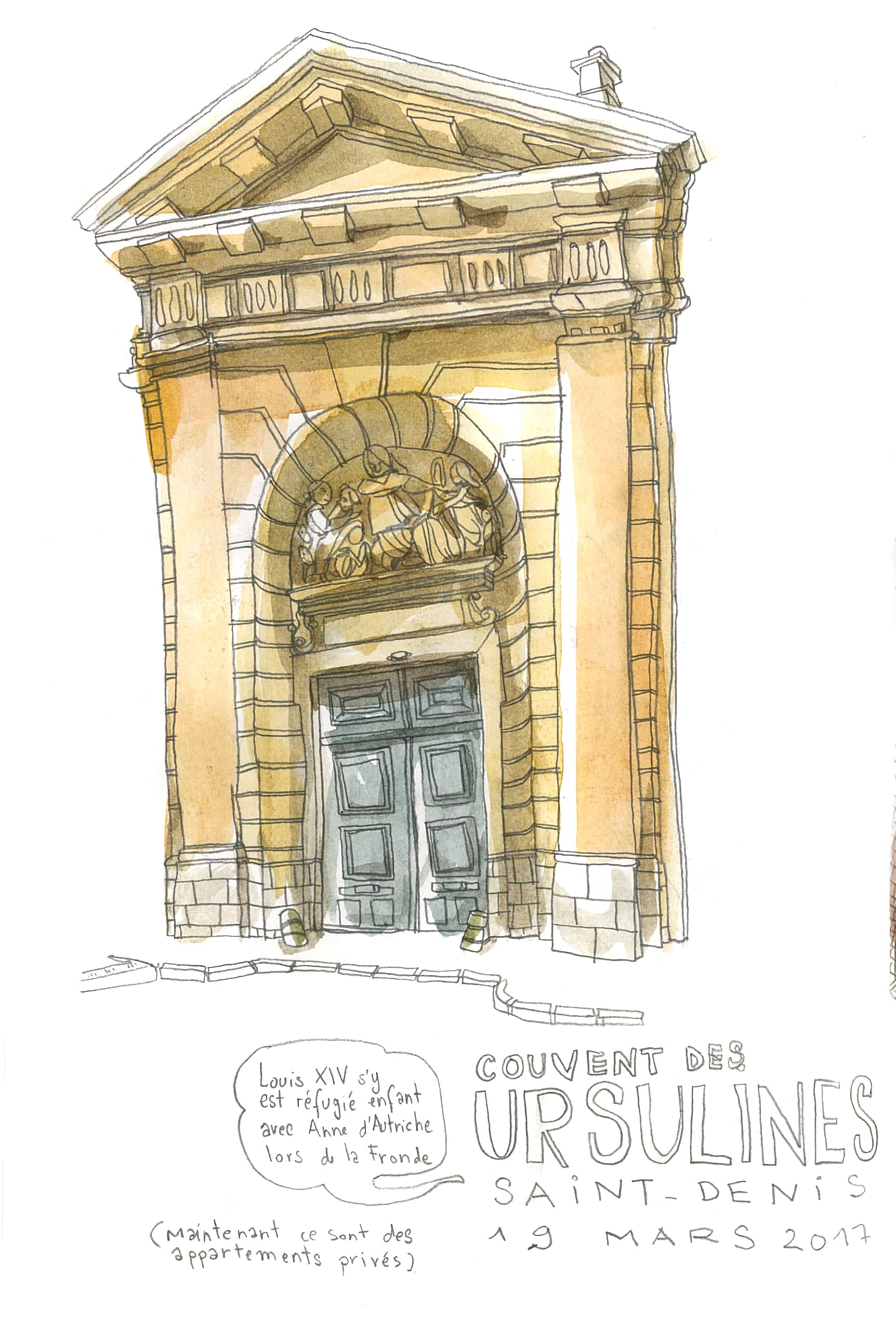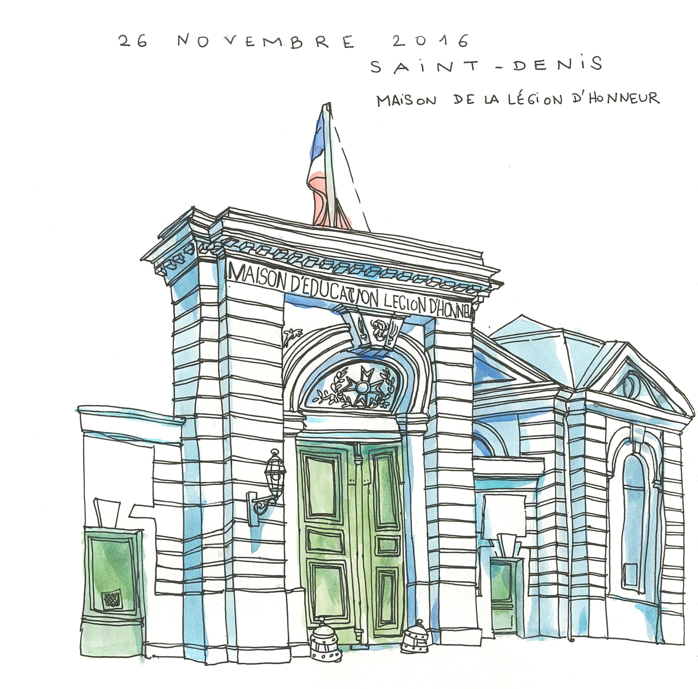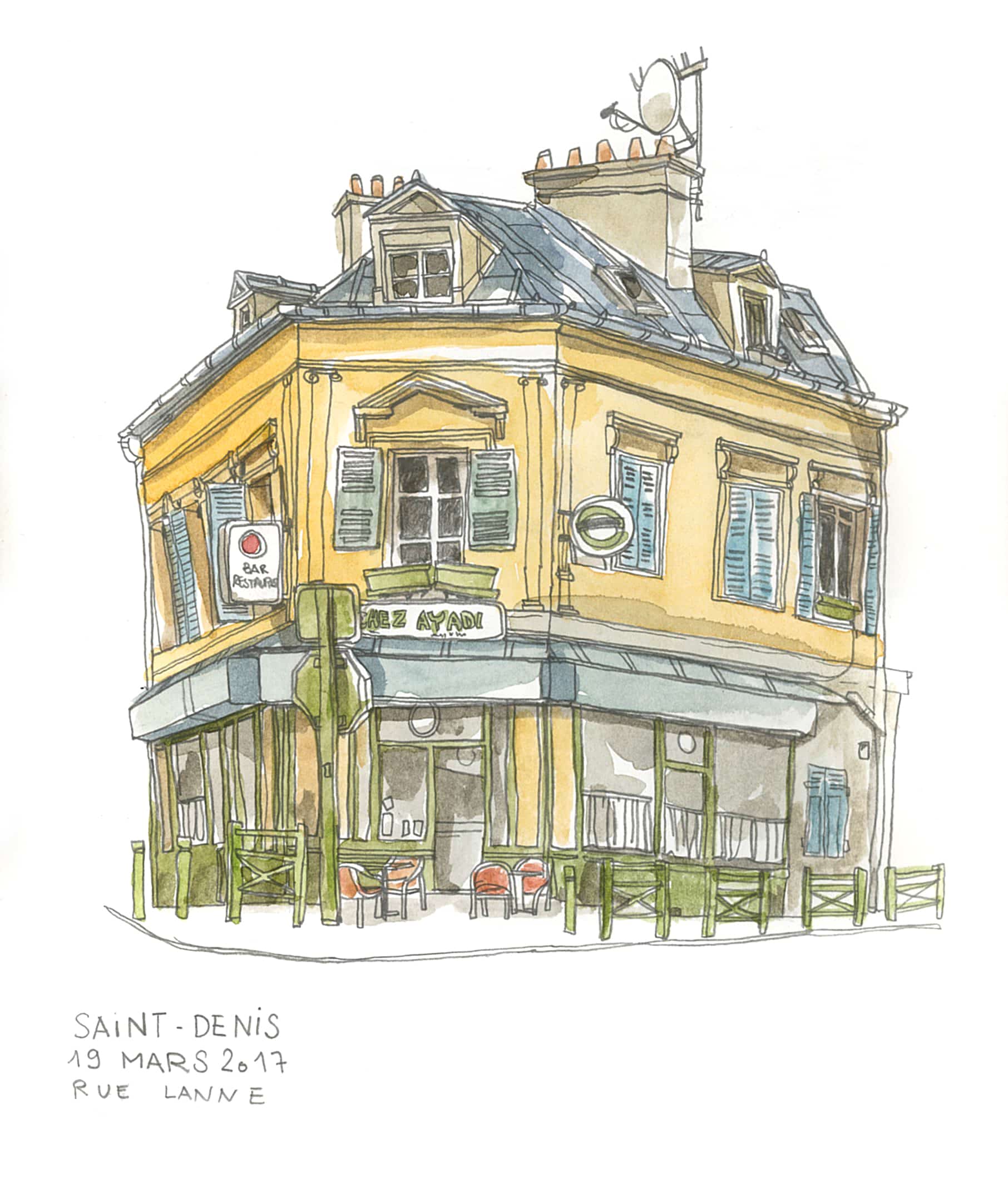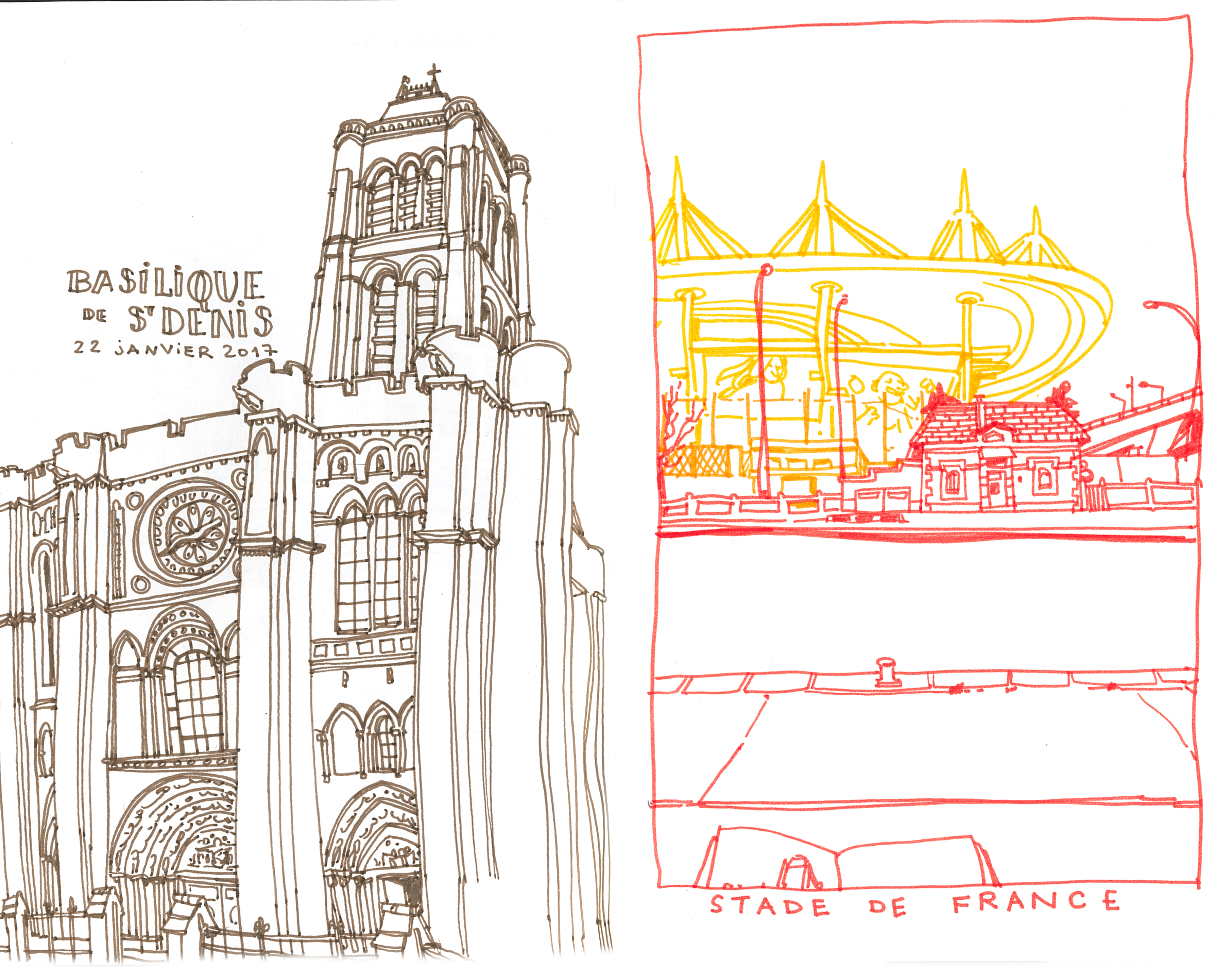 La tête ailleurs, l’esprit confus, la motivation en berne… Je vous narrerai le pourquoi du comment, plus tard, quand les idées seront posées au lieu de bourdonner autour de ma tête. En attendant, je me suis arrimée au dessin, de toutes mes forces. Et les jours où les 20 minutes de RER qui me séparaient du centre de Paris me paraissaient insurmontables, j’ai tourné autour du centre historique de Saint-Denis. Et je me suis laissée surprendre par l’ancienne ville des rois, par ce passé historique tellement présent, entre l’architecture populaire du 19e siècle, les barres d’immeuble des années 60, le Stade de France, les écluses et les vieux bâtiments industriels. Finalement, je ne regrette pas d’avoir dédaigné la ville capitale sur ce coup.