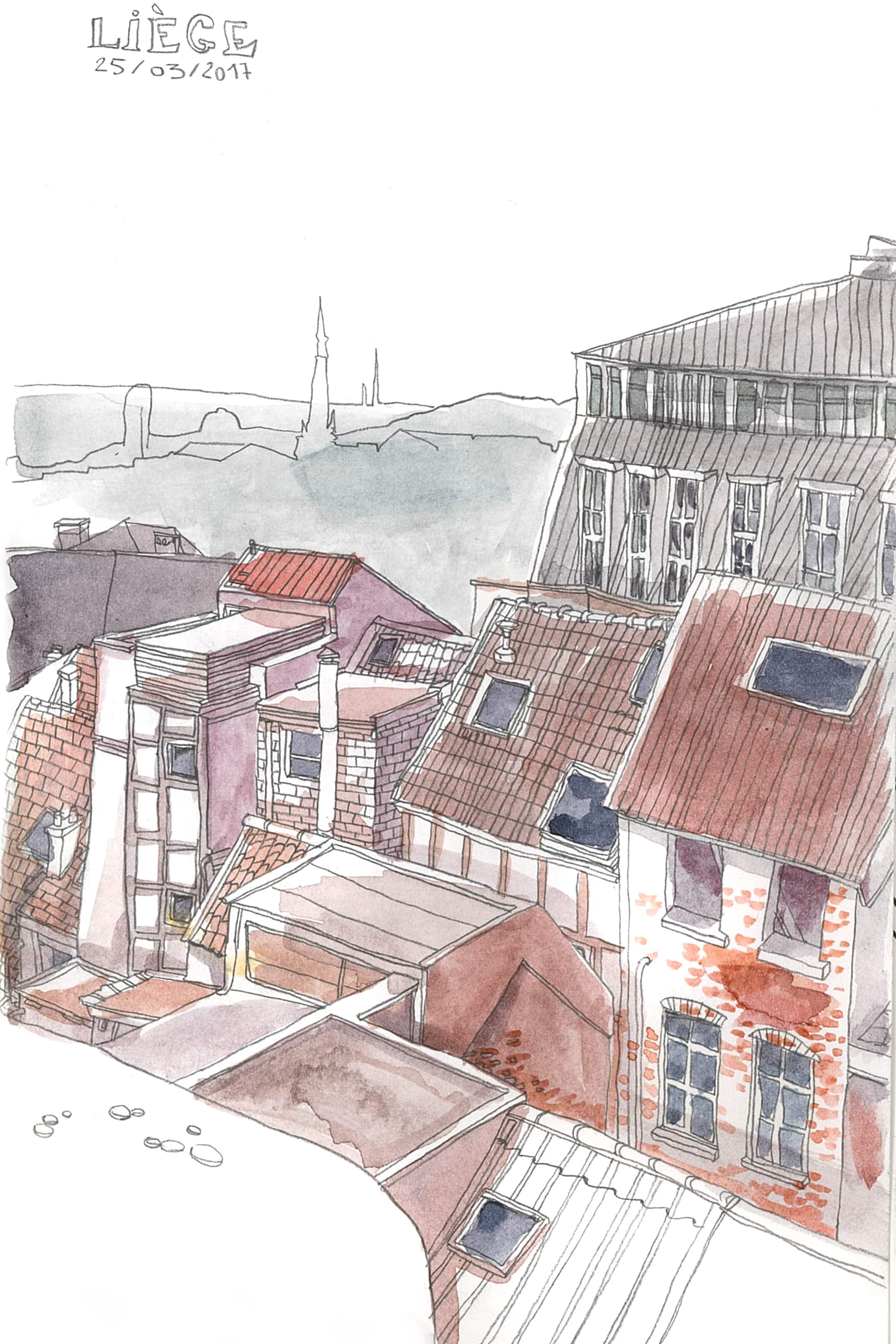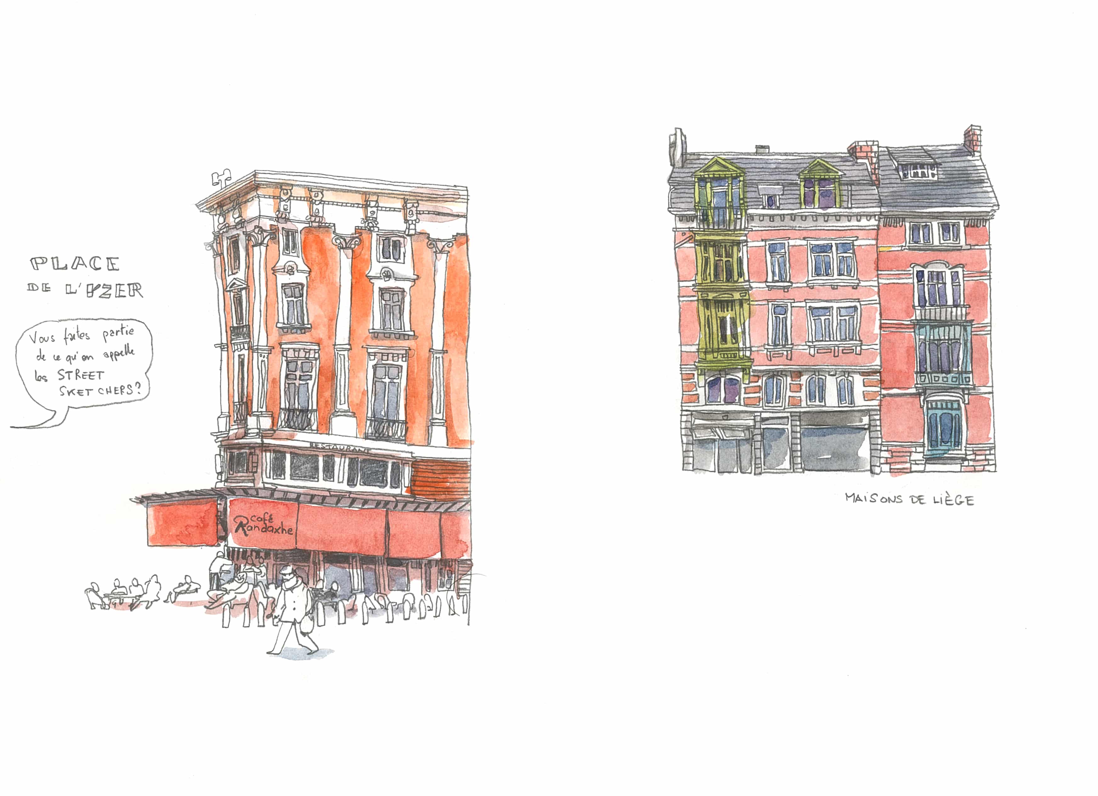 L’envie me taraudait depuis un moment et j’ai profité d’une promo Thalys très intéressante pour enfin découvrir Liège, le temps d’un week-end. Le programme: découverte de la ville et surtout, surtout, croiser les copains liégeois urban sketchers pour dessiner. L’invitation avait été lancée au vol il y a quelques mois, je ne me suis pas faite prier.