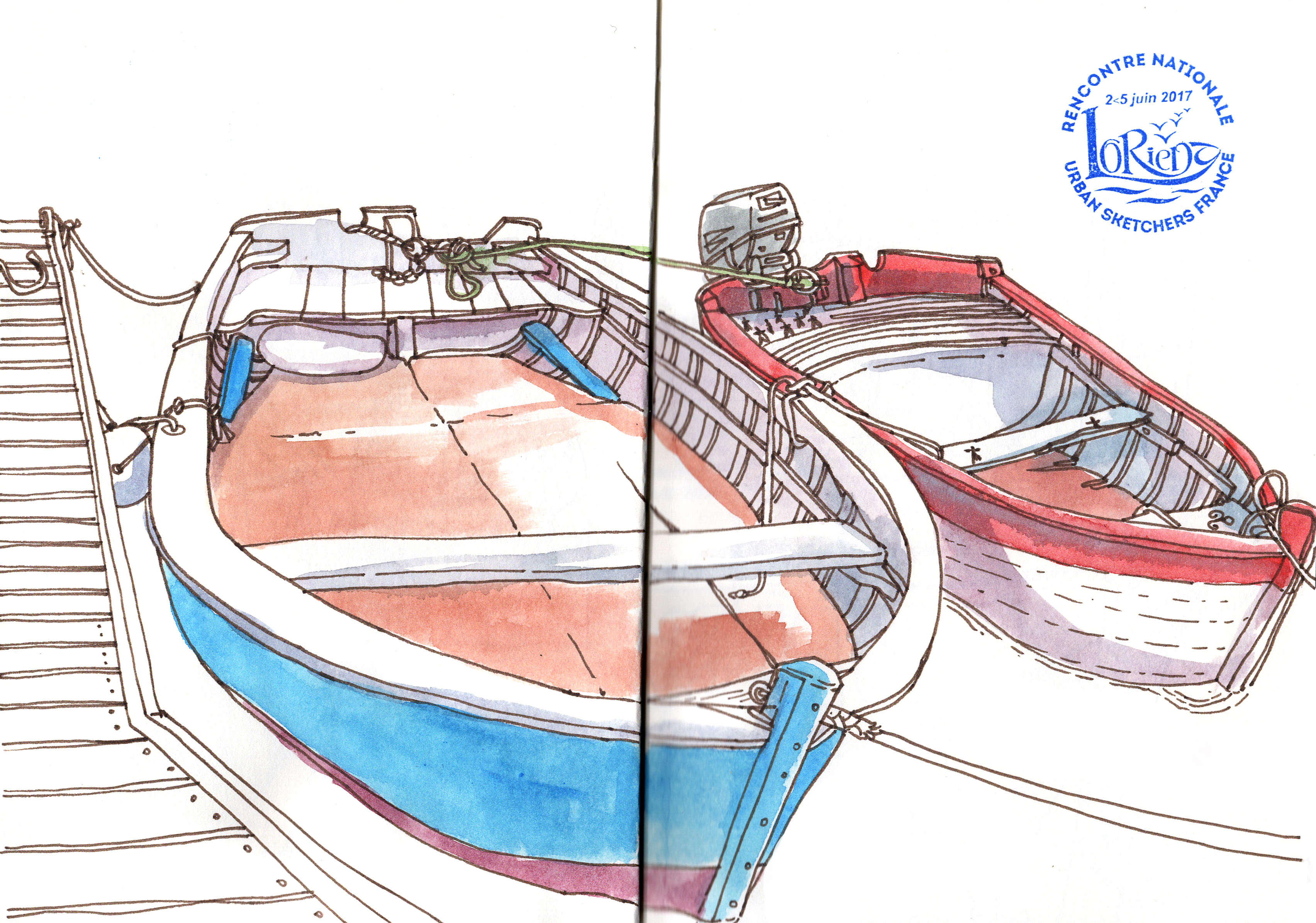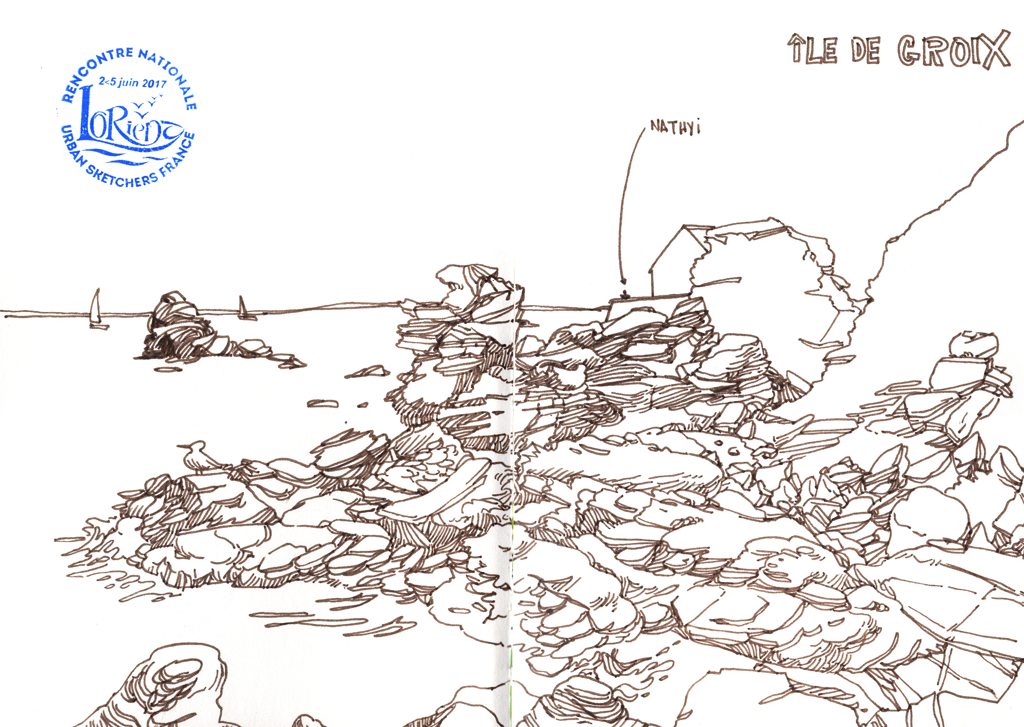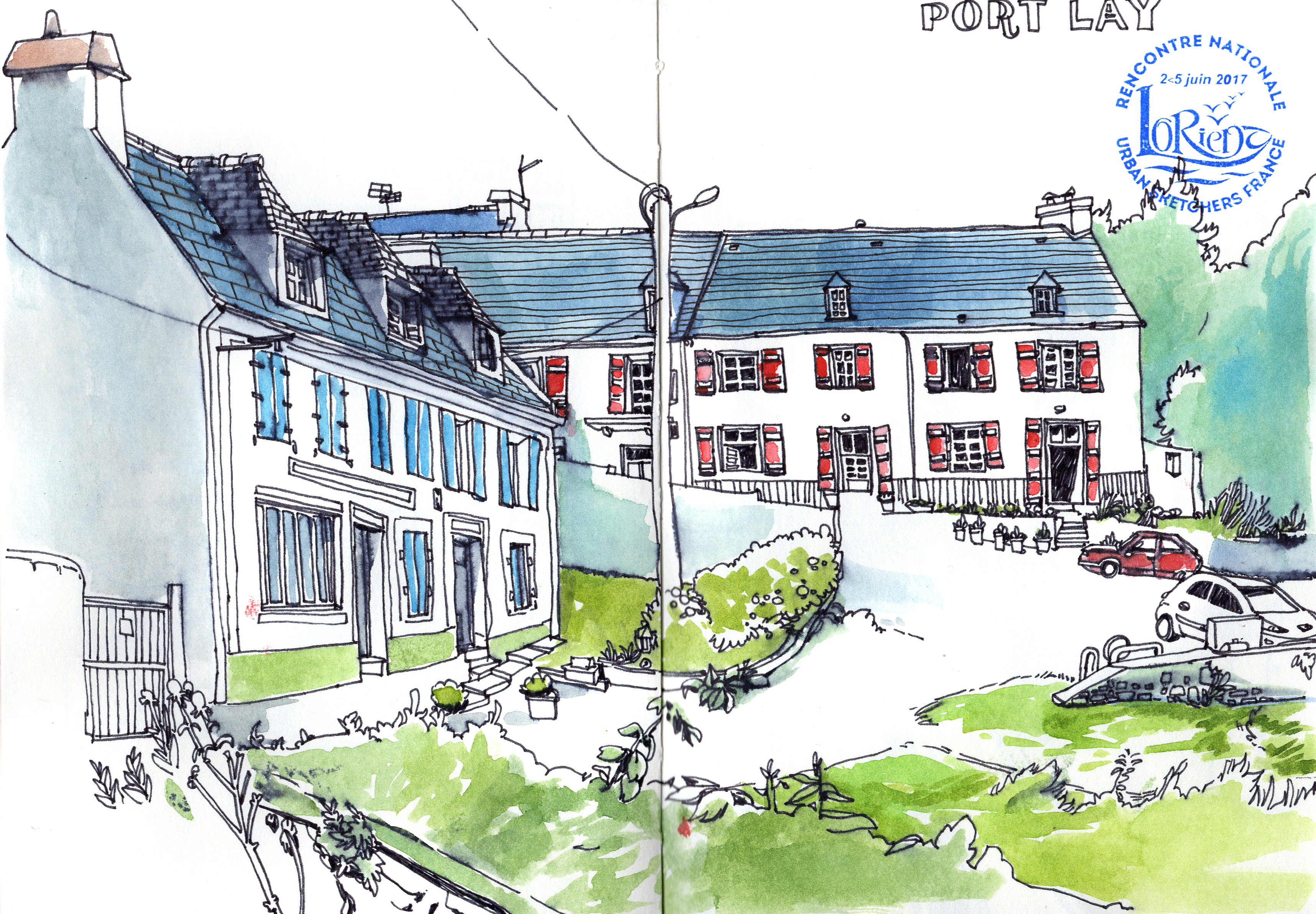 Le week-end dernier, du 2 au 5 juin, a eu lieu la 5e rencontre des Urban Sketchers France à Lorient, en Bretagne. Inutile de dire que j’attendais cette occasion depuis longtemps, découvrir la Bretagne et retrouver ma bande de carnettistes préférés. Les circonstances ont fait que je n’ai pu rester que deux jours vraiment complets, pour un premier contact longtemps attendu avec la Bretagne dont j’ai quelques origines c’est un peu court. Et de la ville de Lorient, je n’ai guère vu le centre. Les deux parcours du samedi et du dimanche nous ont fait découvrir les abords de la ville, le port de pêche, Locmiquélic ou la citadelle, sans compter une escapade d’une journée sur l’île de Groix. Un peu comme d’habitude, on rit, on tchatche, on dessine, on évite les mouettes qui chient sur les carnets, et on rentre chez soi complètement ivres de l’air marin qui nous vient de l’océan. Oui et ivres de vin et de cidre, un peu. Par contre j’ai complètement chié dans la colle, pas eu l’occasion de manger une seule galette du séjour! Enfin, m’en fous, je reviendrai!