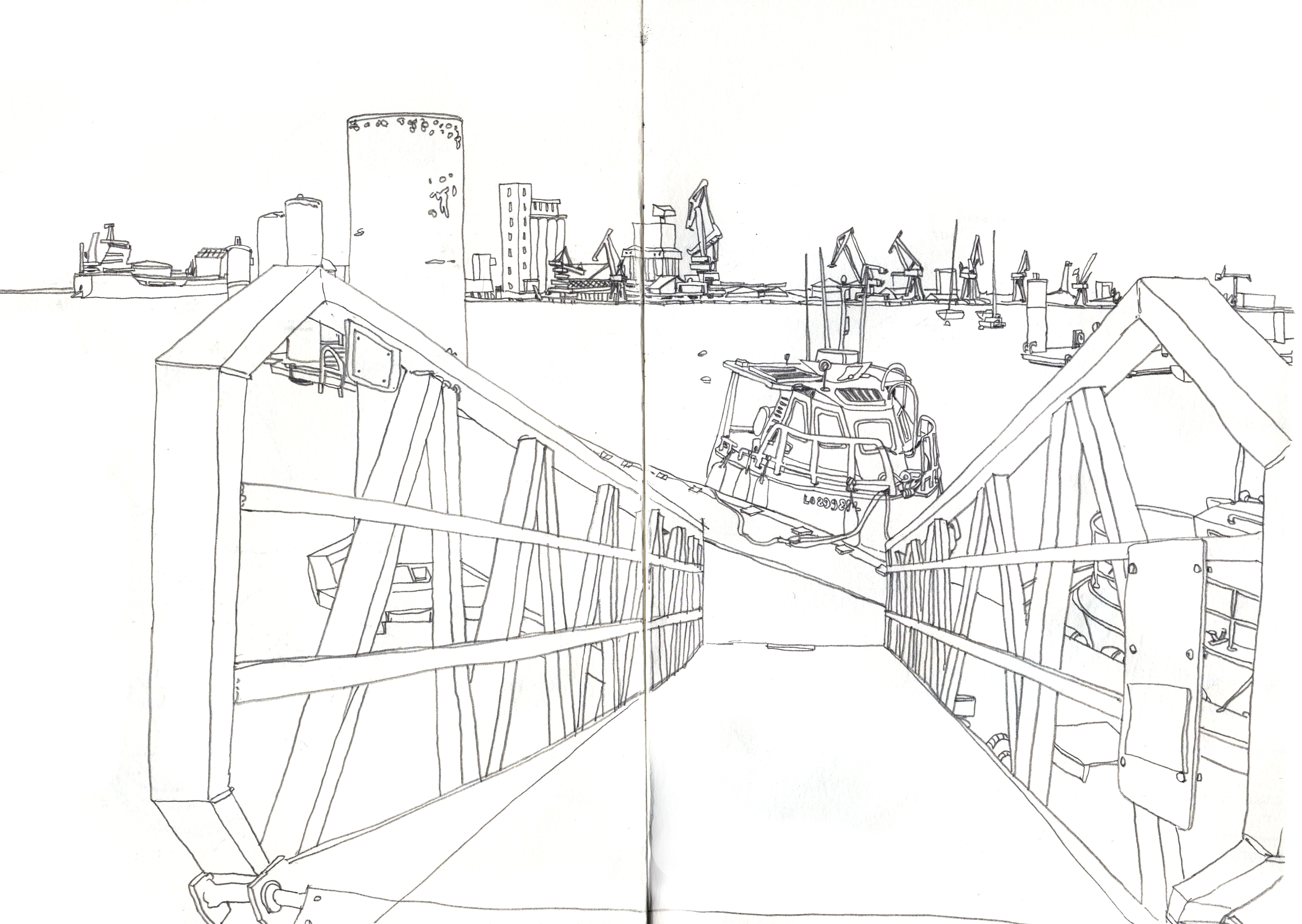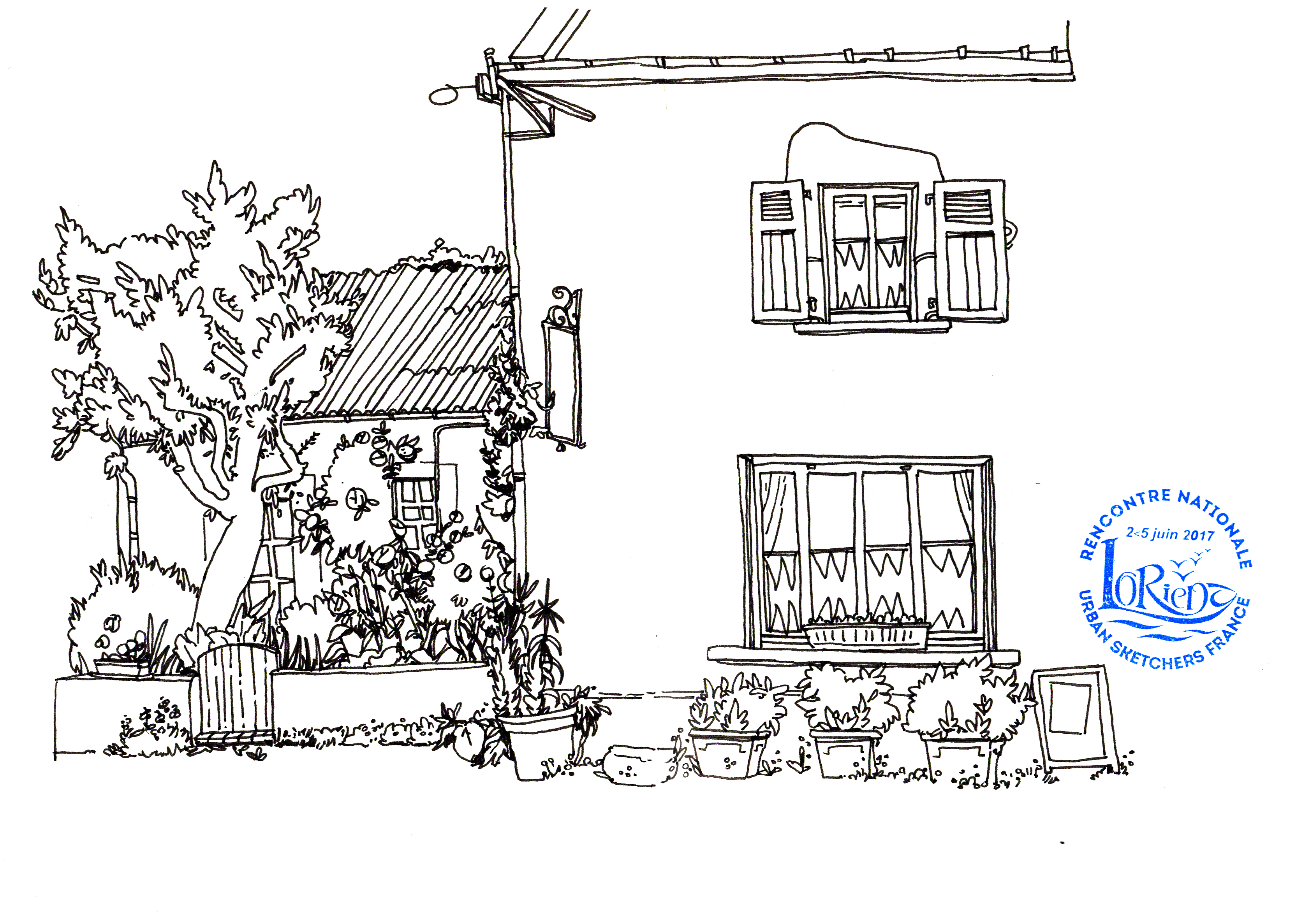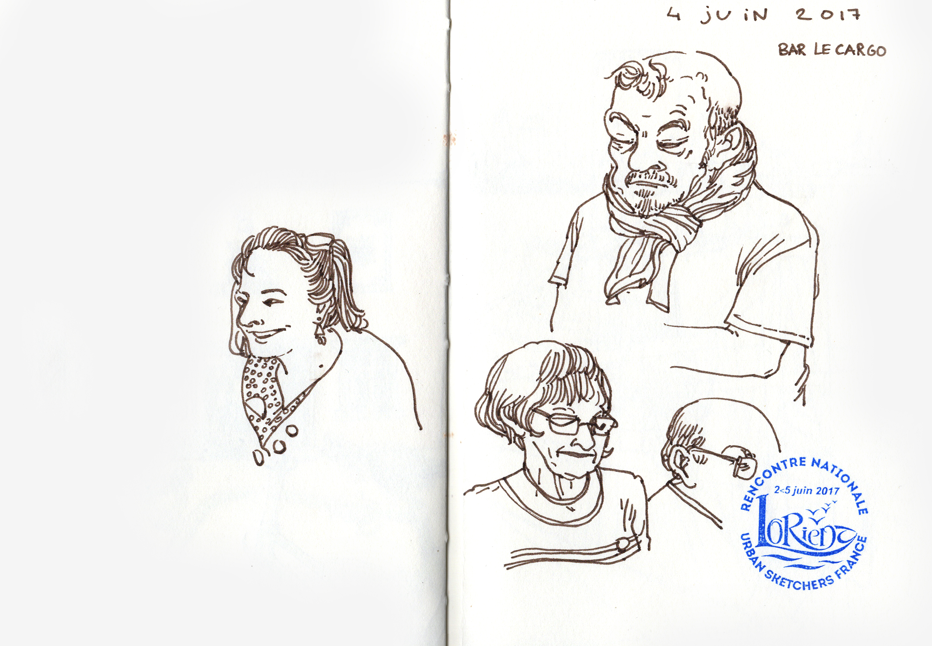 Le week-end dernier, du 2 au 5 juin, a eu lieu la 5e rencontre des Urban Sketchers France à Lorient, en Bretagne. Inutile de dire que j’attendais cette occasion depuis longtemps, découvrir la Bretagne et retrouver ma bande de carnettistes préférés. Les circonstances ont fait que je n’ai pu rester que deux jours vraiment complets, pour un premier contact longtemps attendu avec la Bretagne dont j’ai quelques origines c’est un peu court. Et de la ville de Lorient, je n’ai guère vu le centre. Les deux parcours du samedi et du dimanche nous ont fait découvrir les abords de la ville, le port de pêche, Locmiquélic ou la citadelle, sans compter une escapade d’une journée sur l’île de Groix. Un peu comme d’habitude, on rit, on tchatche, on dessine, on évite les mouettes qui chient sur les carnets, et on rentre chez soi complètement ivres de l’air marin qui nous vient de l’océan. Oui et ivres de vin et de cidre, un peu. Par contre j’ai complètement chié dans la colle, pas eu l’occasion de manger une seule galette du séjour! Enfin, m’en fous, je reviendrai!