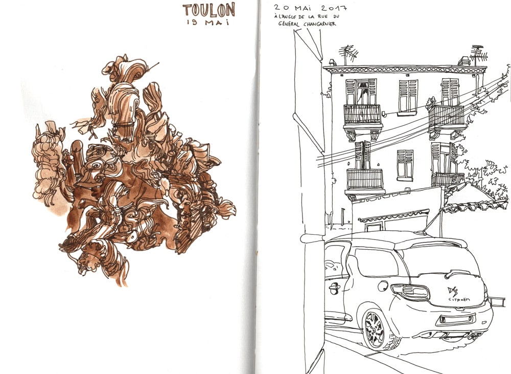 J’ai passé quelques jours chez ma mère en mai dernier. L’occasion de me poser après une période compliquée, de retrouver mon chat en pension chez elle. Je réalise que, si j’ai souvent pris les rues de Toulon en photo depuis que j’ai mon Canon 550D, je ne me suis jamais attardée à crobarder ma ville de naissance. J’ai pris le réflexe d’aller chercher ma cade le matin, pendant le marché du cours Lafayette, de sortir mes crayons et mon tabouret, et de rentrer aider ma mère avant que les premières chaleurs n’assomment. J’apprécie de plus en plus cette ville, que j’ai pris tant de plaisir à détester (ha, être ado à Toulon…) Vraiment, manquerait plus que ça…
