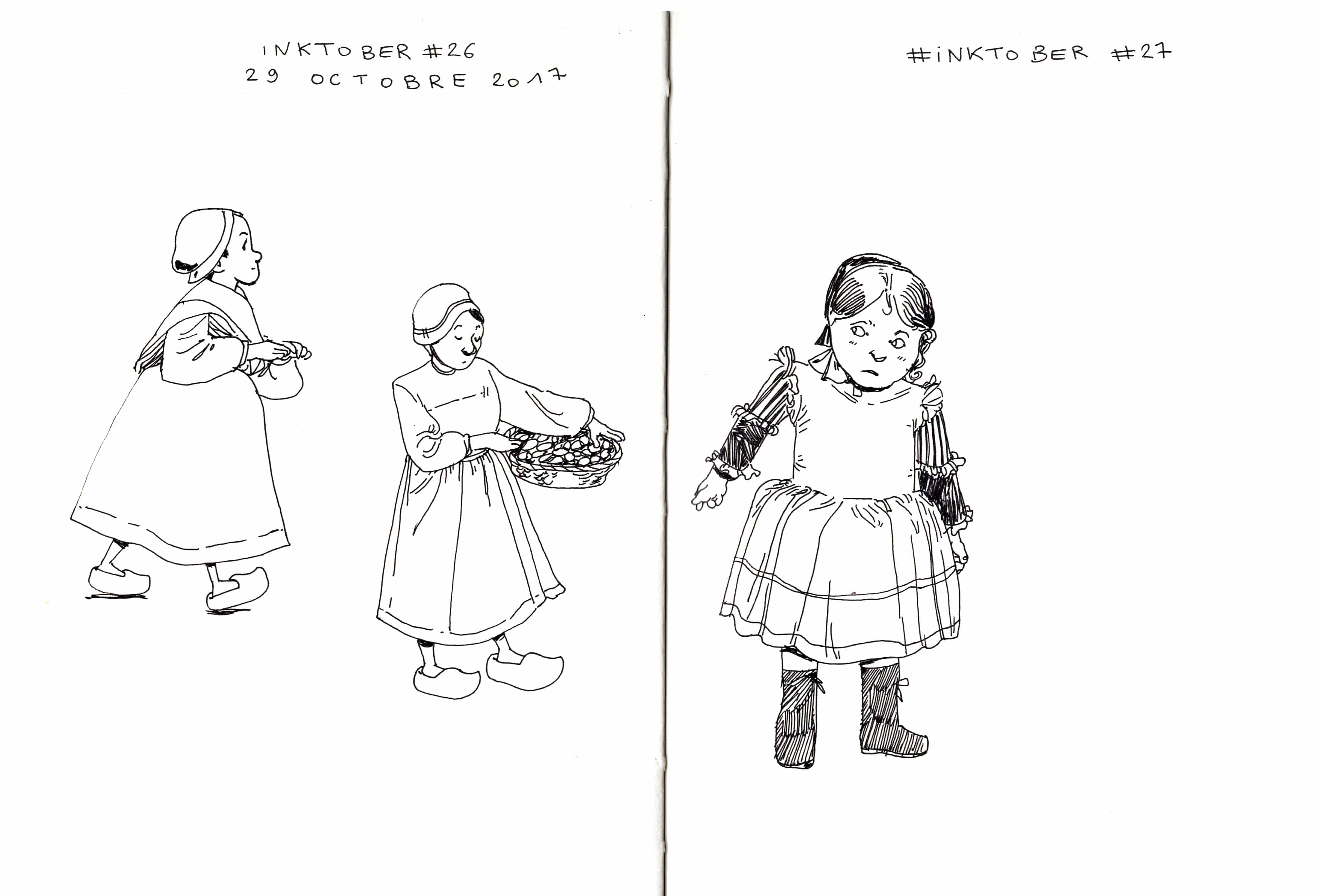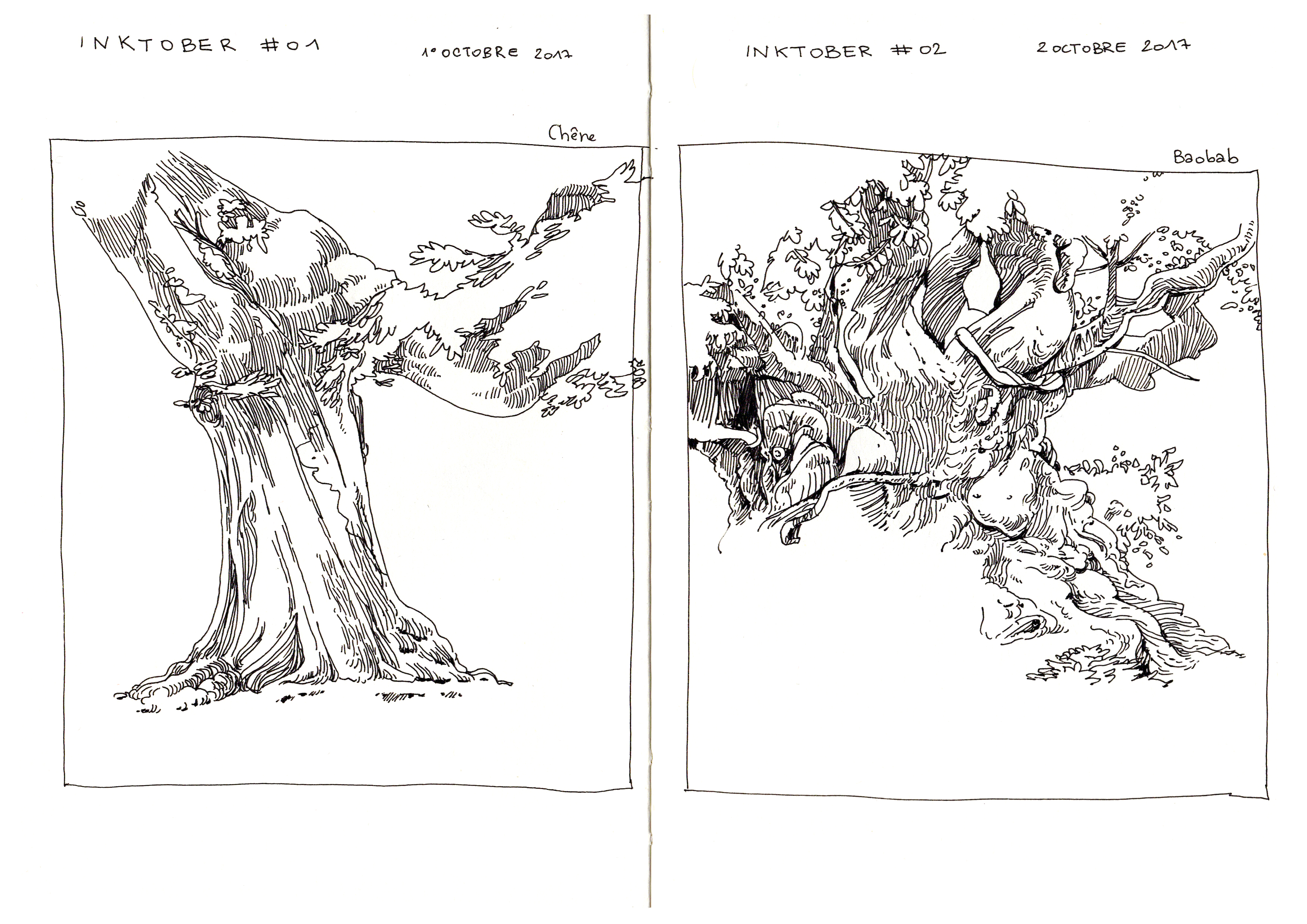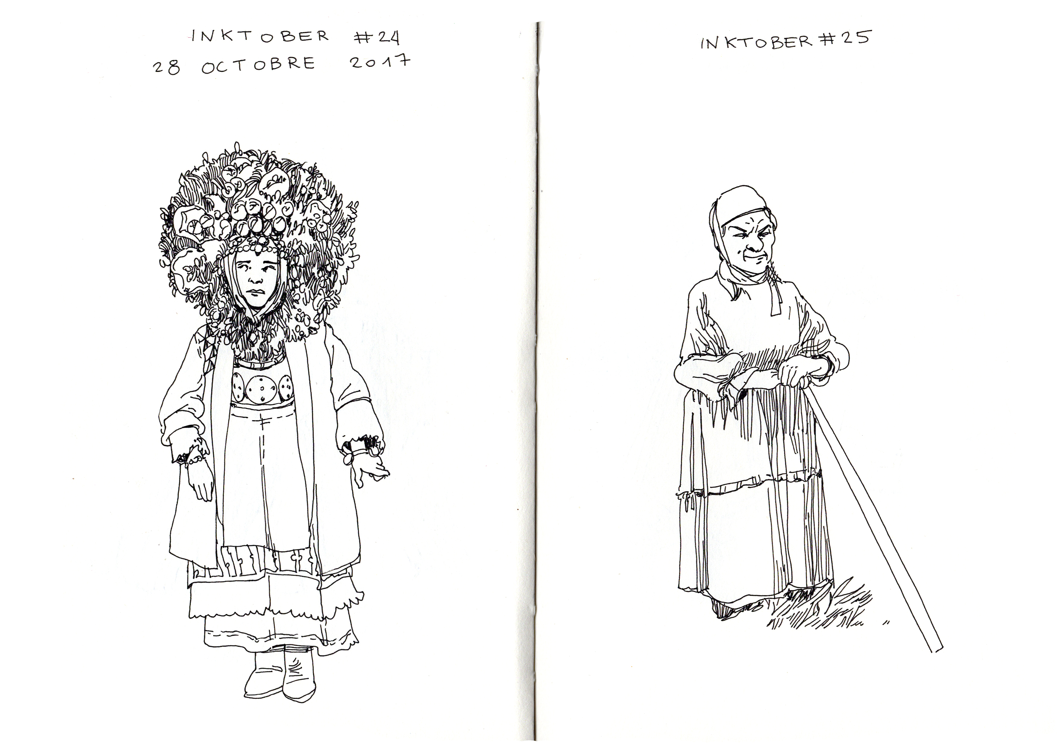 L’année dernière (comme en 2014, 2015 et 2016), je me suis lancée dans ce qui est devenu une petite tradition: le challenge Inktober. Beaucoup dépassent du but de base, en réalisant tout simplement une nouvelle illustration tous les jours du mois d’octobre. Beaucoup se sont pincés du nez en voyant affluer les dessins en couleur, en peinture ou en numérique. Un peu opposé au but de base, selon moi, où le créateur du challenge s’était donné pour but de se contraindre au dessin à l’encre, stylo ou plume, et donc sur papier traditionnel. Je reste volontairement dans cette optique, je n’ai pas de compétences particulières à affiner, je veux juste m’amuser sans être collée à un écran. Et puis après tout, peu importe le médium, tant que le défi est relevé!