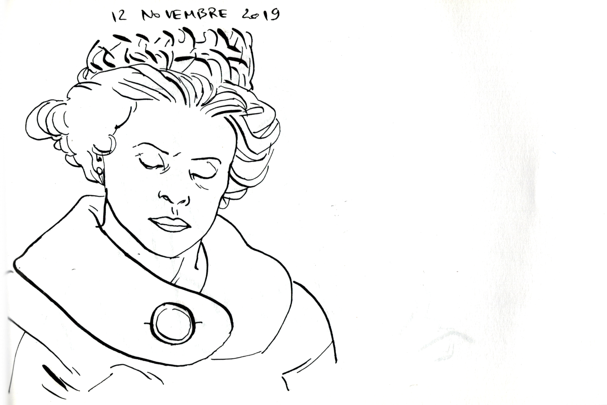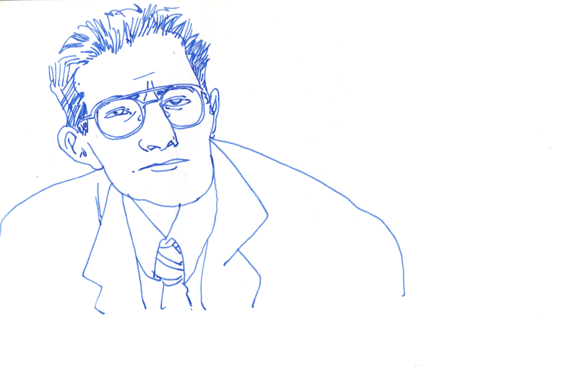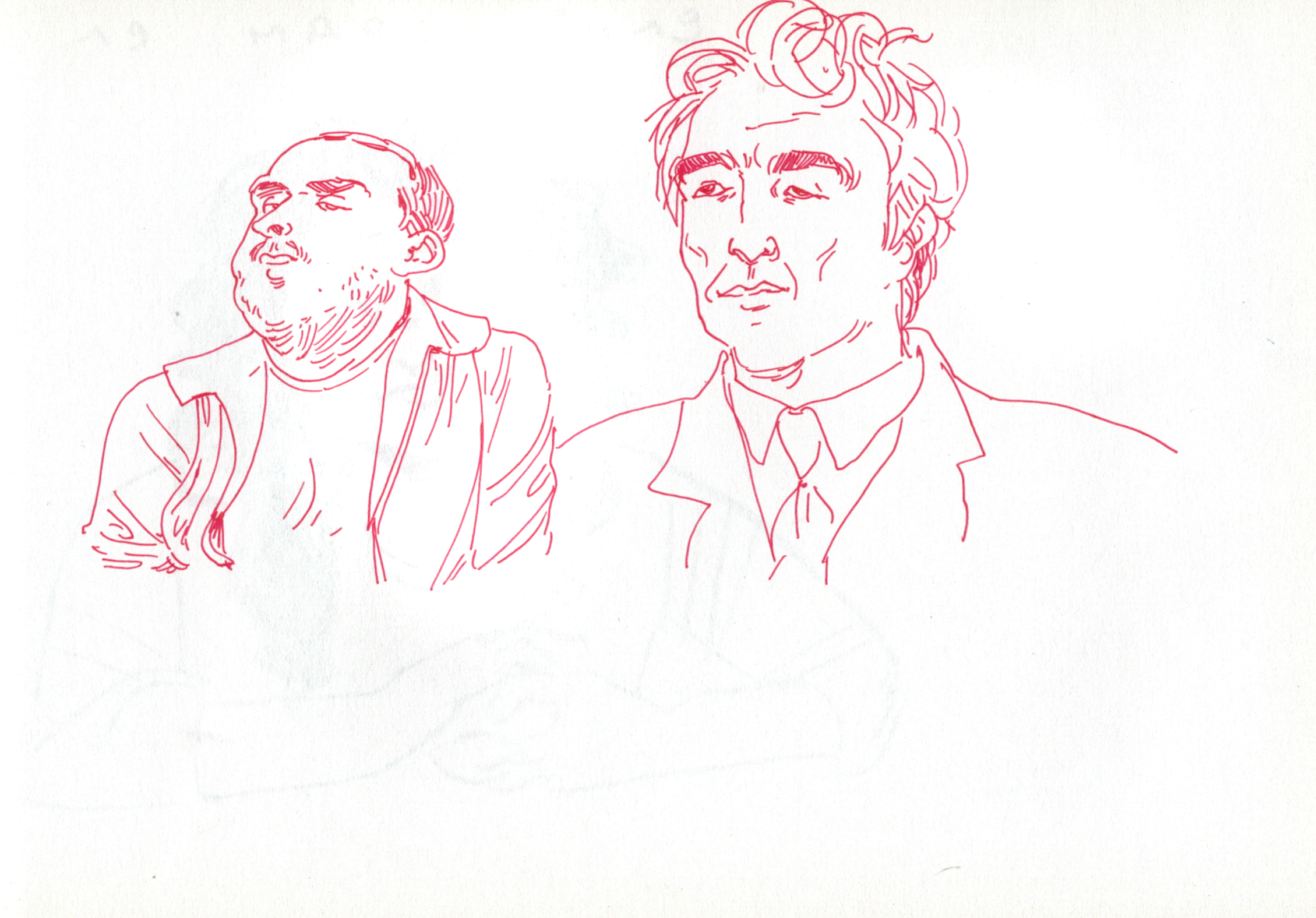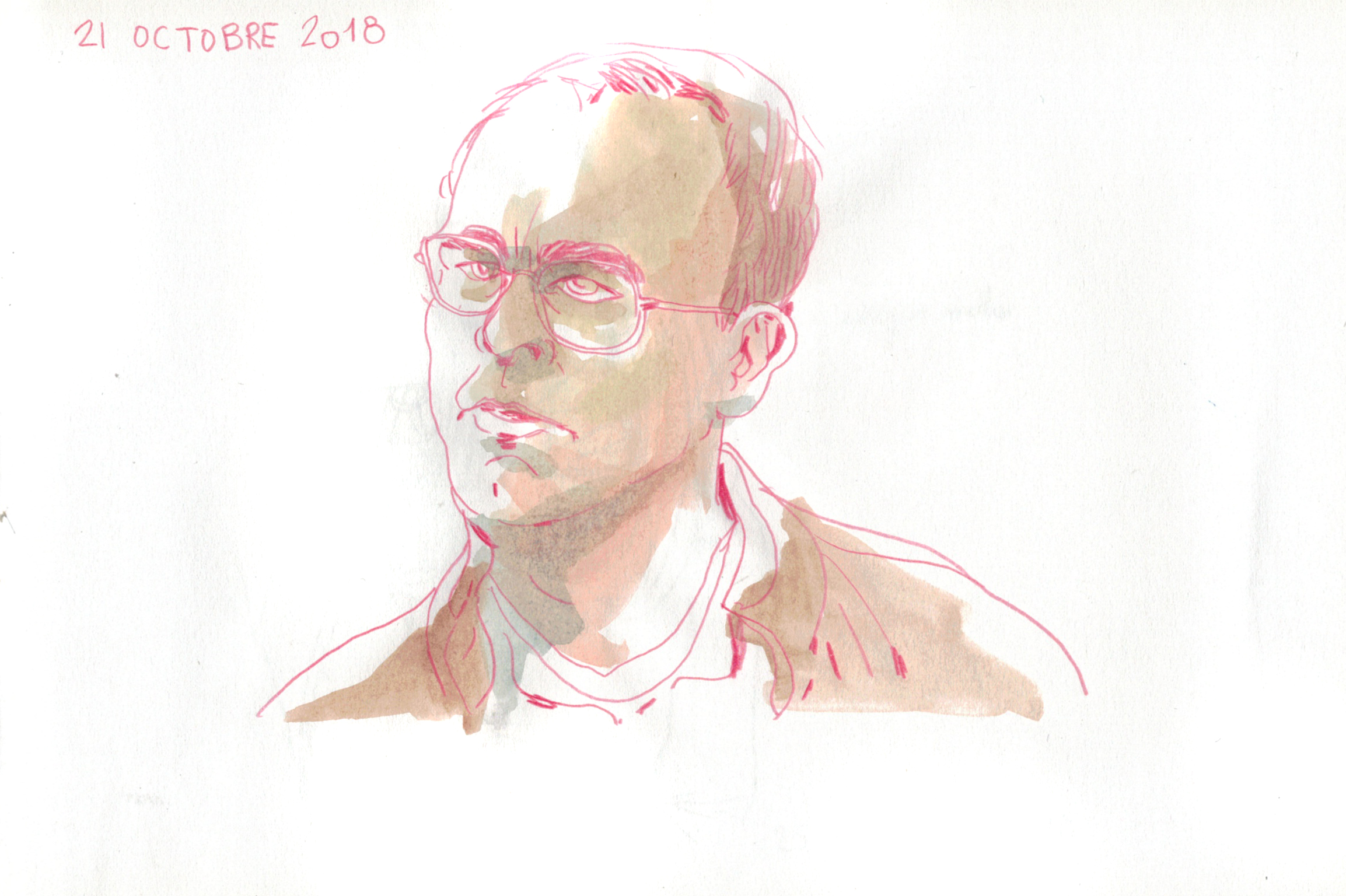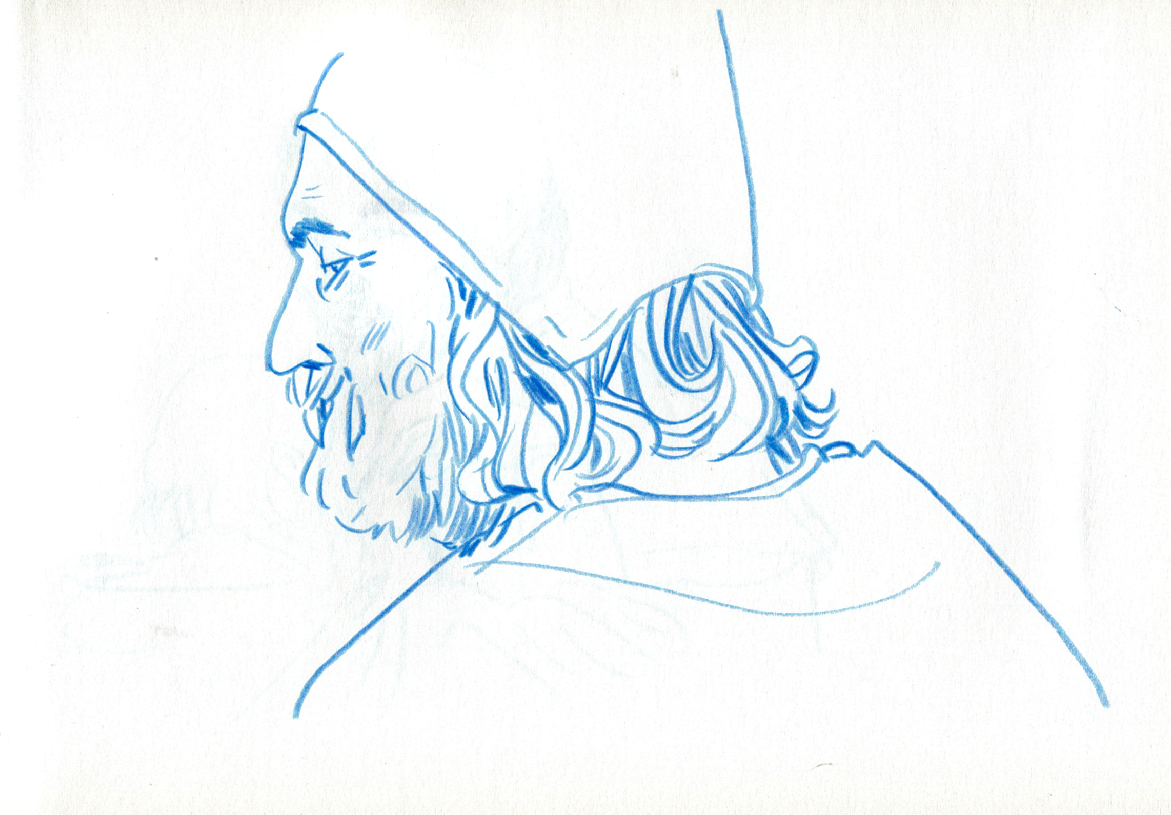 Pour ce carnet, un carnet acheté à New York par ma mère, j’avais hésité à faire cette fois une série de portraits en couleurs. Raté: le papier est très très basique, du papier machine quoi. Pour l’encre, l’aquarelle, voire les crayons de couleurs, on oublie, tout parait fadasse, quand le papier n’est pas carrément ruiné. Cela m’a laissé toute une gamme de possibilité: j’en avais un peu marre du stylo Muji 0,38mm alors j’ai mélangé les genres: stylo plume Lamy, crayon papier, stylo bille, Polychromos, Col-Erase, pour finir par une technique un peu aléatoire quand c’est raté, mais très satisfaisante quand c’est réussi, c’est-à-dire une bête plume Sergent Major avec de l’encre de Chine. On peut dire ce qu’on veut, le grattement de la plume sur le papier, et les effets de pleins et de déliés, ça fait toujours son petit effet…