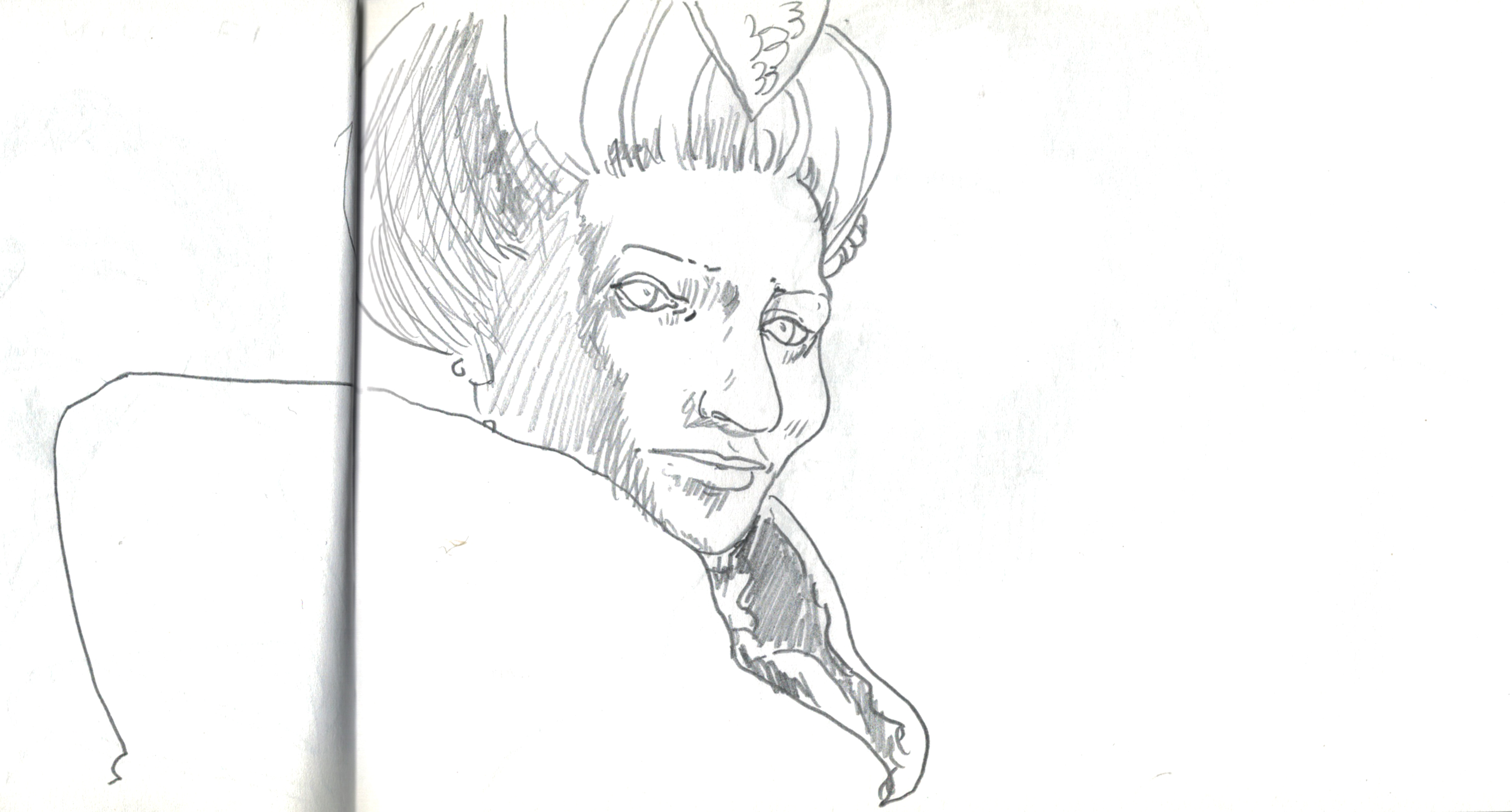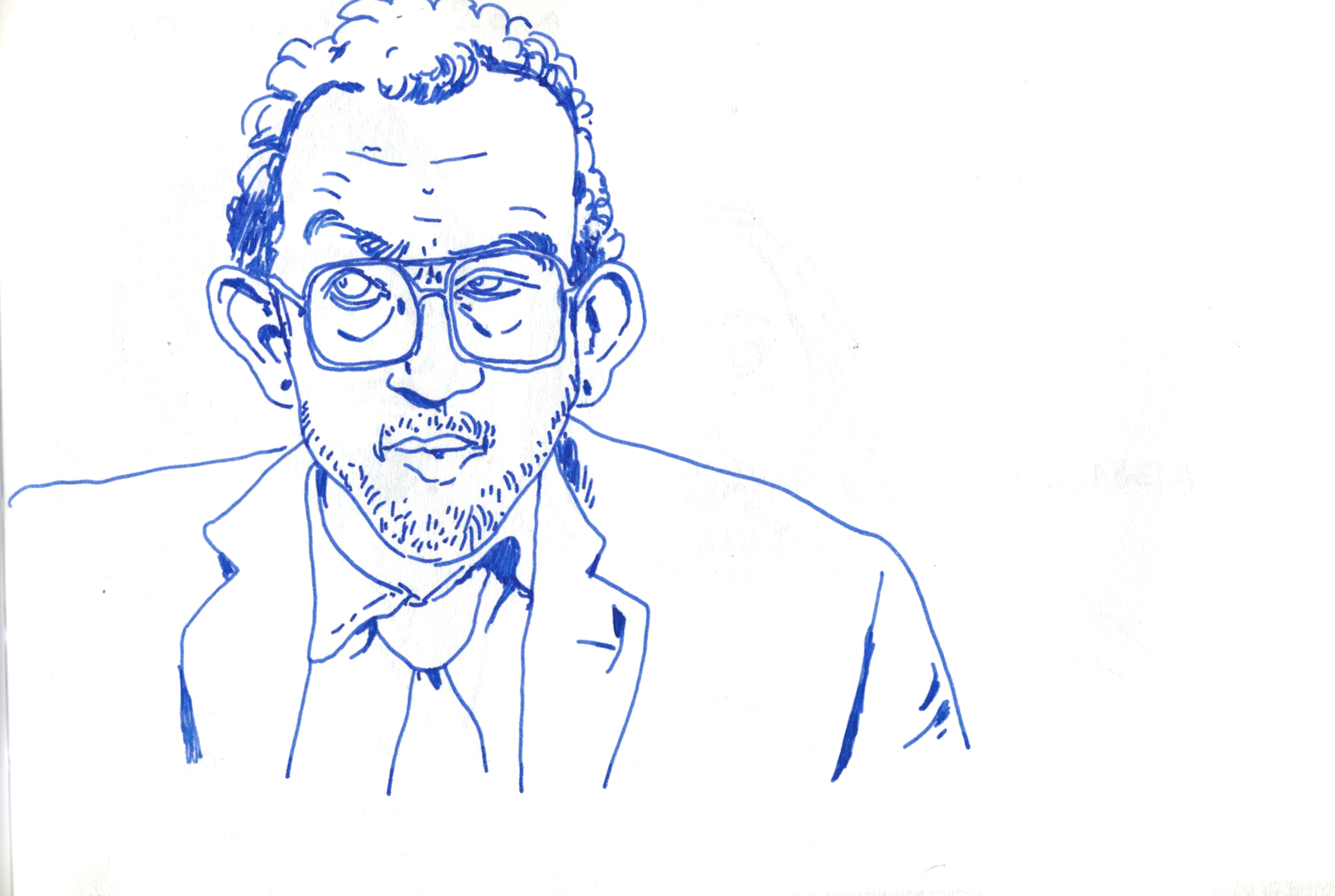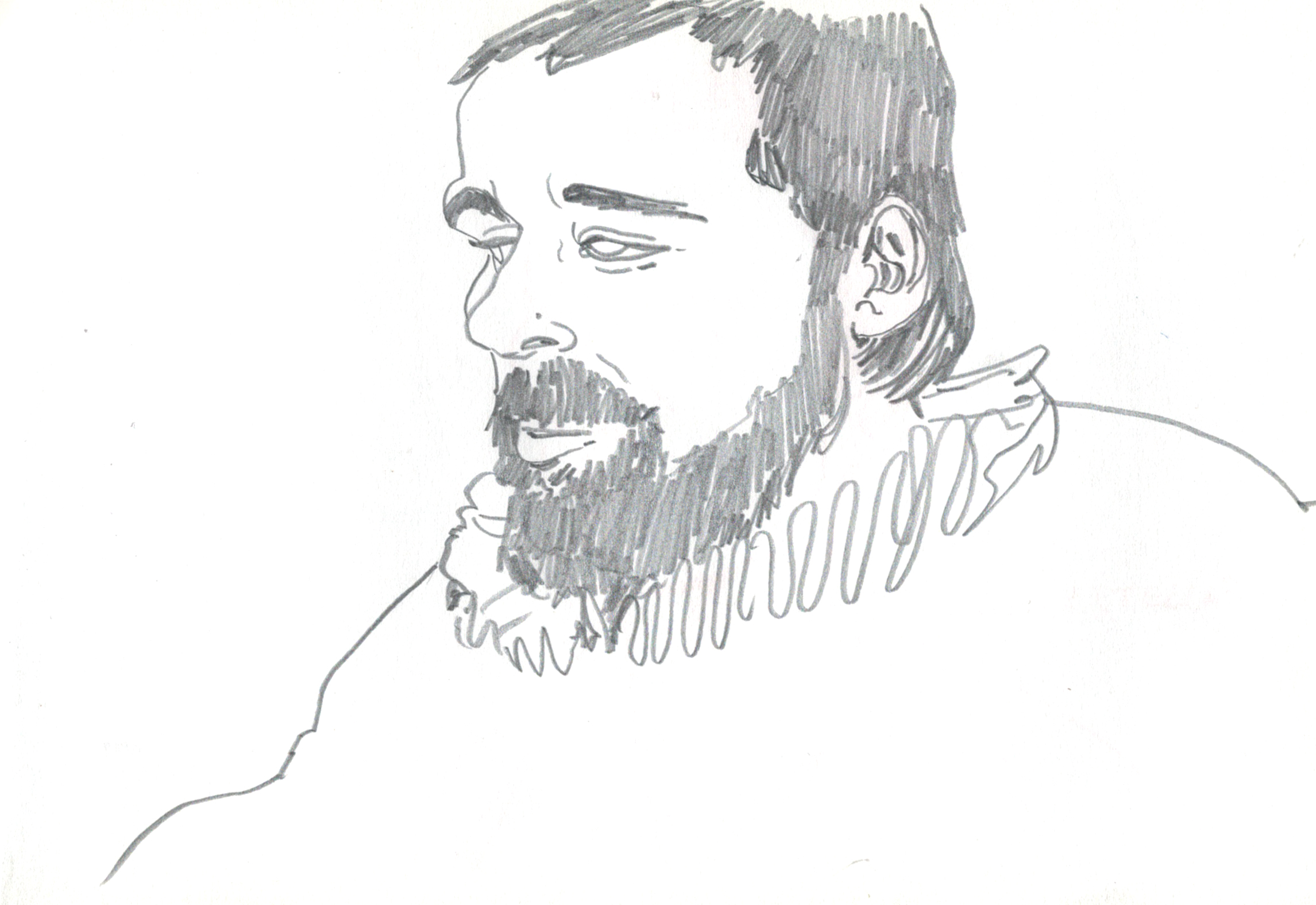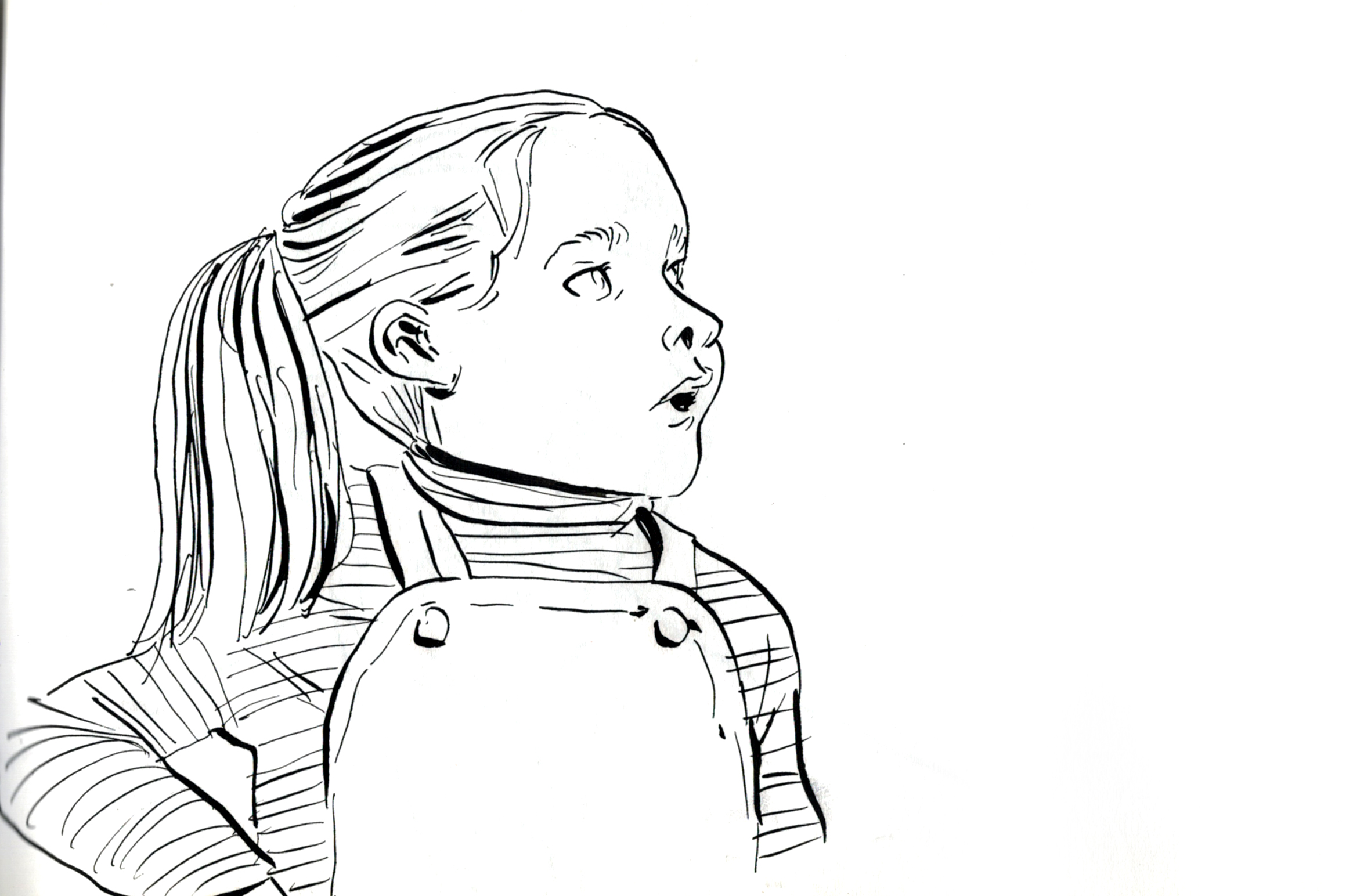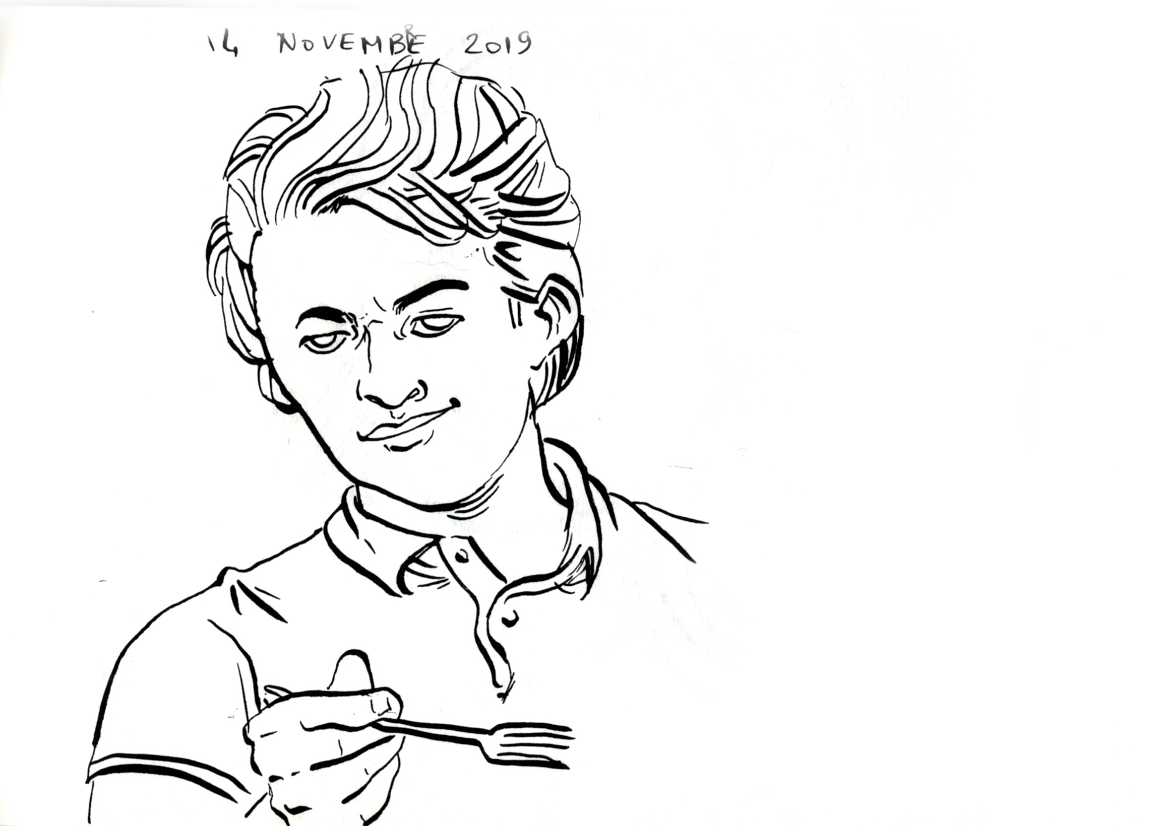 Pour ce carnet, un carnet acheté à New York par ma mère, j’avais hésité à faire cette fois une série de portraits en couleurs. Raté: le papier est très très basique, du papier machine quoi. Pour l’encre, l’aquarelle, voire les crayons de couleurs, on oublie, tout parait fadasse, quand le papier n’est pas carrément ruiné. Cela m’a laissé toute une gamme de possibilité: j’en avais un peu marre du stylo Muji 0,38mm alors j’ai mélangé les genres: stylo plume Lamy, crayon papier, stylo bille, Polychromos, Col-Erase, pour finir par une technique un peu aléatoire quand c’est raté, mais très satisfaisante quand c’est réussi, c’est-à-dire une bête plume Sergent Major avec de l’encre de Chine. On peut dire ce qu’on veut, le grattement de la plume sur le papier, et les effets de pleins et de déliés, ça fait toujours son petit effet…
