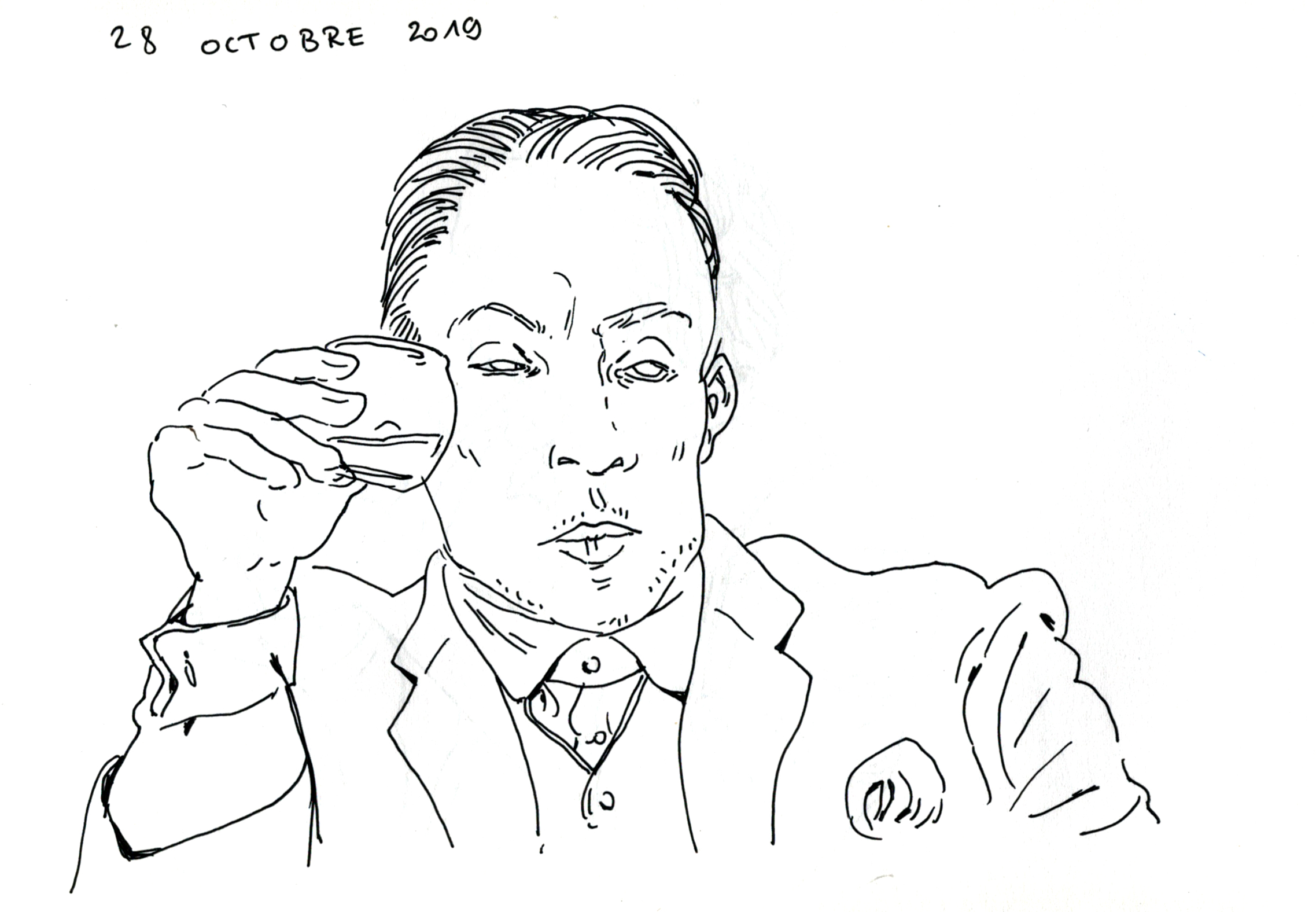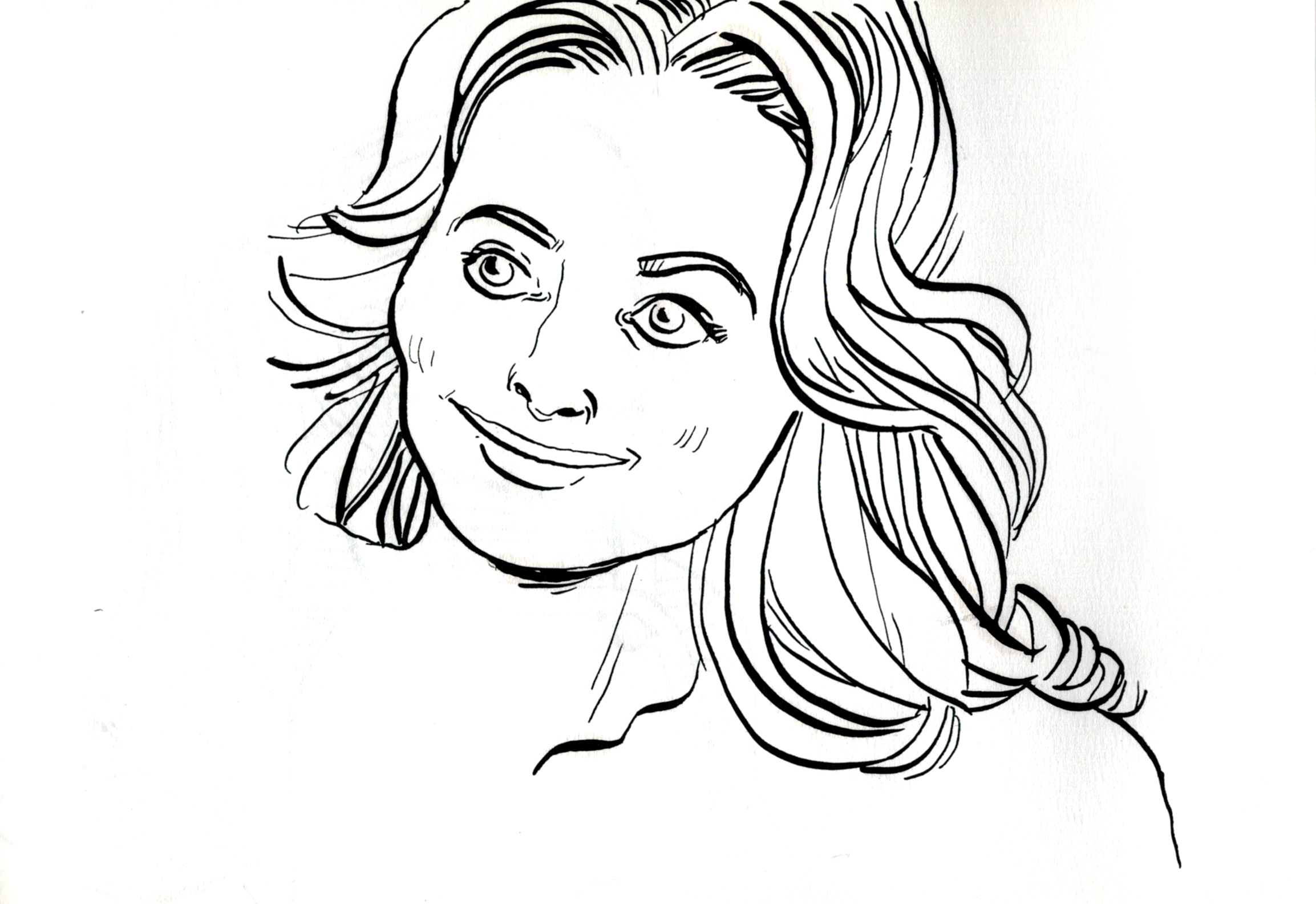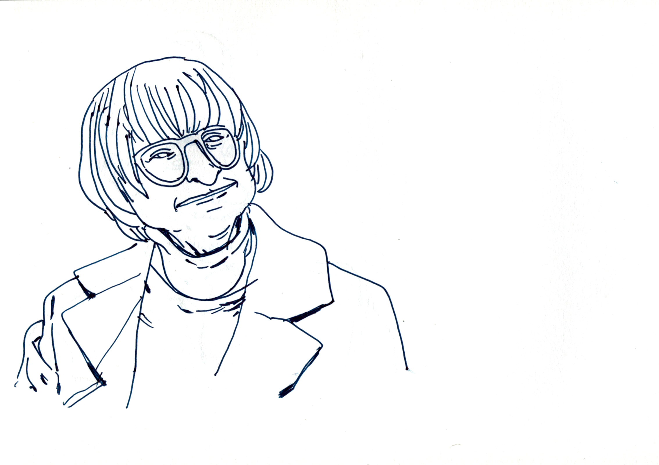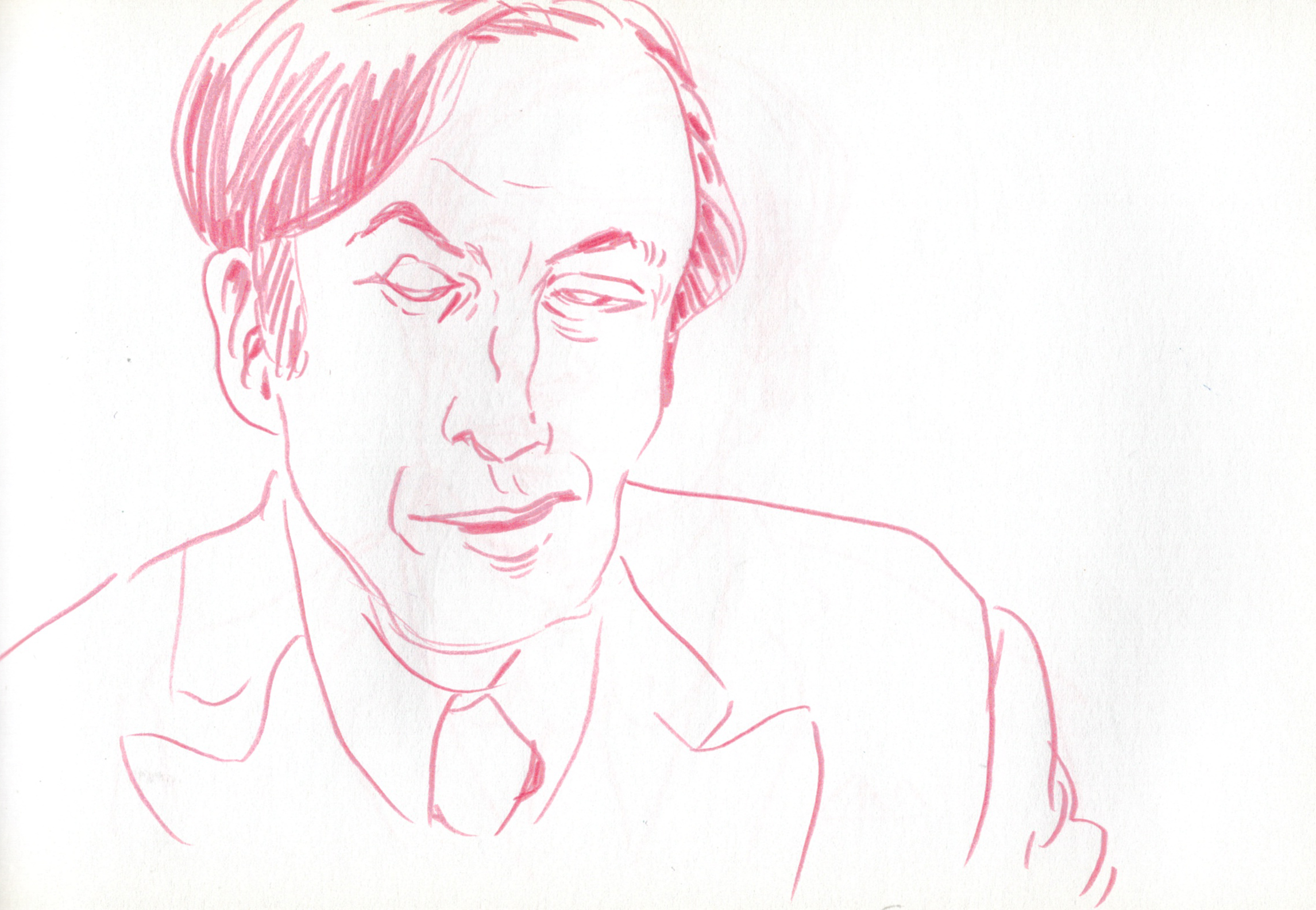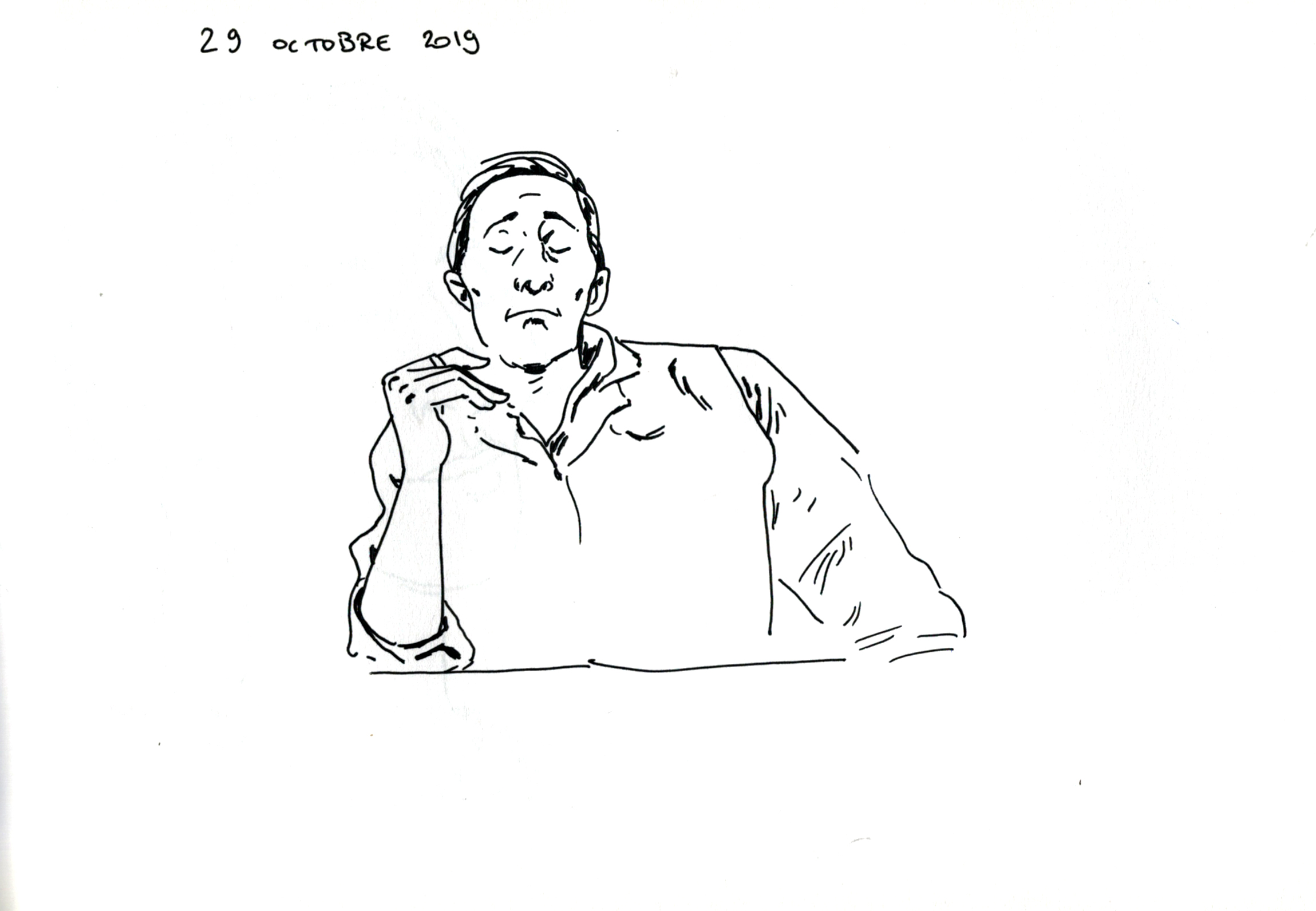 Pour ce carnet, un carnet acheté à New York par ma mère, j’avais hésité à faire cette fois une série de portraits en couleurs. Raté: le papier est très très basique, du papier machine quoi. Pour l’encre, l’aquarelle, voire les crayons de couleurs, on oublie, tout parait fadasse, quand le papier n’est pas carrément ruiné. Cela m’a laissé toute une gamme de possibilité: j’en avais un peu marre du stylo Muji 0,38mm alors j’ai mélangé les genres: stylo plume Lamy, crayon papier, stylo bille, Polychromos, Col-Erase, pour finir par une technique un peu aléatoire quand c’est raté, mais très satisfaisante quand c’est réussi, c’est-à-dire une bête plume Sergent Major avec de l’encre de Chine. On peut dire ce qu’on veut, le grattement de la plume sur le papier, et les effets de pleins et de déliés, ça fait toujours son petit effet…