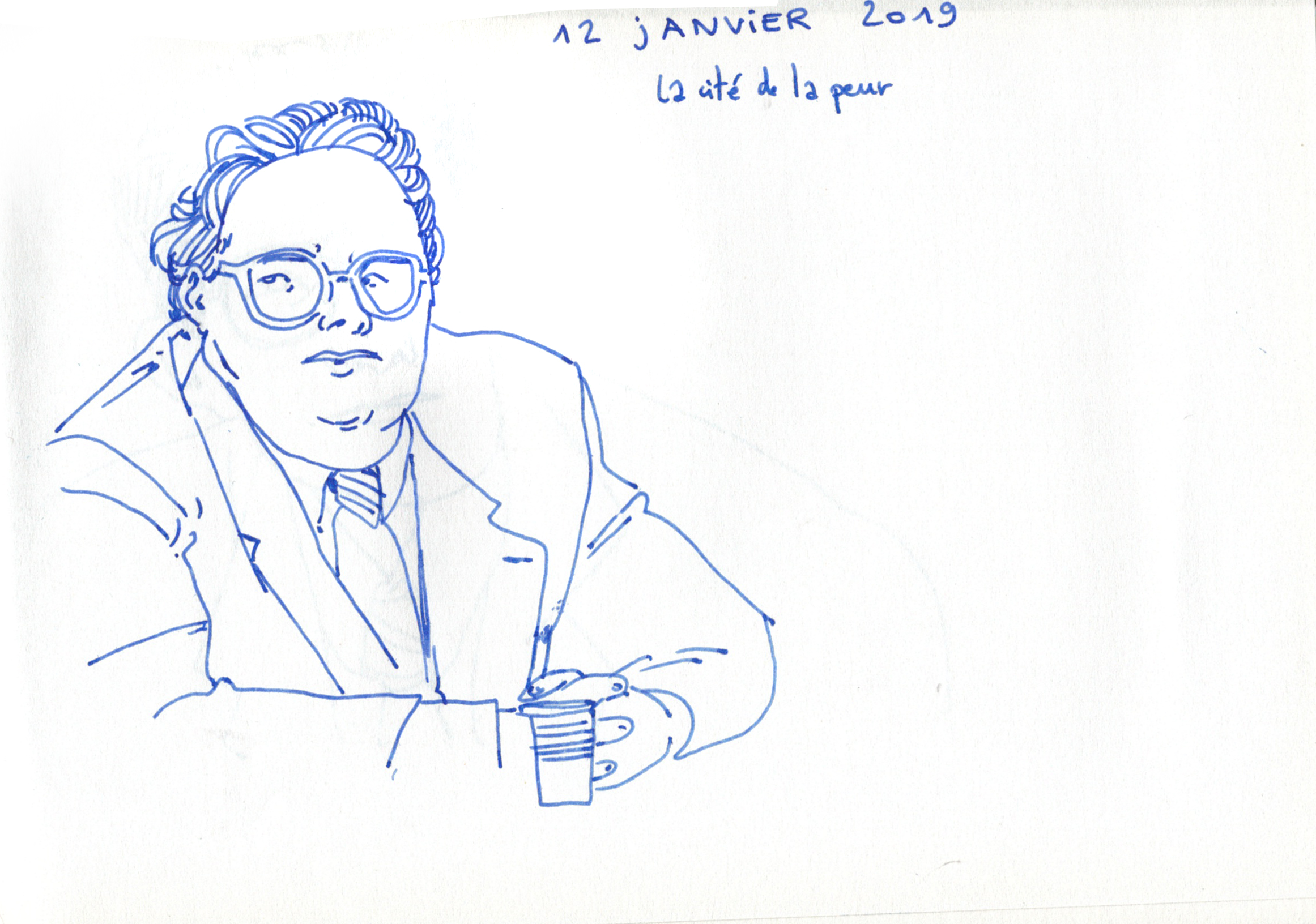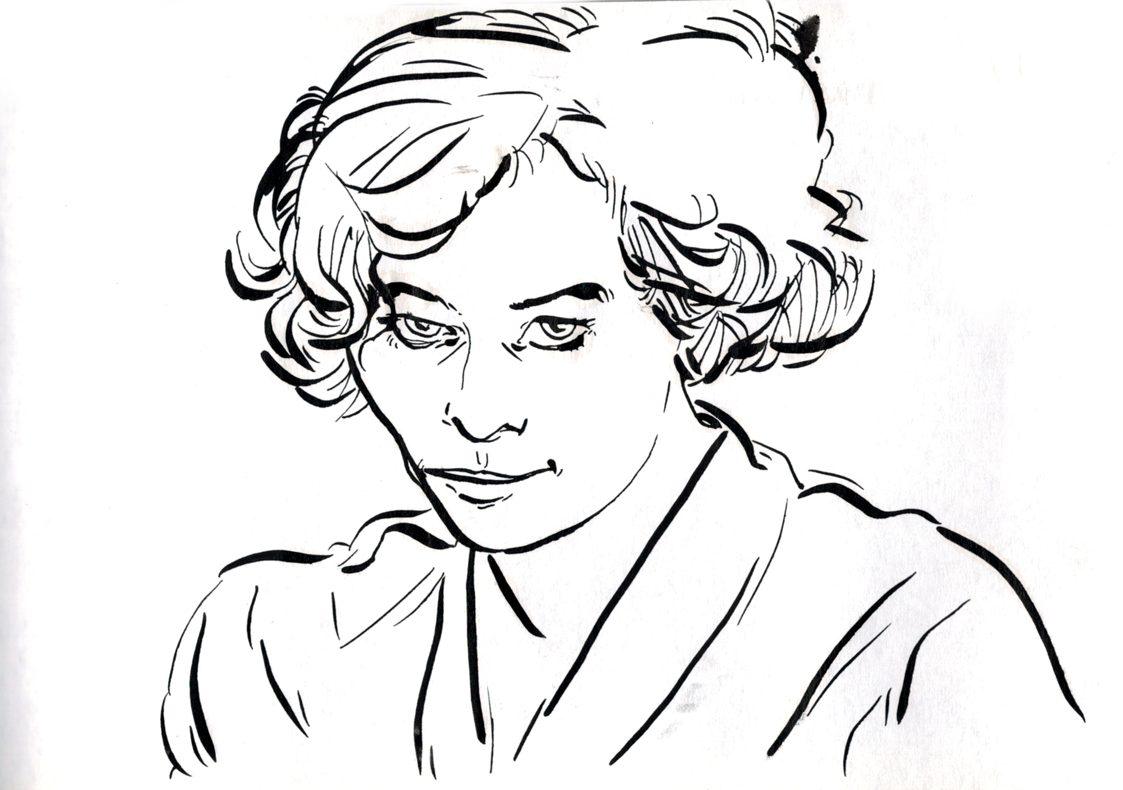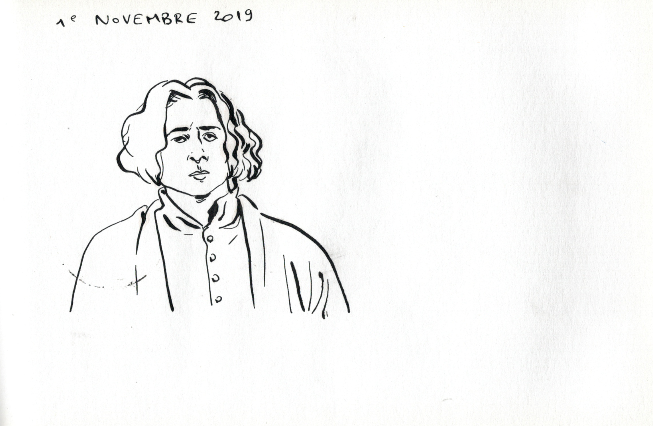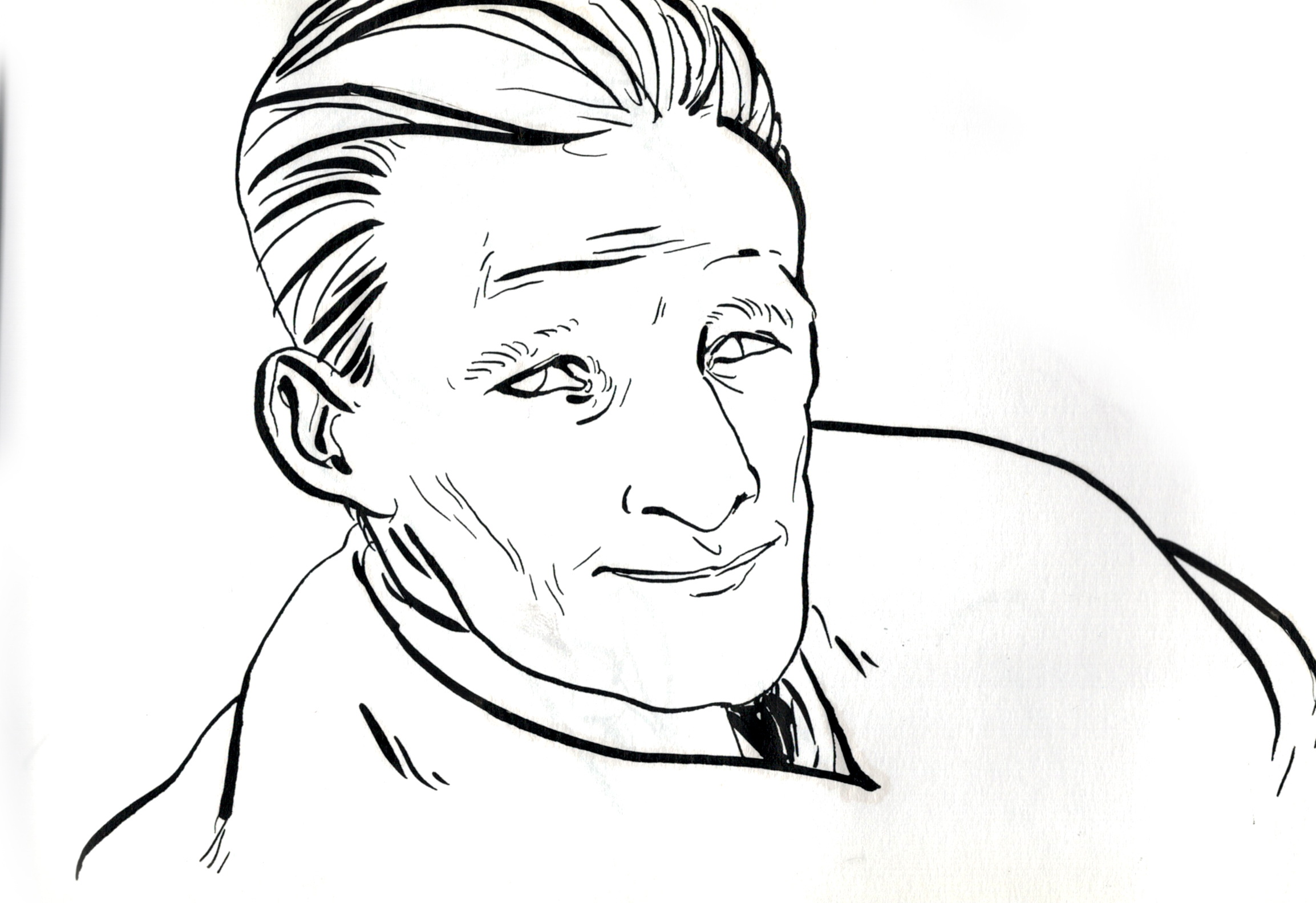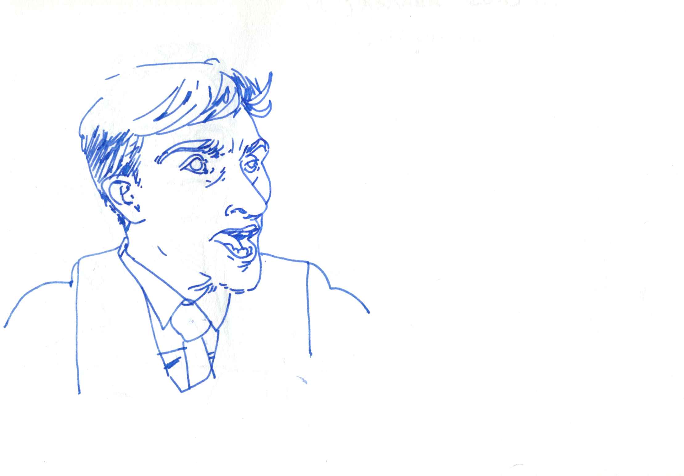 Pour ce carnet, un carnet acheté à New York par ma mère, j’avais hésité à faire cette fois une série de portraits en couleurs. Raté: le papier est très très basique, du papier machine quoi. Pour l’encre, l’aquarelle, voire les crayons de couleurs, on oublie, tout parait fadasse, quand le papier n’est pas carrément ruiné. Cela m’a laissé toute une gamme de possibilité: j’en avais un peu marre du stylo Muji 0,38mm alors j’ai mélangé les genres: stylo plume Lamy, crayon papier, stylo bille, Polychromos, Col-Erase, pour finir par une technique un peu aléatoire quand c’est raté, mais très satisfaisante quand c’est réussi, c’est-à-dire une bête plume Sergent Major avec de l’encre de Chine. On peut dire ce qu’on veut, le grattement de la plume sur le papier, et les effets de pleins et de déliés, ça fait toujours son petit effet…