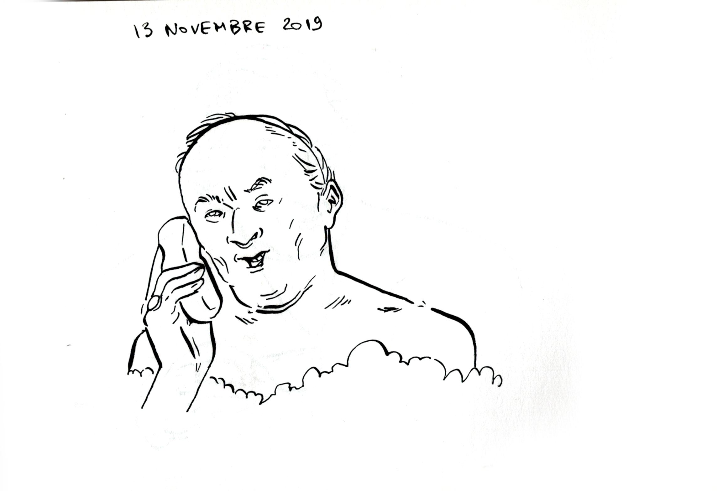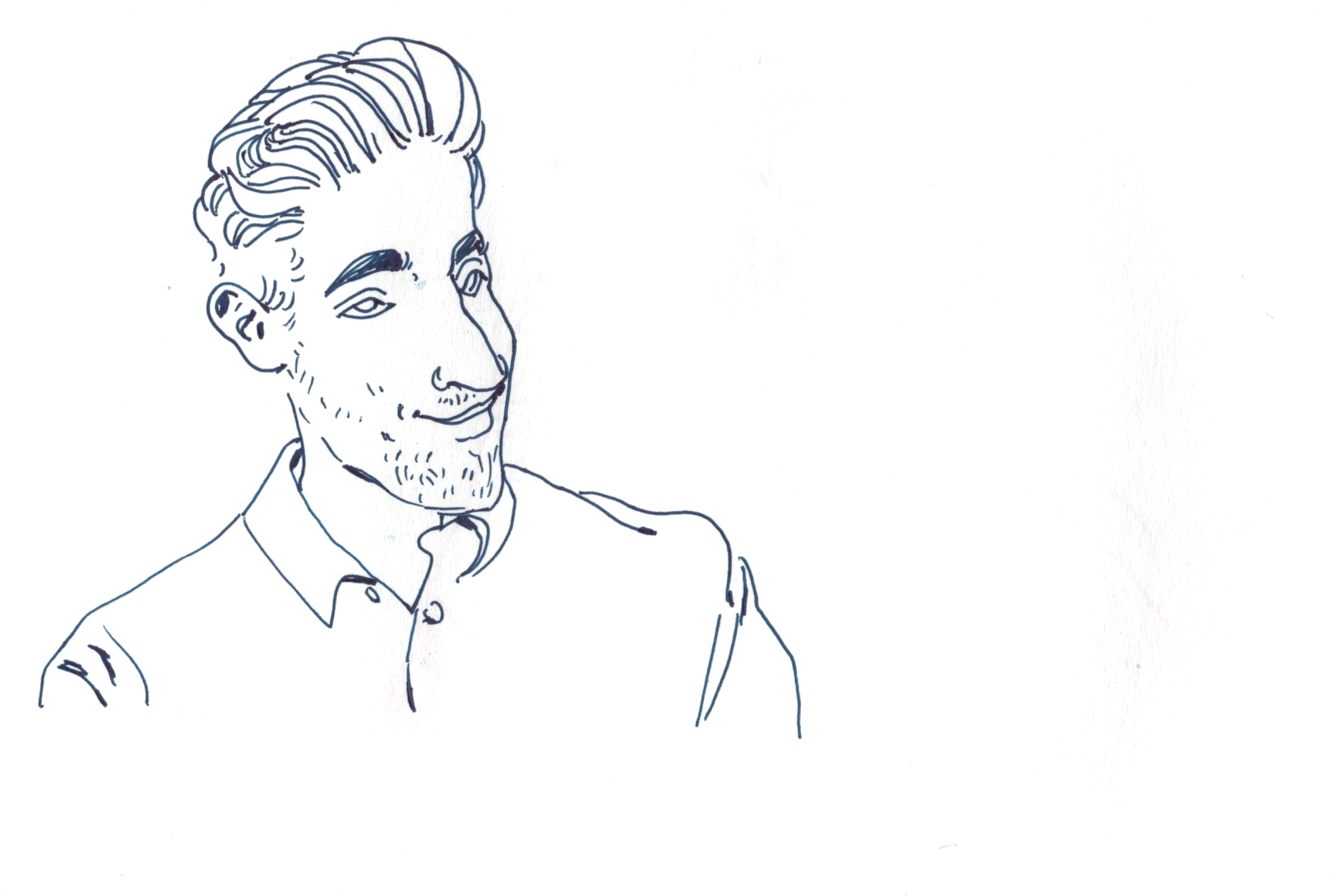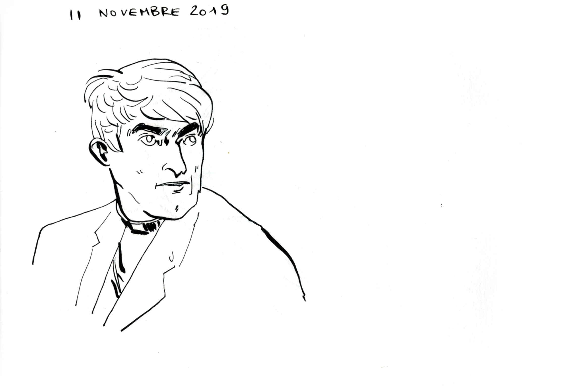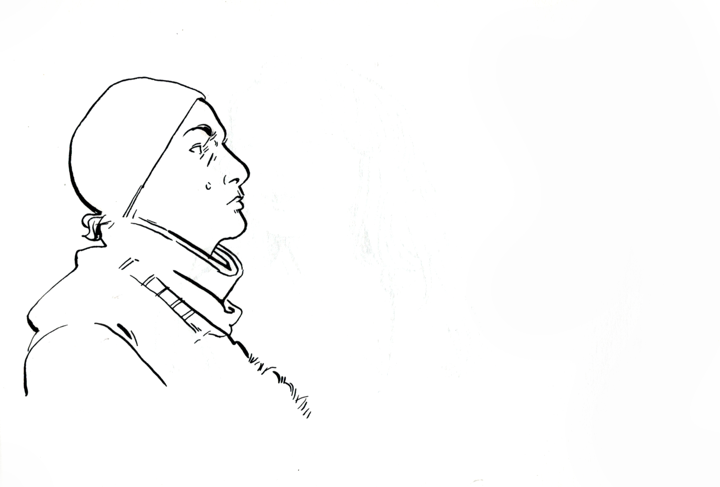 Pour ce carnet, un carnet acheté à New York par ma mère, j’avais hésité à faire cette fois une série de portraits en couleurs. Raté: le papier est très très basique, du papier machine quoi. Pour l’encre, l’aquarelle, voire les crayons de couleurs, on oublie, tout parait fadasse, quand le papier n’est pas carrément ruiné. Cela m’a laissé toute une gamme de possibilité: j’en avais un peu marre du stylo Muji 0,38mm alors j’ai mélangé les genres: stylo plume Lamy, crayon papier, stylo bille, Polychromos, Col-Erase, pour finir par une technique un peu aléatoire quand c’est raté, mais très satisfaisante quand c’est réussi, c’est-à-dire une bête plume Sergent Major avec de l’encre de Chine. On peut dire ce qu’on veut, le grattement de la plume sur le papier, et les effets de pleins et de déliés, ça fait toujours son petit effet…