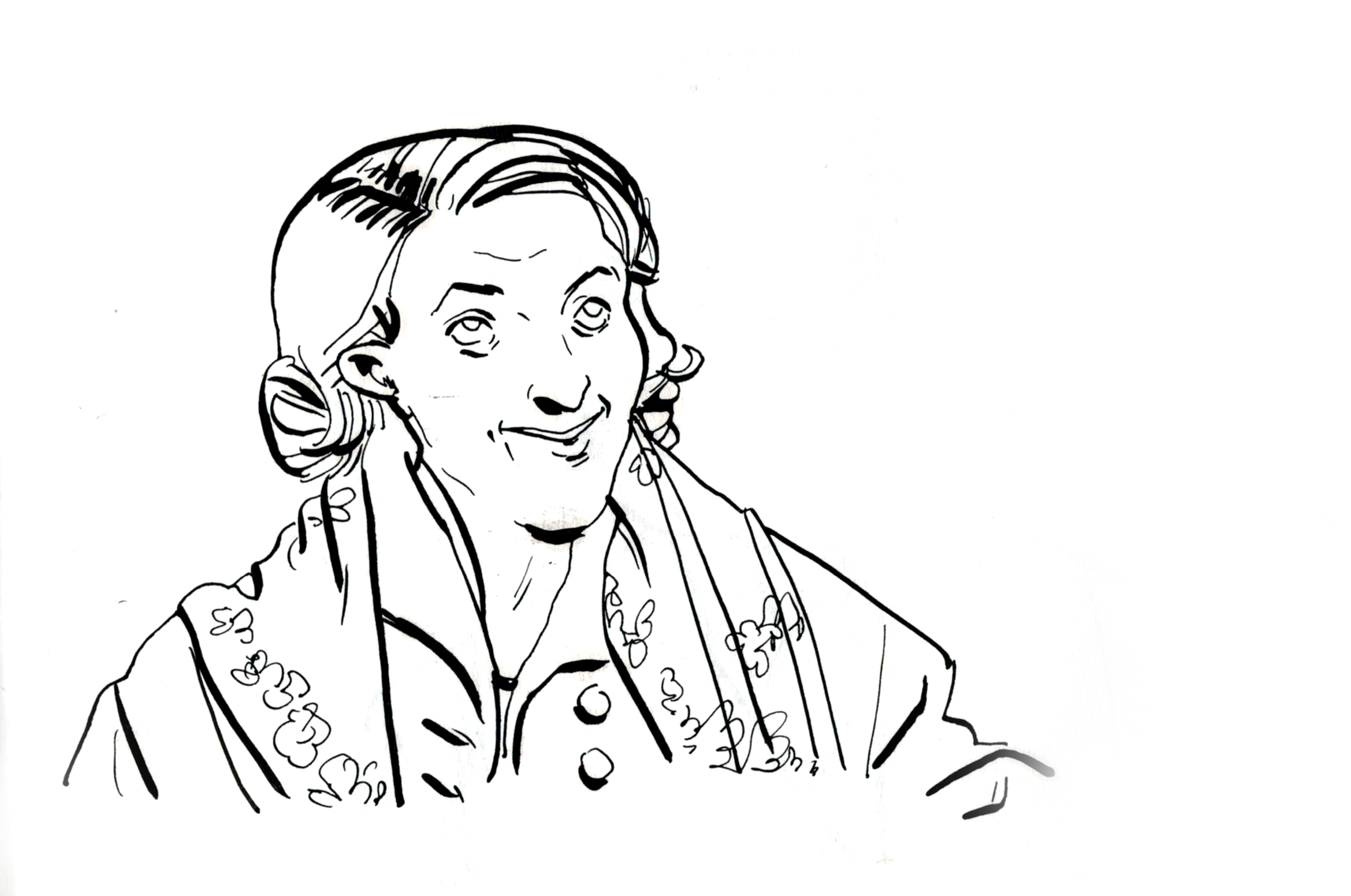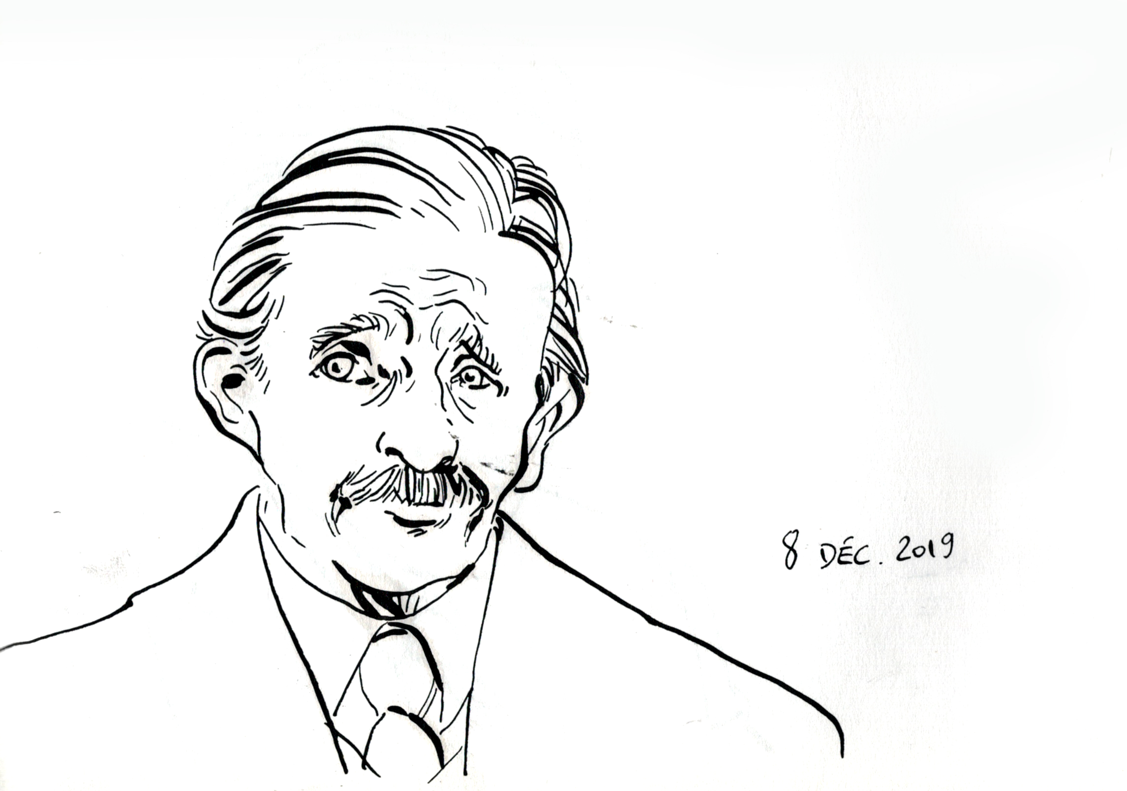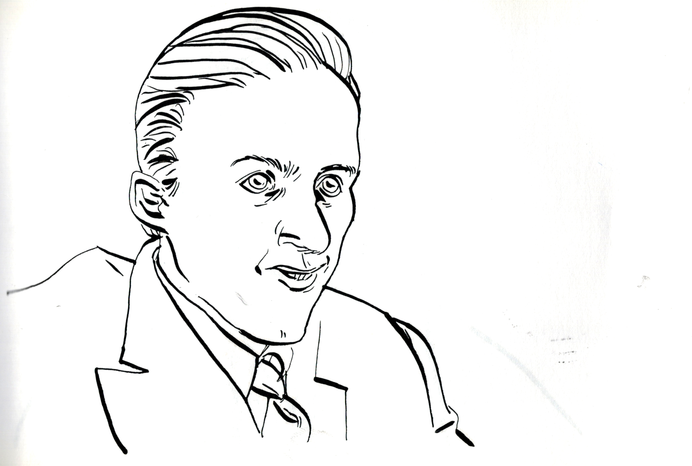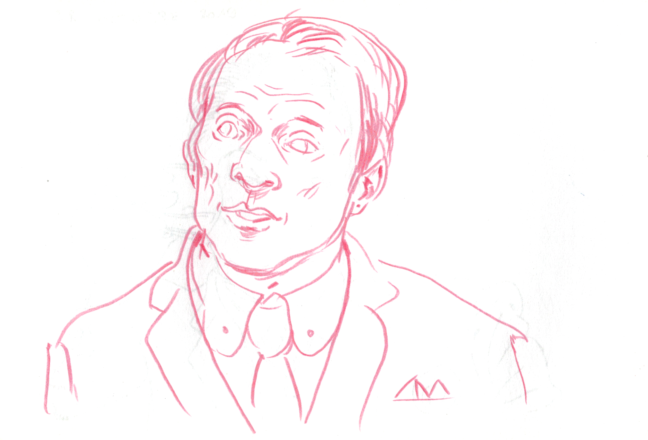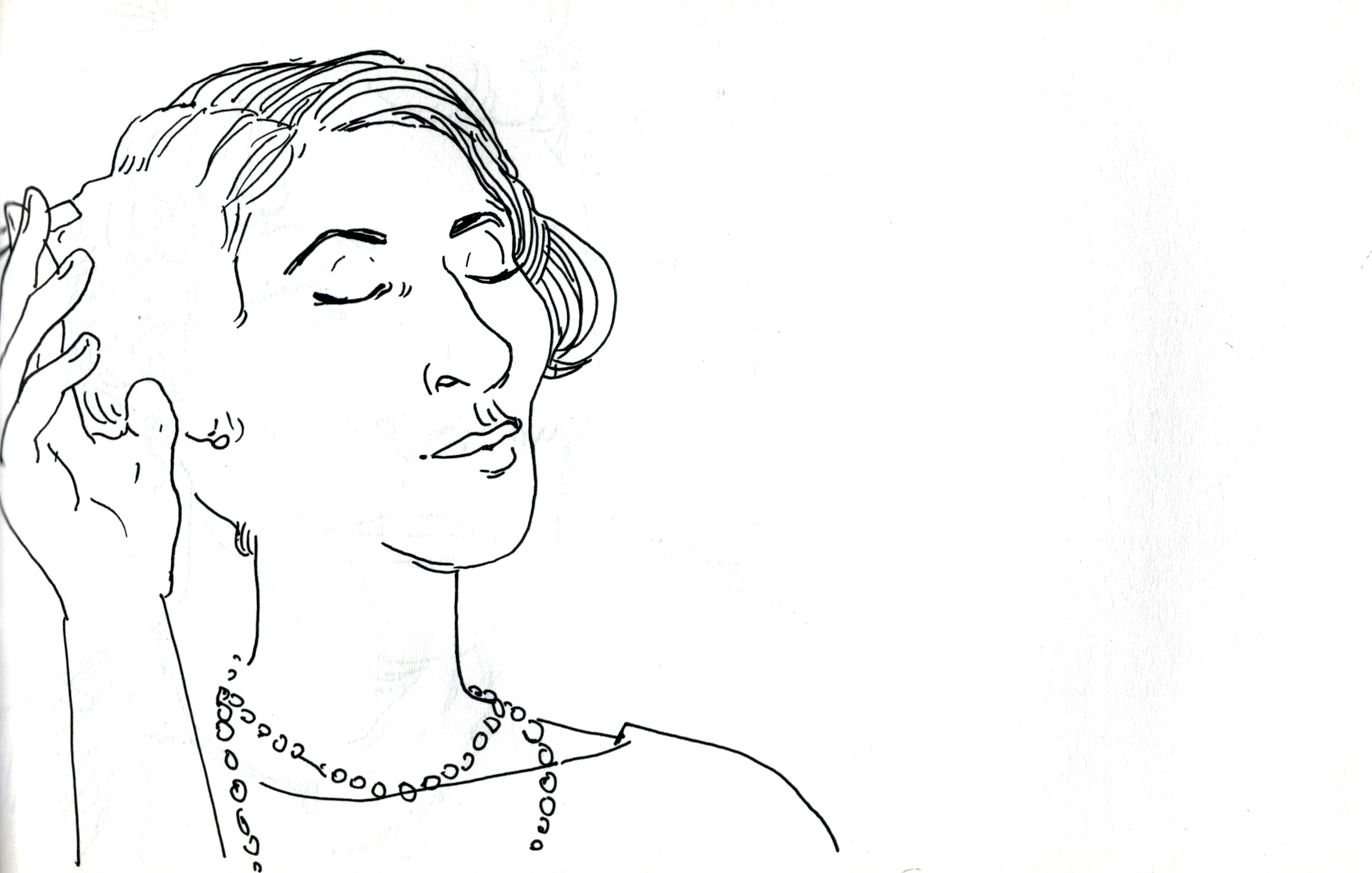 Pour ce carnet, un carnet acheté à New York par ma mère, j’avais hésité à faire cette fois une série de portraits en couleurs. Raté: le papier est très très basique, du papier machine quoi. Pour l’encre, l’aquarelle, voire les crayons de couleurs, on oublie, tout parait fadasse, quand le papier n’est pas carrément ruiné. Cela m’a laissé toute une gamme de possibilité: j’en avais un peu marre du stylo Muji 0,38mm alors j’ai mélangé les genres: stylo plume Lamy, crayon papier, stylo bille, Polychromos, Col-Erase, pour finir par une technique un peu aléatoire quand c’est raté, mais très satisfaisante quand c’est réussi, c’est-à-dire une bête plume Sergent Major avec de l’encre de Chine. On peut dire ce qu’on veut, le grattement de la plume sur le papier, et les effets de pleins et de déliés, ça fait toujours son petit effet…