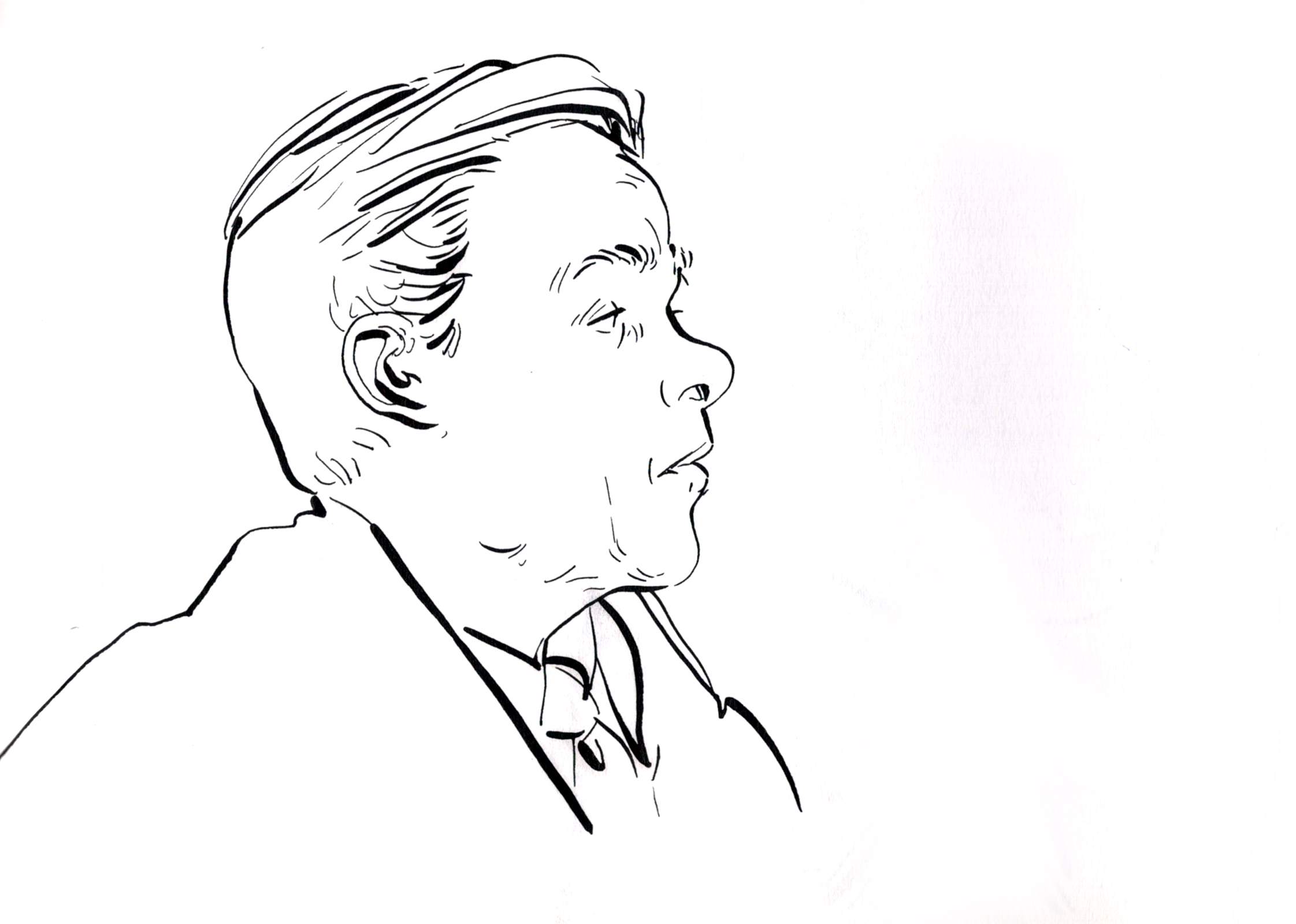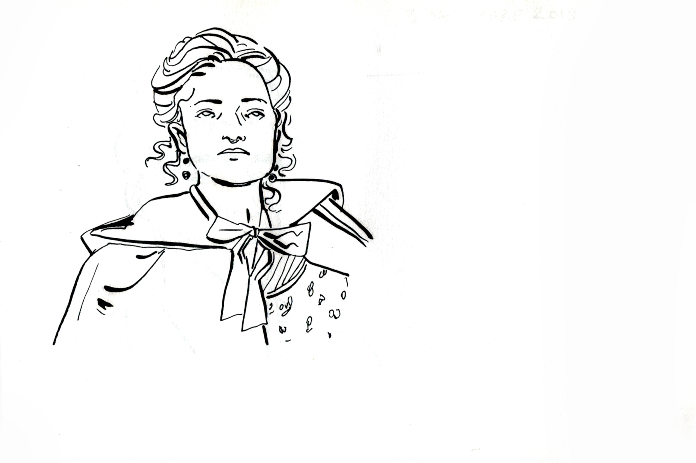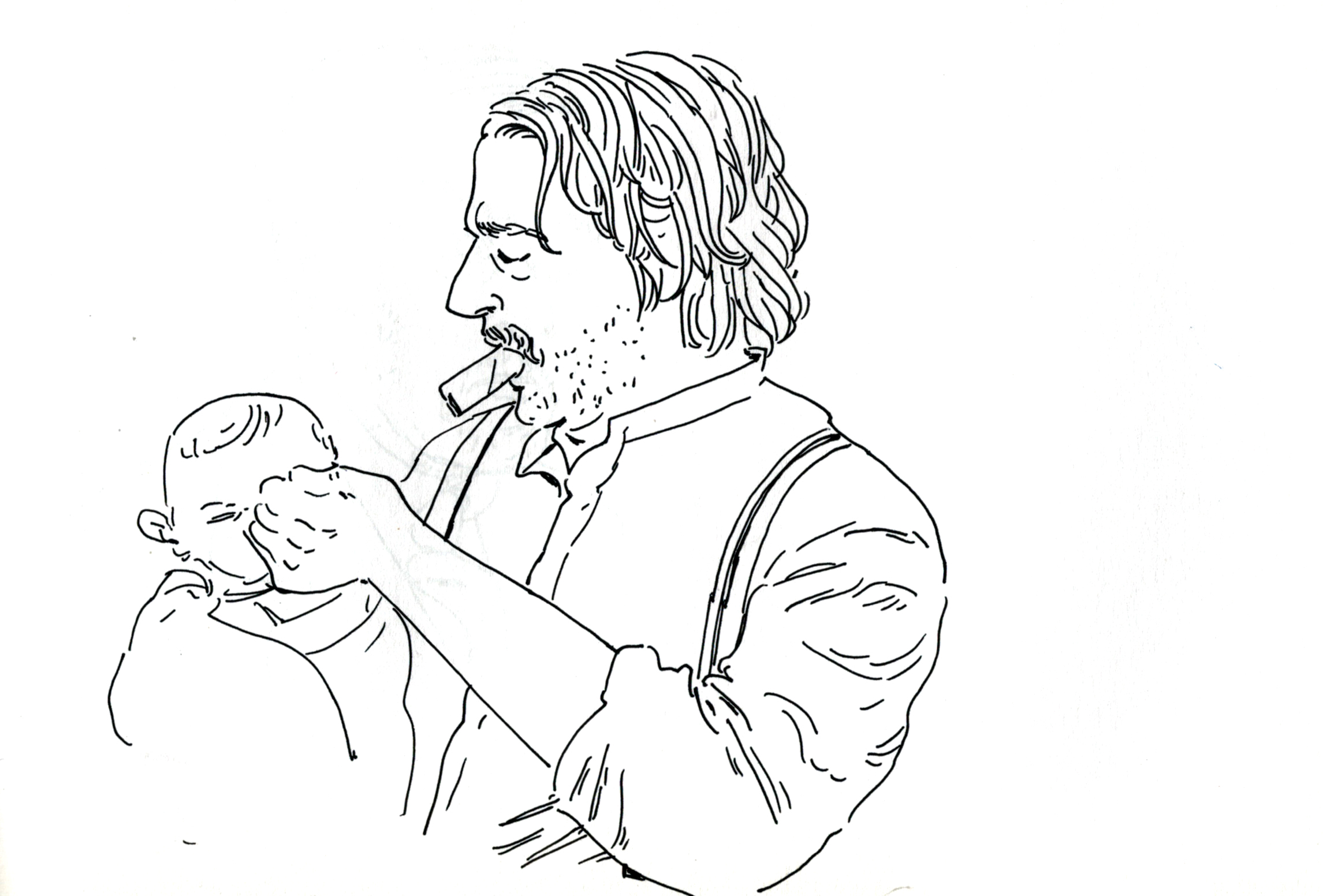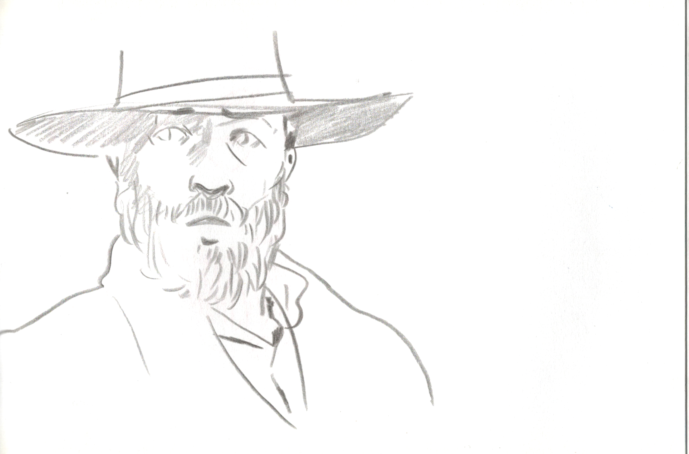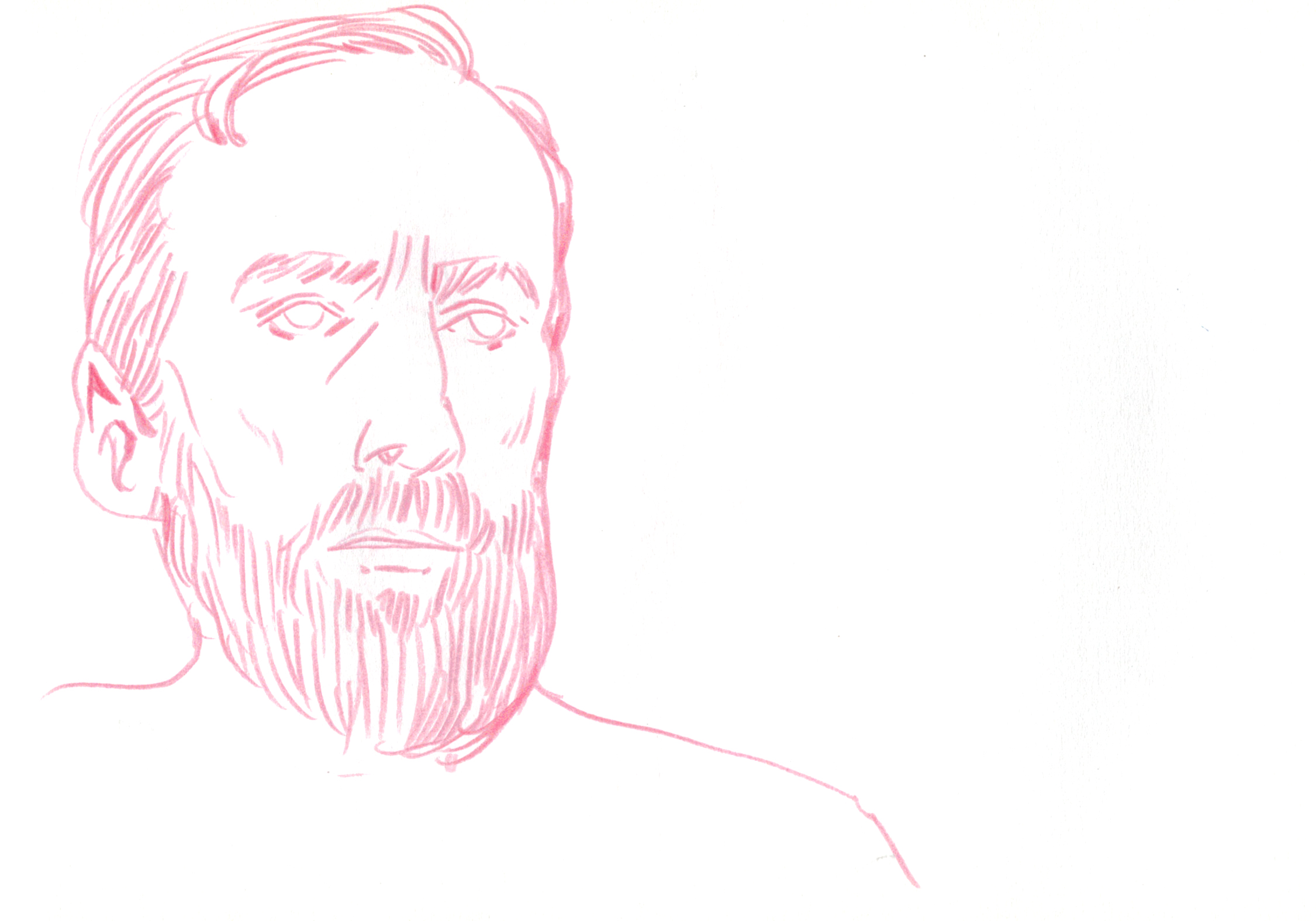 Pour ce carnet, un carnet acheté à New York par ma mère, j’avais hésité à faire cette fois une série de portraits en couleurs. Raté: le papier est très très basique, du papier machine quoi. Pour l’encre, l’aquarelle, voire les crayons de couleurs, on oublie, tout parait fadasse, quand le papier n’est pas carrément ruiné. Cela m’a laissé toute une gamme de possibilité: j’en avais un peu marre du stylo Muji 0,38mm alors j’ai mélangé les genres: stylo plume Lamy, crayon papier, stylo bille, Polychromos, Col-Erase, pour finir par une technique un peu aléatoire quand c’est raté, mais très satisfaisante quand c’est réussi, c’est-à-dire une bête plume Sergent Major avec de l’encre de Chine. On peut dire ce qu’on veut, le grattement de la plume sur le papier, et les effets de pleins et de déliés, ça fait toujours son petit effet…