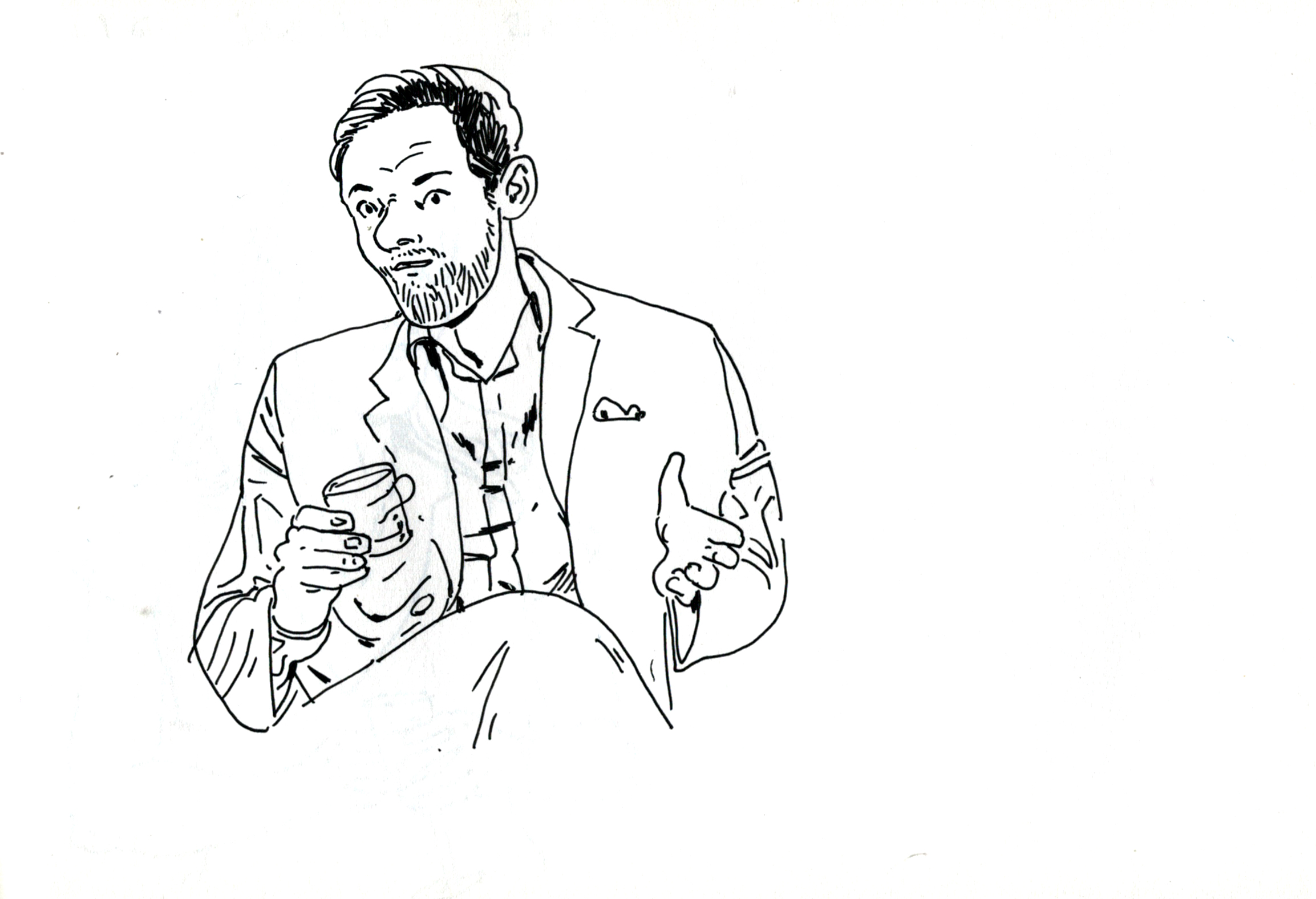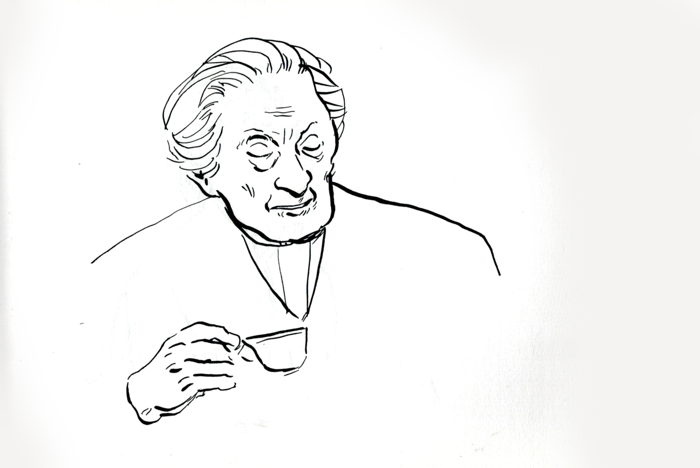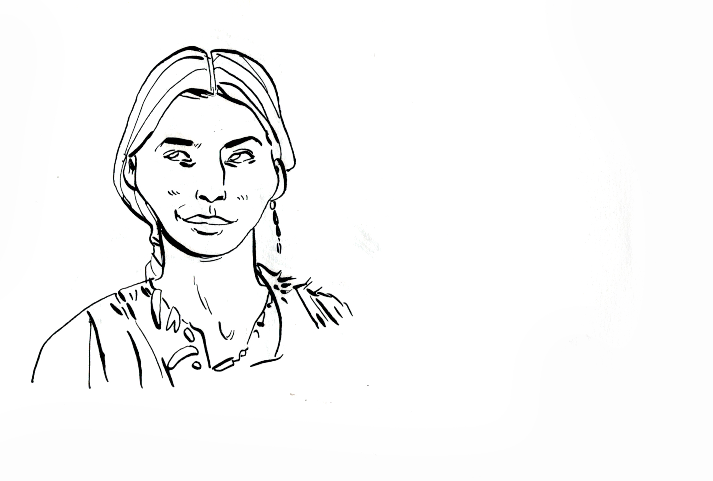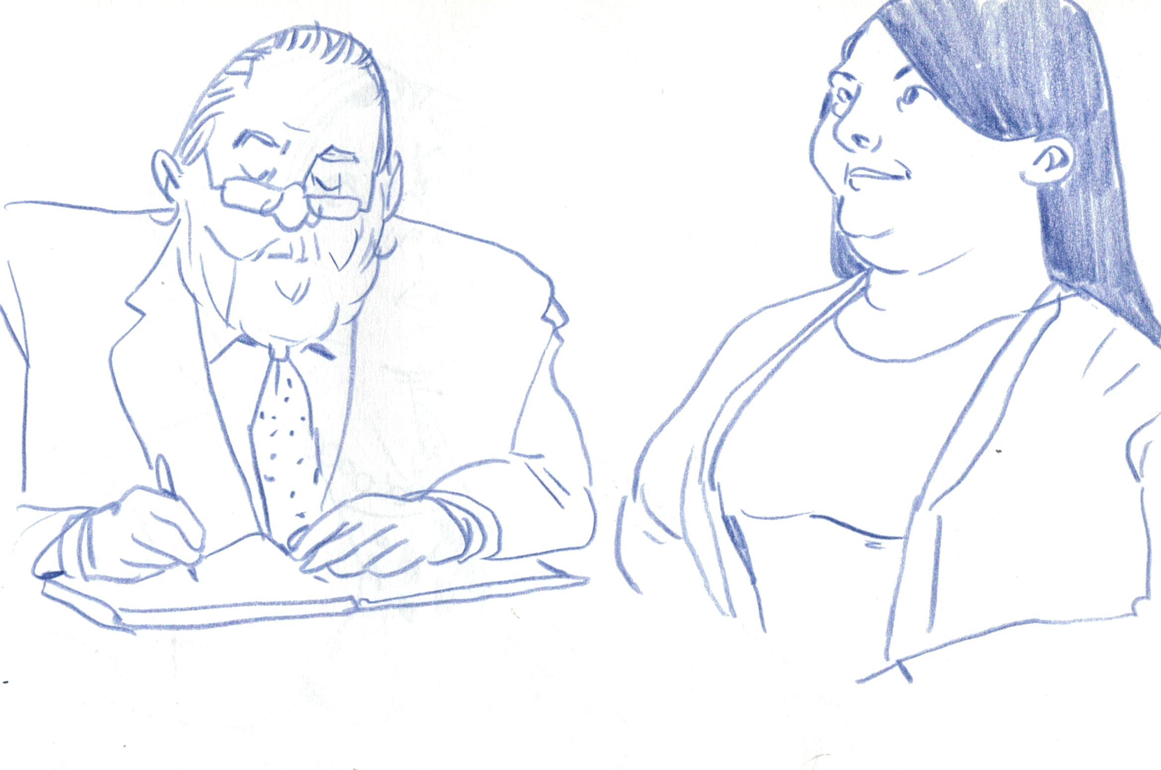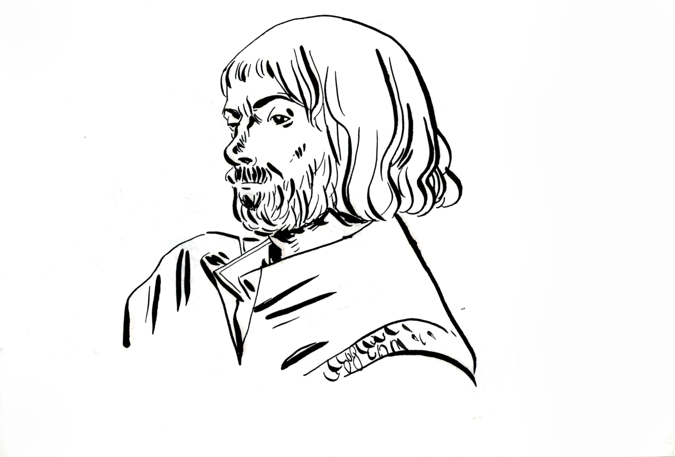Pour ce carnet, un carnet acheté à New York par ma mère, j’avais hésité à faire cette fois une série de portraits en couleurs. Raté: le papier est très très basique, du papier machine quoi. Pour l’encre, l’aquarelle, voire les crayons de couleurs, on oublie, tout parait fadasse, quand le papier n’est pas carrément ruiné. Cela m’a laissé toute une gamme de possibilité: j’en avais un peu marre du stylo Muji 0,38mm alors j’ai mélangé les genres: stylo plume Lamy, crayon papier, stylo bille, Polychromos, Col-Erase, pour finir par une technique un peu aléatoire quand c’est raté, mais très satisfaisante quand c’est réussi, c’est-à-dire une bête plume Sergent Major avec de l’encre de Chine. On peut dire ce qu’on veut, le grattement de la plume sur le papier, et les effets de pleins et de déliés, ça fait toujours son petit effet…