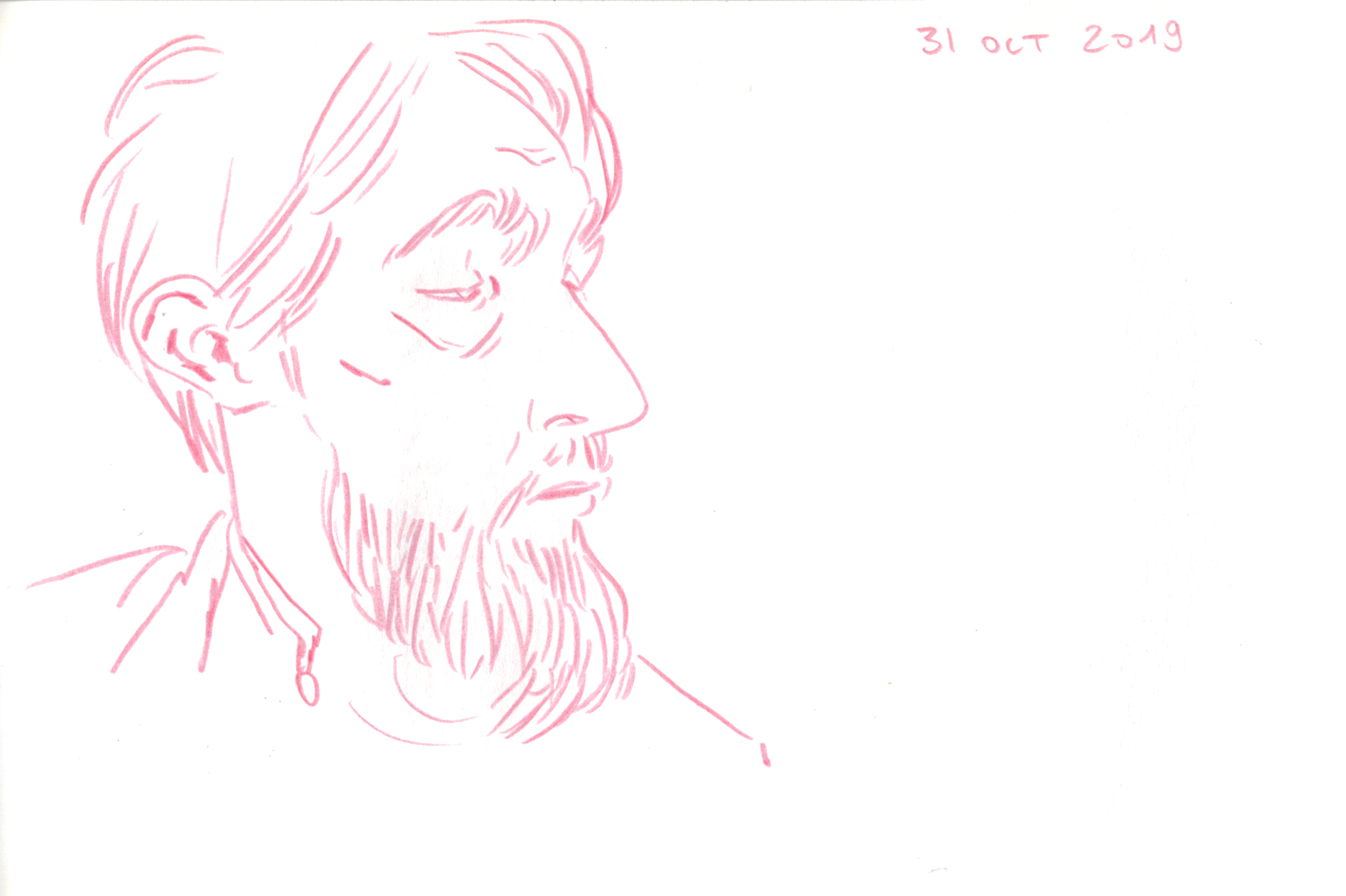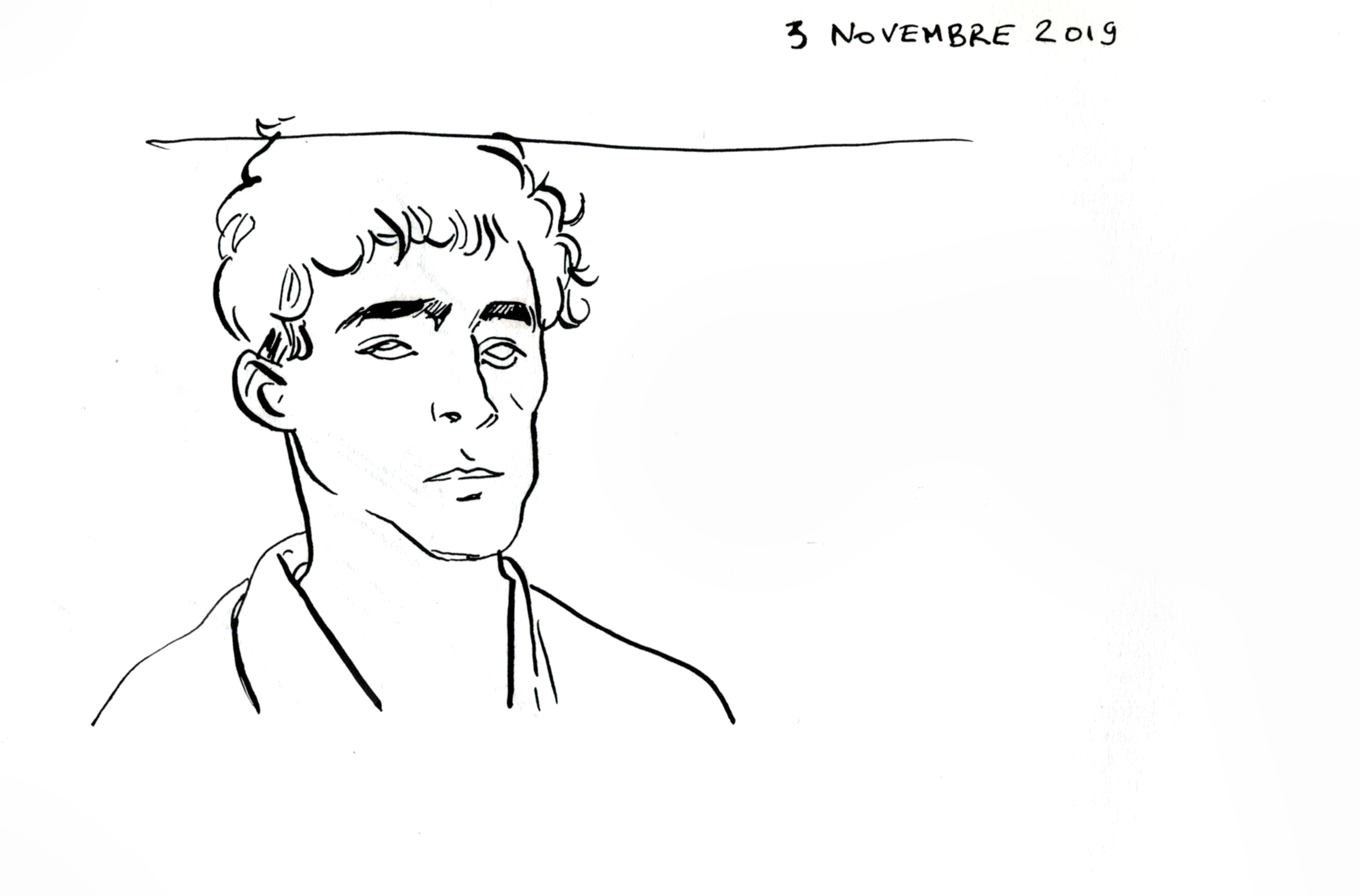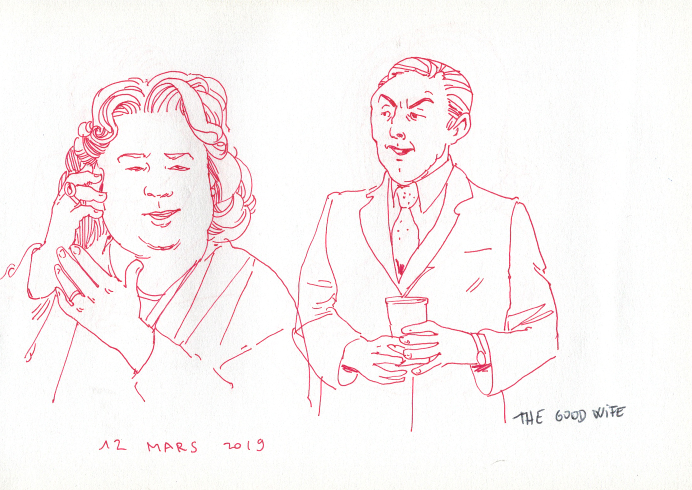 Encore un autre carnet de portraits, après le premier déjà présenté sur ce blog. Même principe: on met « pause » pendant une série (ici sur Netflix, mais n’importe quel flux vidéo, Youtube, replay ou plateforme de VOD fera l’affaire) et on crobarde pendant 10 minutes. Bon, je ne minute pas vraiment, mais l’idée y est. Le tout, c’est de s’échauffer. Cette fois je me suis carrément permis d’en dessiner pas forcément tous les jours, mais par paquets de 3 ou 4. Comme d’habitude, je me dis que beaucoup de portraits seraient davantage réussis si j’y passais plus de temps, ou du moins, ils seraient rattrapés: en ne me concentrant que sur les lignes principales j’enlève des informations, de détails, d’accessoires, de lumière, de volume, etc.